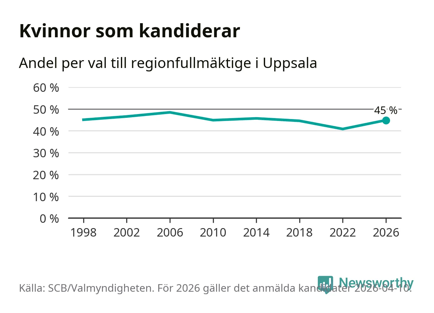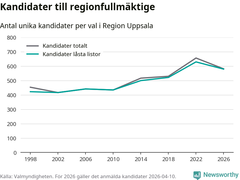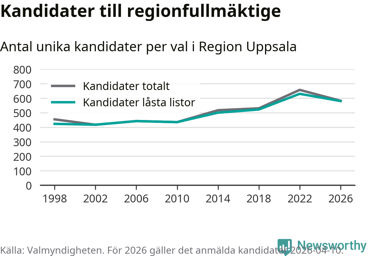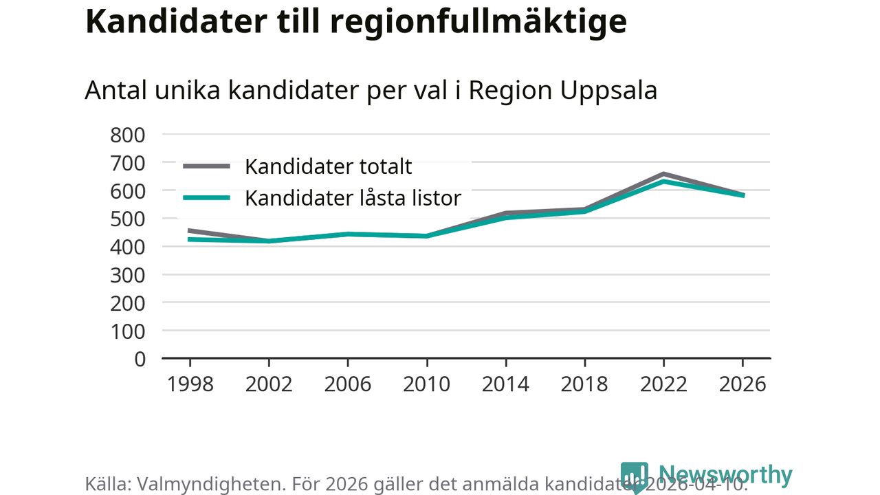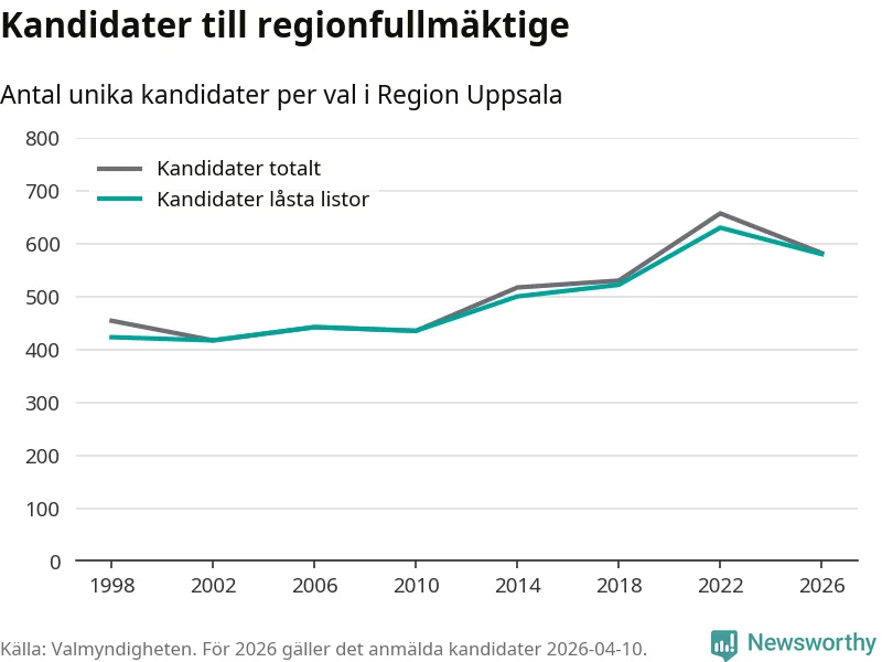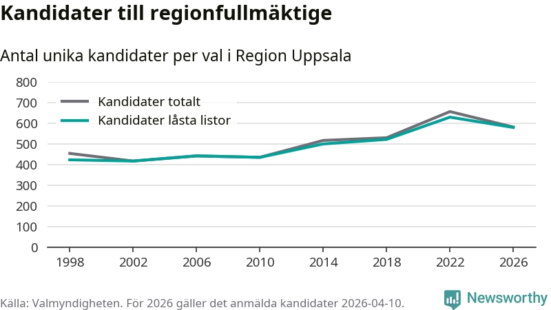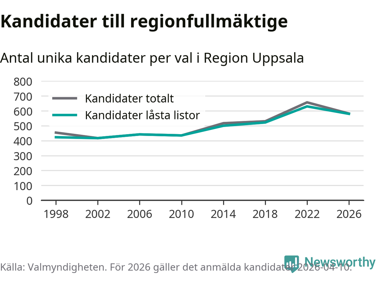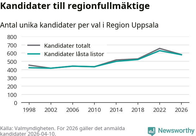 På torsdagen var det deadline för partier med låsta listor att registrera sina kandidater inför höstens val. Till valet till regionfullmäktige i Region Uppsala är 580 kandidater anmälda på sådana listor, vilket är 50 färre än i valet 2022.