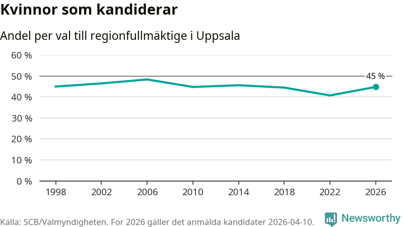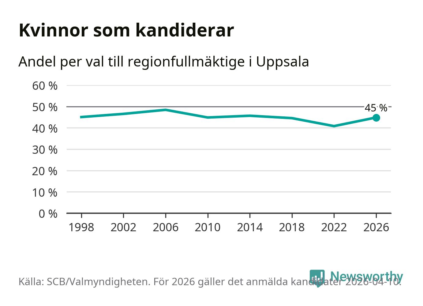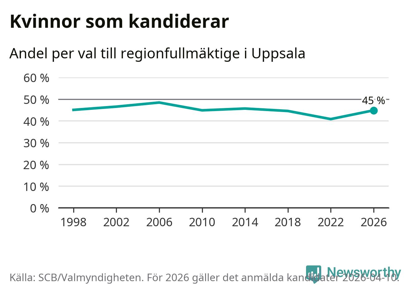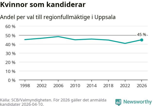 Kvinnorna utgör 45 procent av de hittills anmälda kandidaterna, vilket är den högsta andelen på listorna till regionfullmäktige i Region Uppsala sedan valet 2014. Vid valet 2006 var 48 procent kvinnor, valet 2022 var motsvarande siffra 41 procent. Uppsala län är en av 20 regioner i landet där männen utgör en majoritet av kandidaterna på listorna.