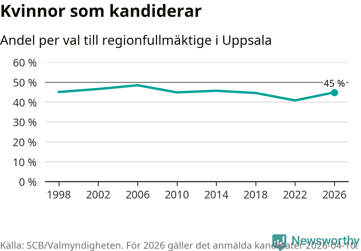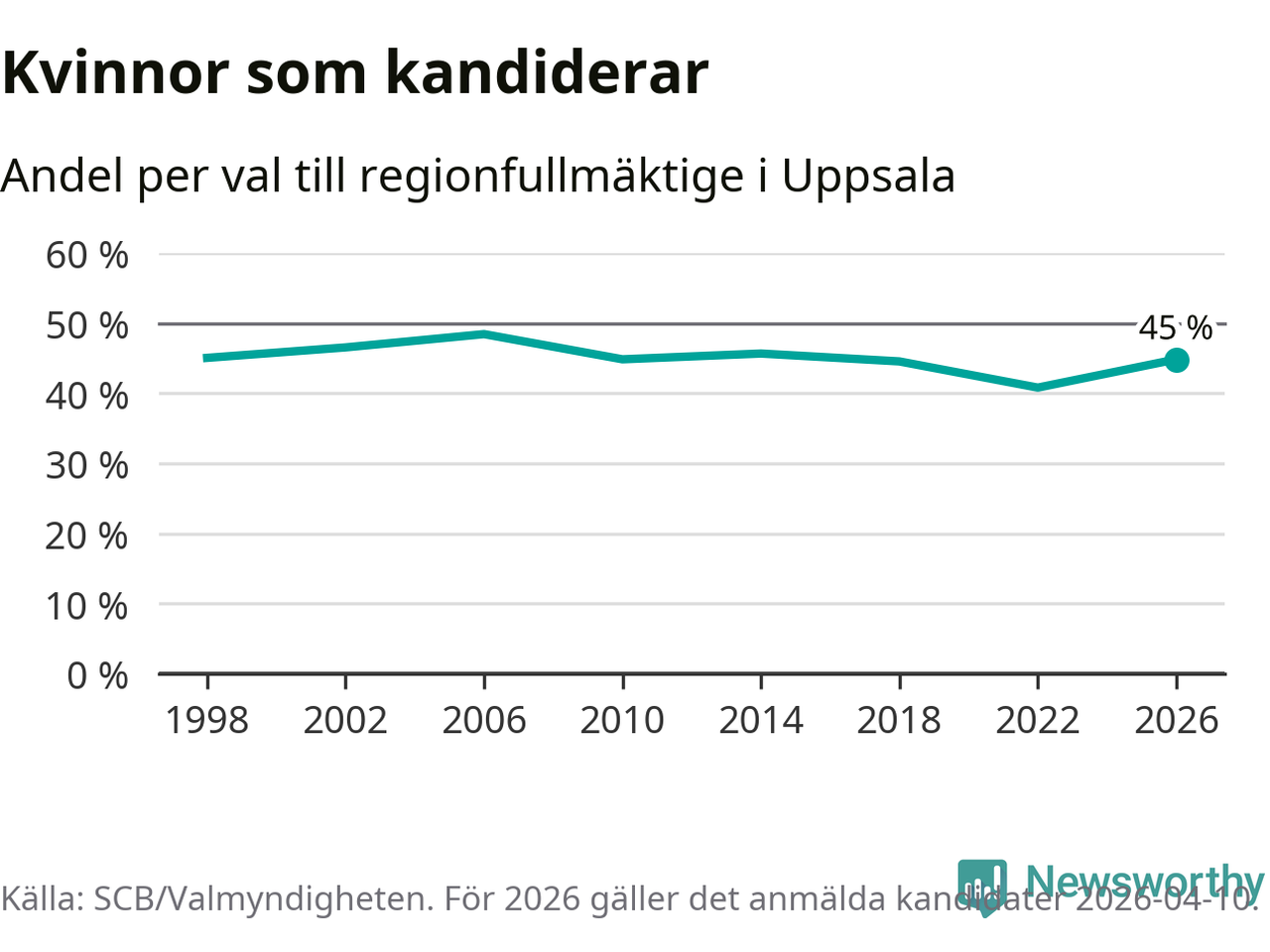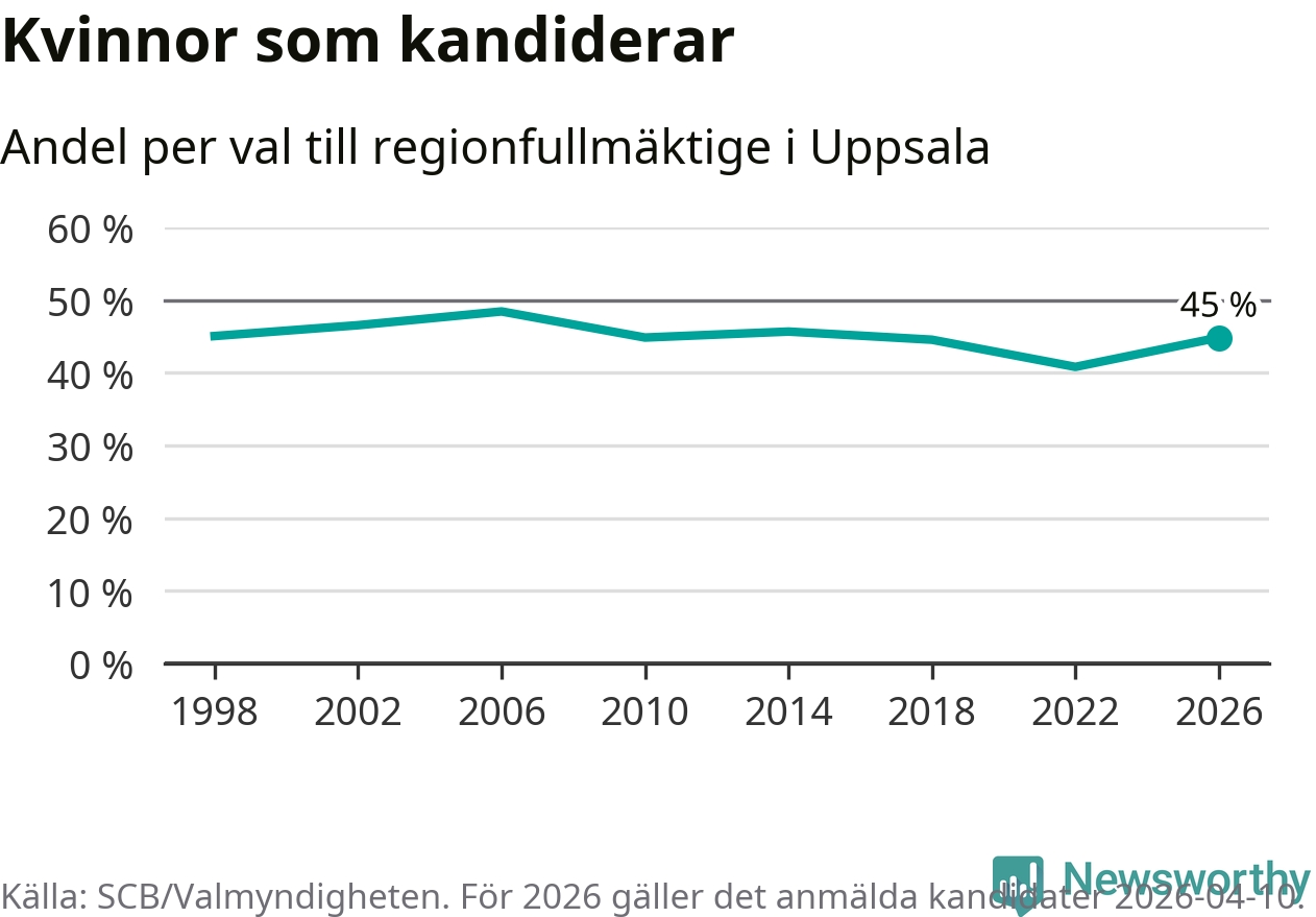 Kvinnorna utgör 45 procent av de hittills anmälda kandidaterna, vilket är den högsta andelen på listorna till regionfullmäktige i Region Uppsala sedan valet 2014. Vid valet 2006 var 48 procent kvinnor, valet 2022 var motsvarande siffra 41 procent. Uppsala län är en av 20 regioner i landet där männen utgör en majoritet av kandidaterna på listorna.