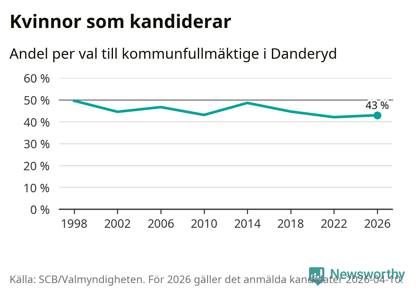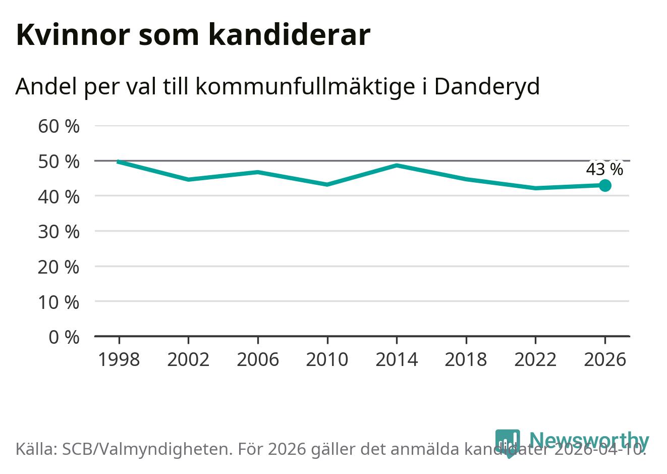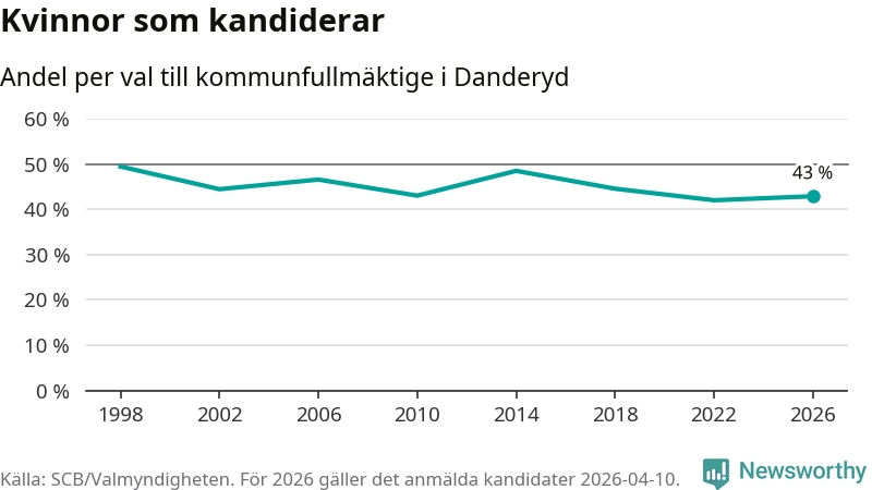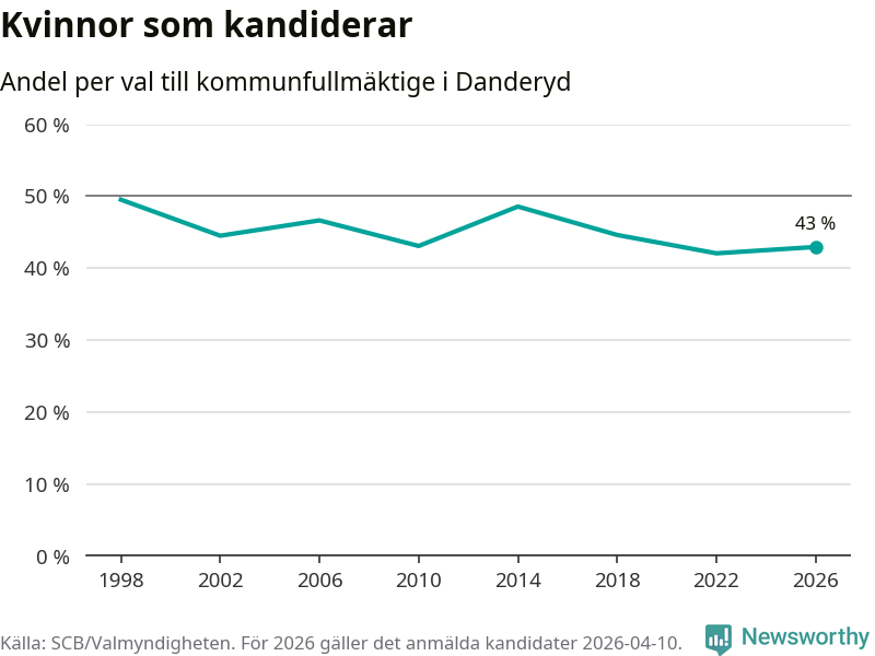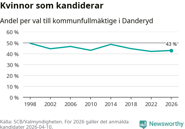 Kvinnorna utgör 43 procent av de hittills anmälda kandidaterna. Vid valet 1998 var 50 procent kvinnor, valet 2022 var motsvarande siffra 42 procent. Danderyd är en av 264 kommuner i landet där männen utgör en majoritet av kandidaterna på listorna.