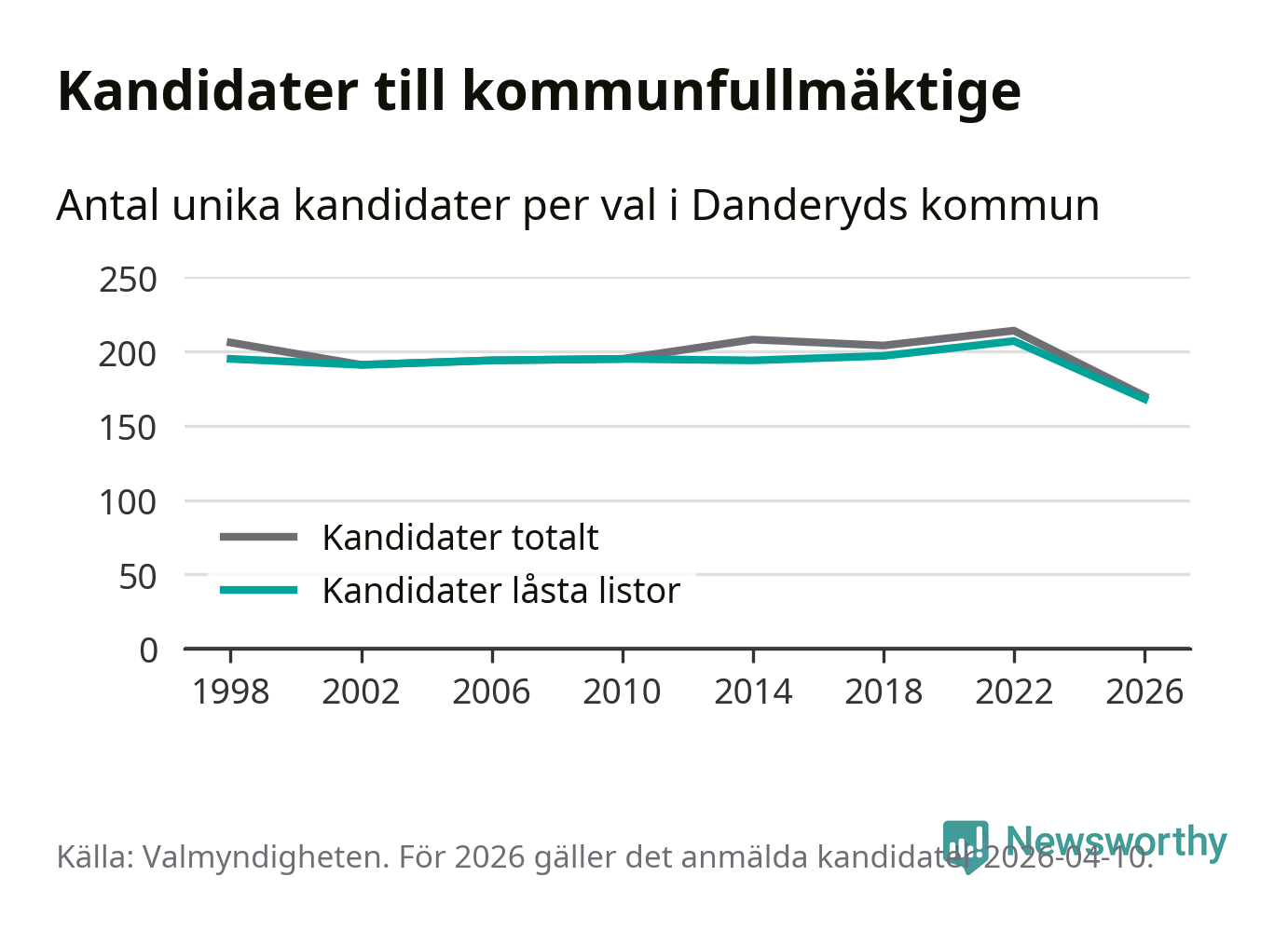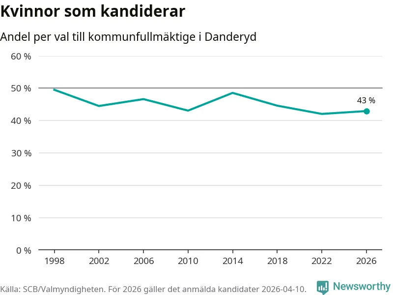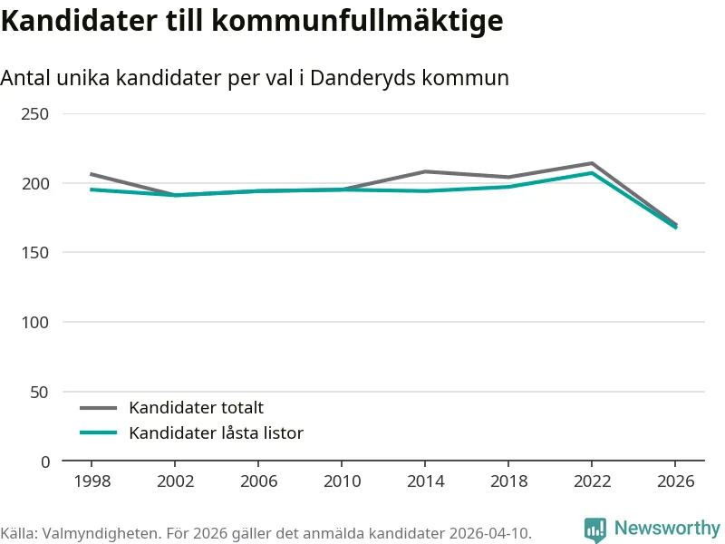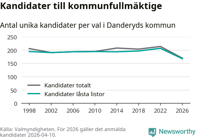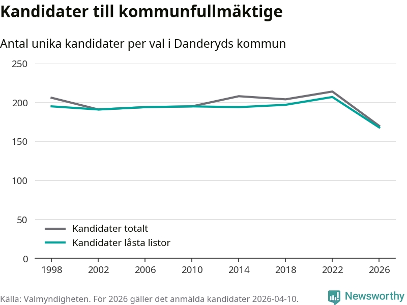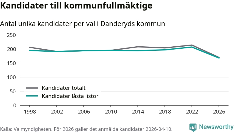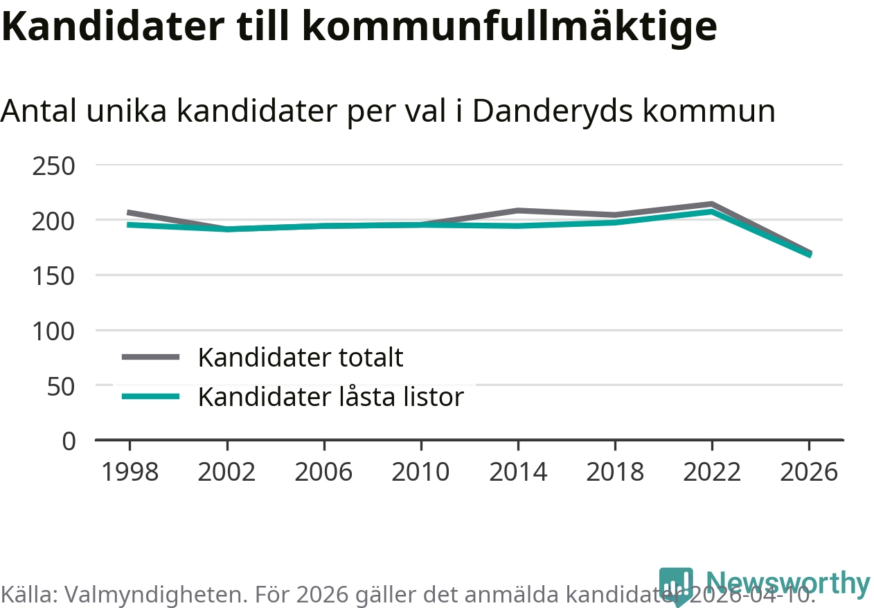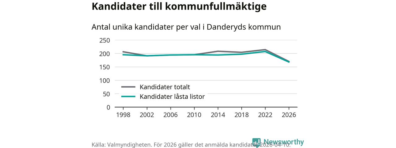 På torsdagen var det deadline för partier med låsta listor att registrera sina kandidater inför höstens val. Till valet till kommunfullmäktige i Danderyd är 168 kandidater anmälda på sådana listor, vilket är 39 färre än i valet 2022. Det är den lägsta siffran sedan åtminstone valet 1998, vilket är så långt tillbaka som vi har statistik för.