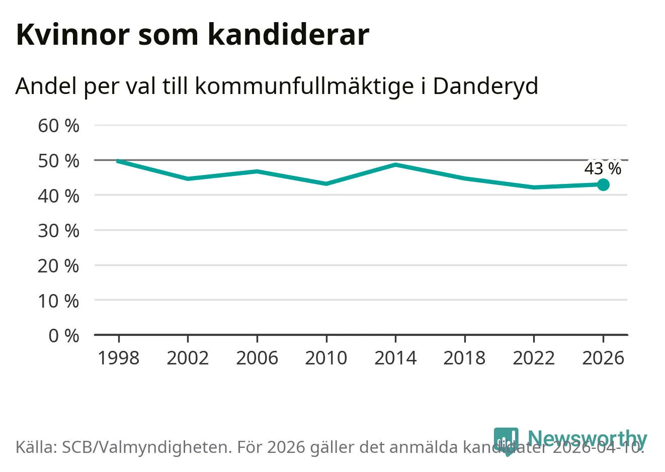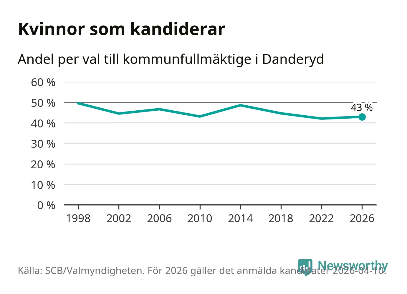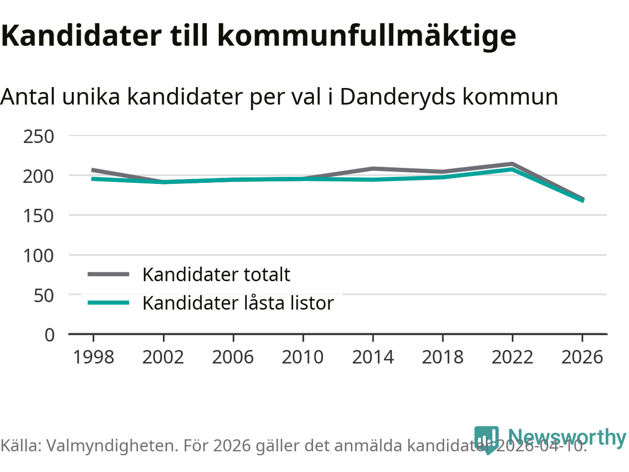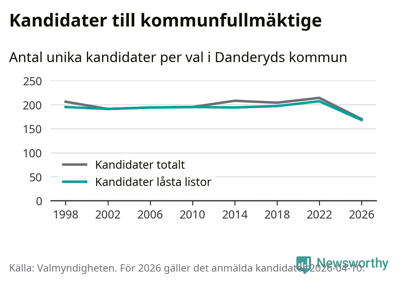 På torsdagen var det deadline för partier med låsta listor att registrera sina kandidater inför höstens val. Till valet till kommunfullmäktige i Danderyd är 168 kandidater anmälda på sådana listor, vilket är 39 färre än i valet 2022. Det är den lägsta siffran sedan åtminstone valet 1998, vilket är så långt tillbaka som vi har statistik för.