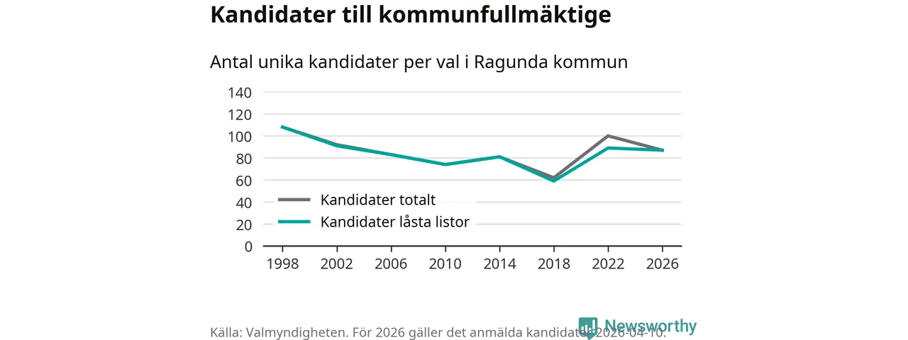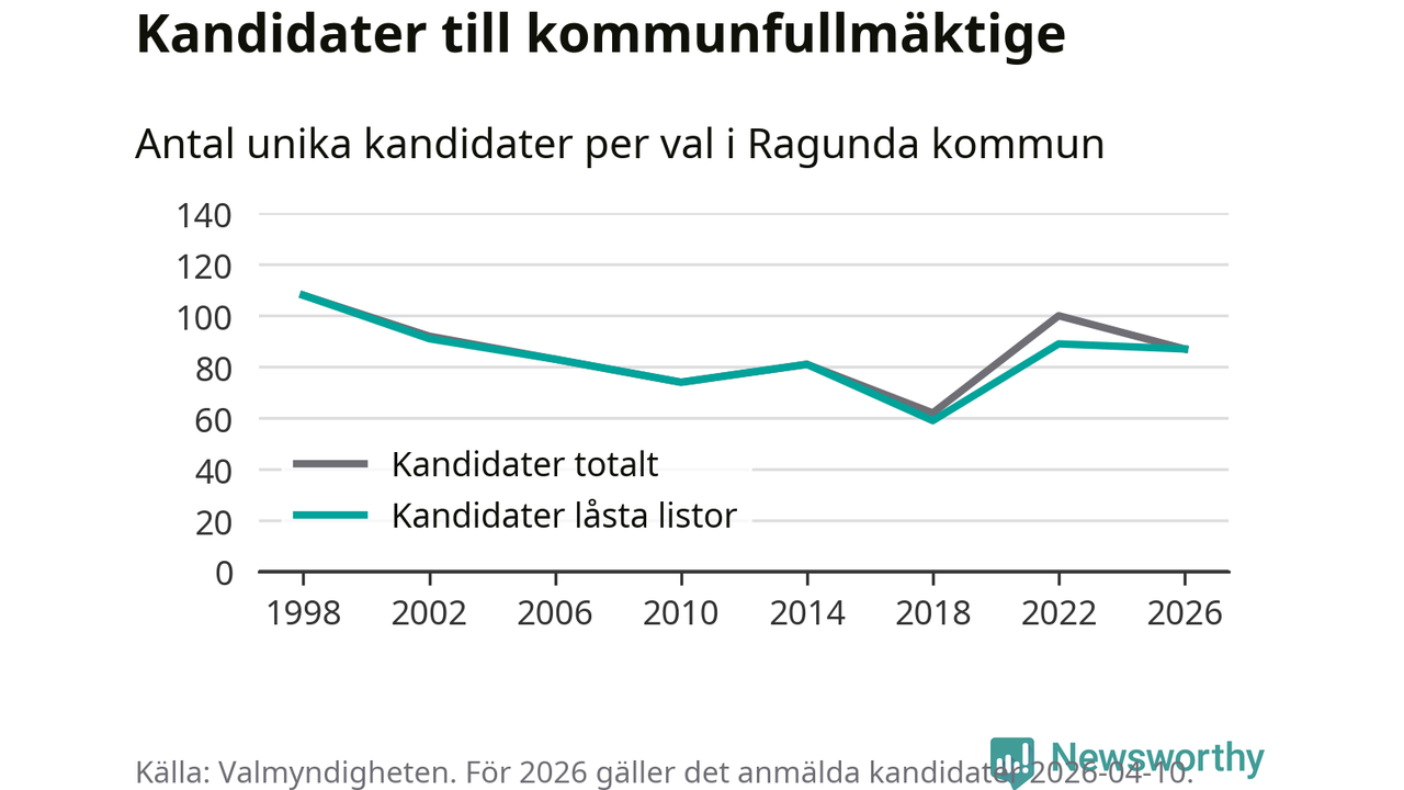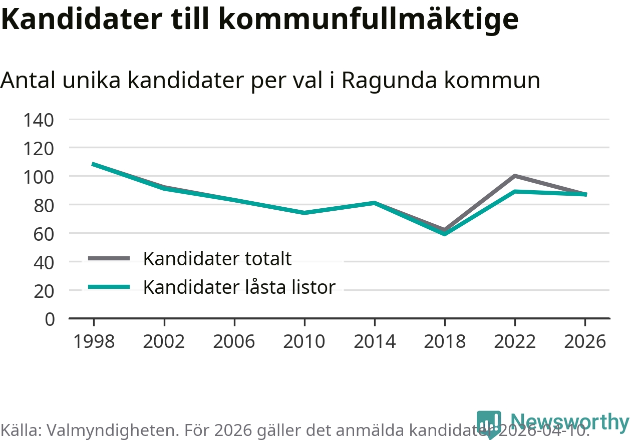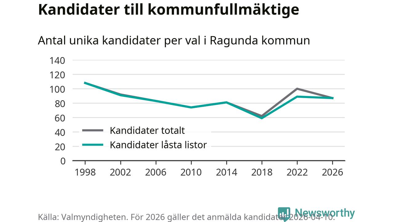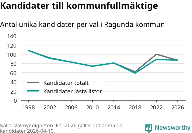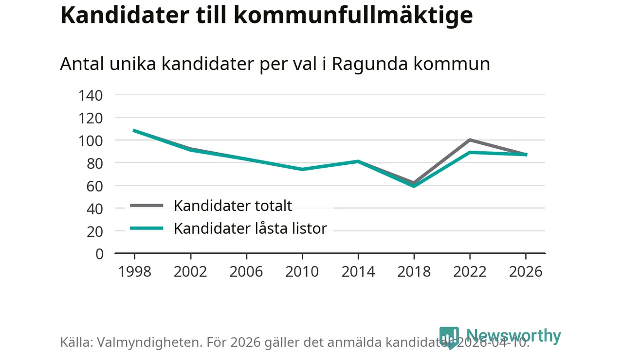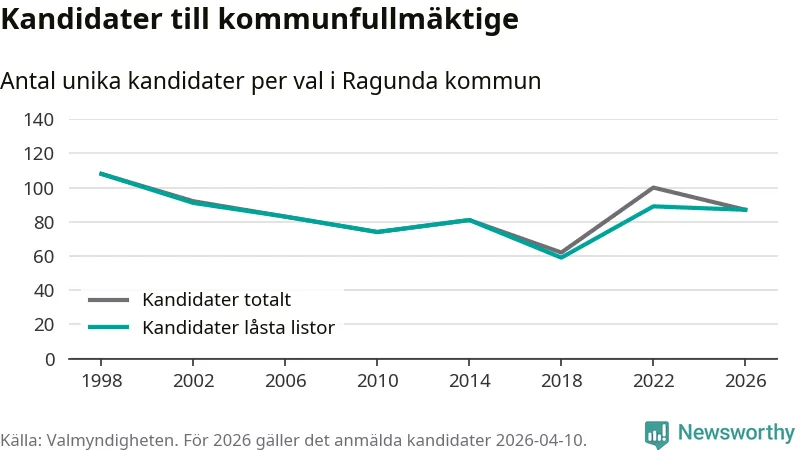 På torsdagen var det deadline för partier med låsta listor att registrera sina kandidater inför höstens val. Till valet till kommunfullmäktige i Ragunda är 87 kandidater anmälda på sådana listor, vilket är två färre än i valet 2022.