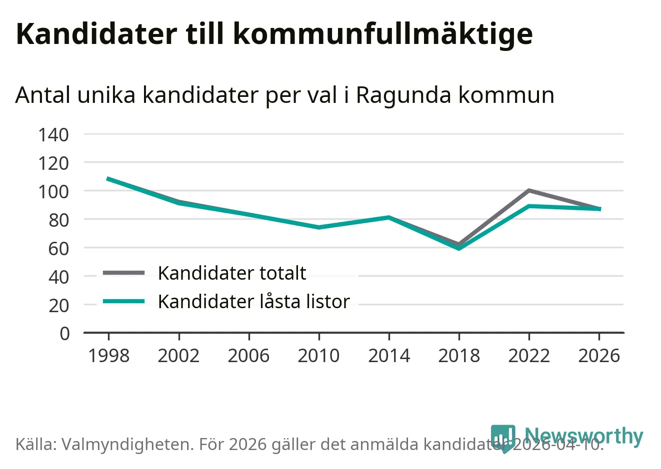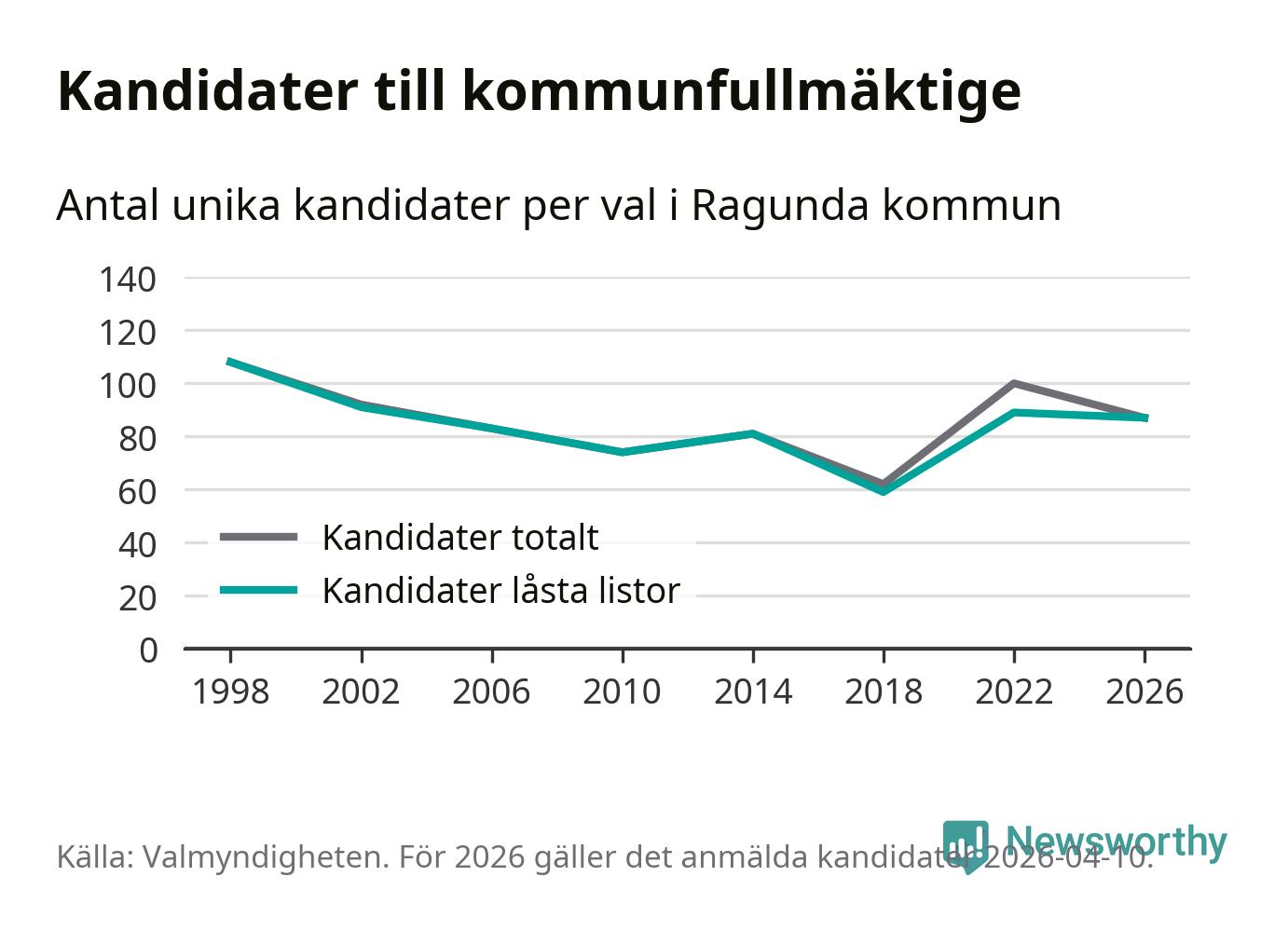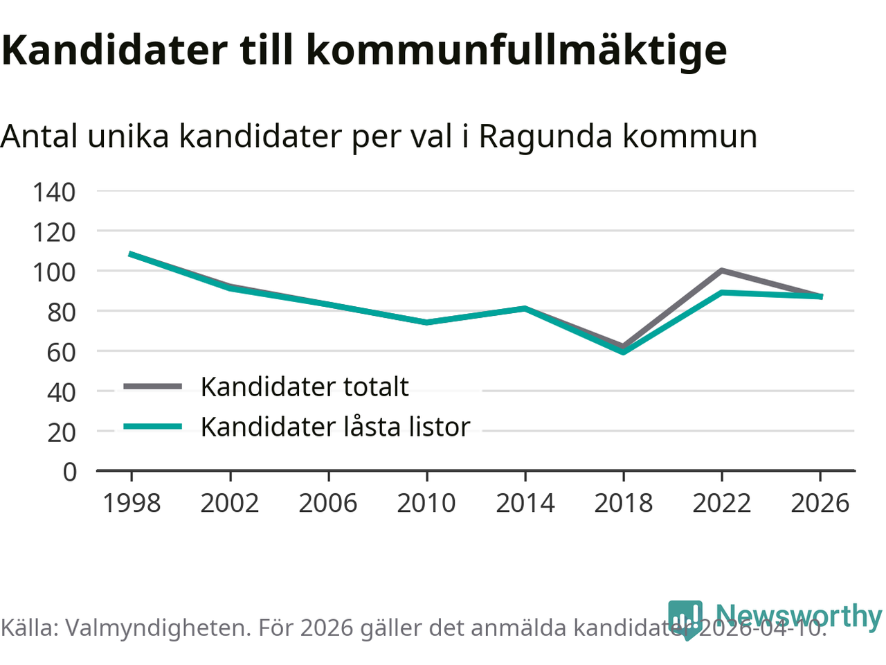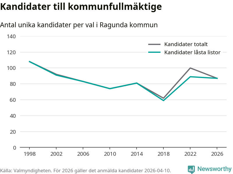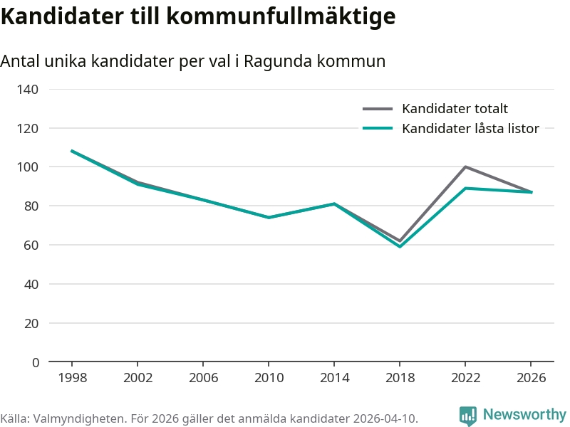 På torsdagen var det deadline för partier med låsta listor att registrera sina kandidater inför höstens val. Till valet till kommunfullmäktige i Ragunda är 87 kandidater anmälda på sådana listor, vilket är två färre än i valet 2022.