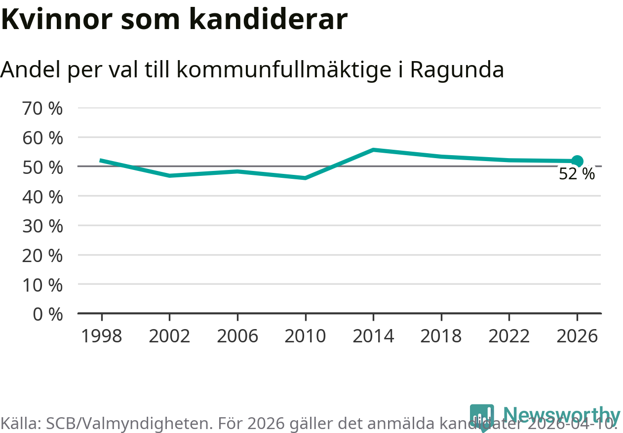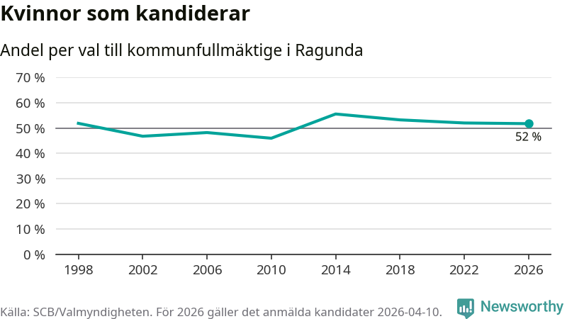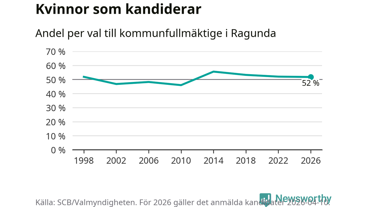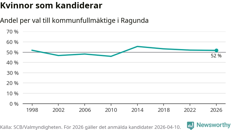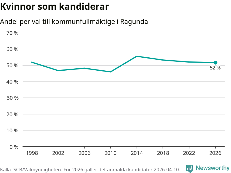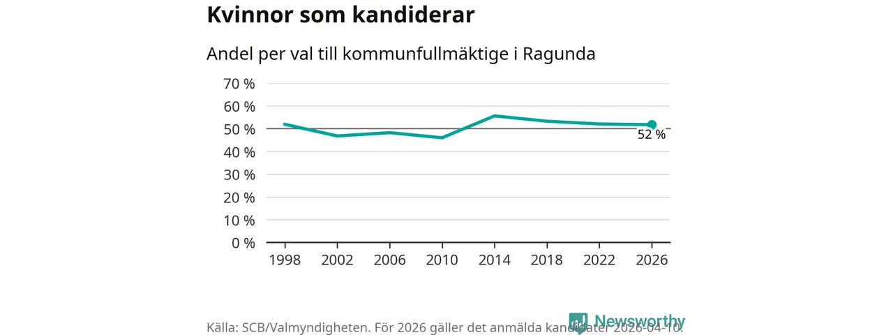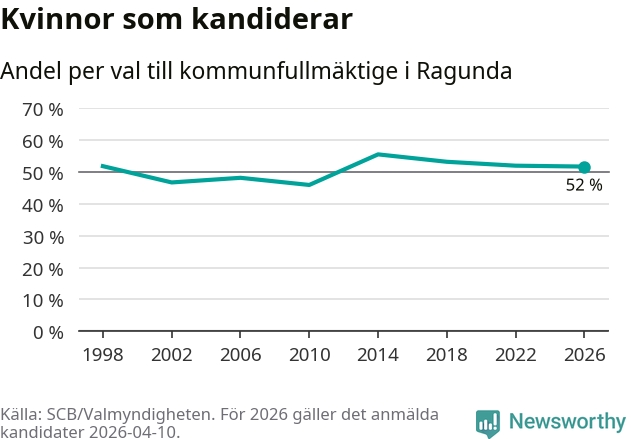 Kvinnorna utgör 52 procent av de hittills anmälda kandidaterna, vilket är den lägsta andelen på listorna till kommunfullmäktige i Ragunda sedan valet 2010. Andelen kvinnor har minskat i Ragunda under de senaste två valen och minskningen ser alltså ut att forsätta i år. Ragunda är en av 26 kommuner i landet där kvinnorna utgör hälften eller mer av kandidaterna på listorna.