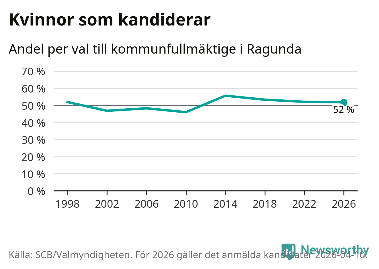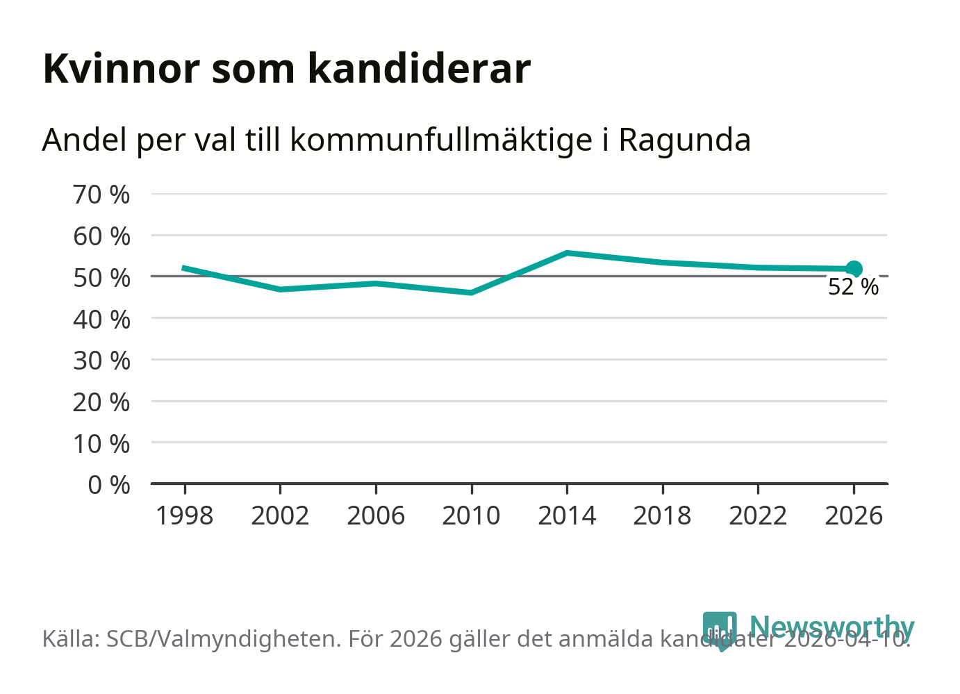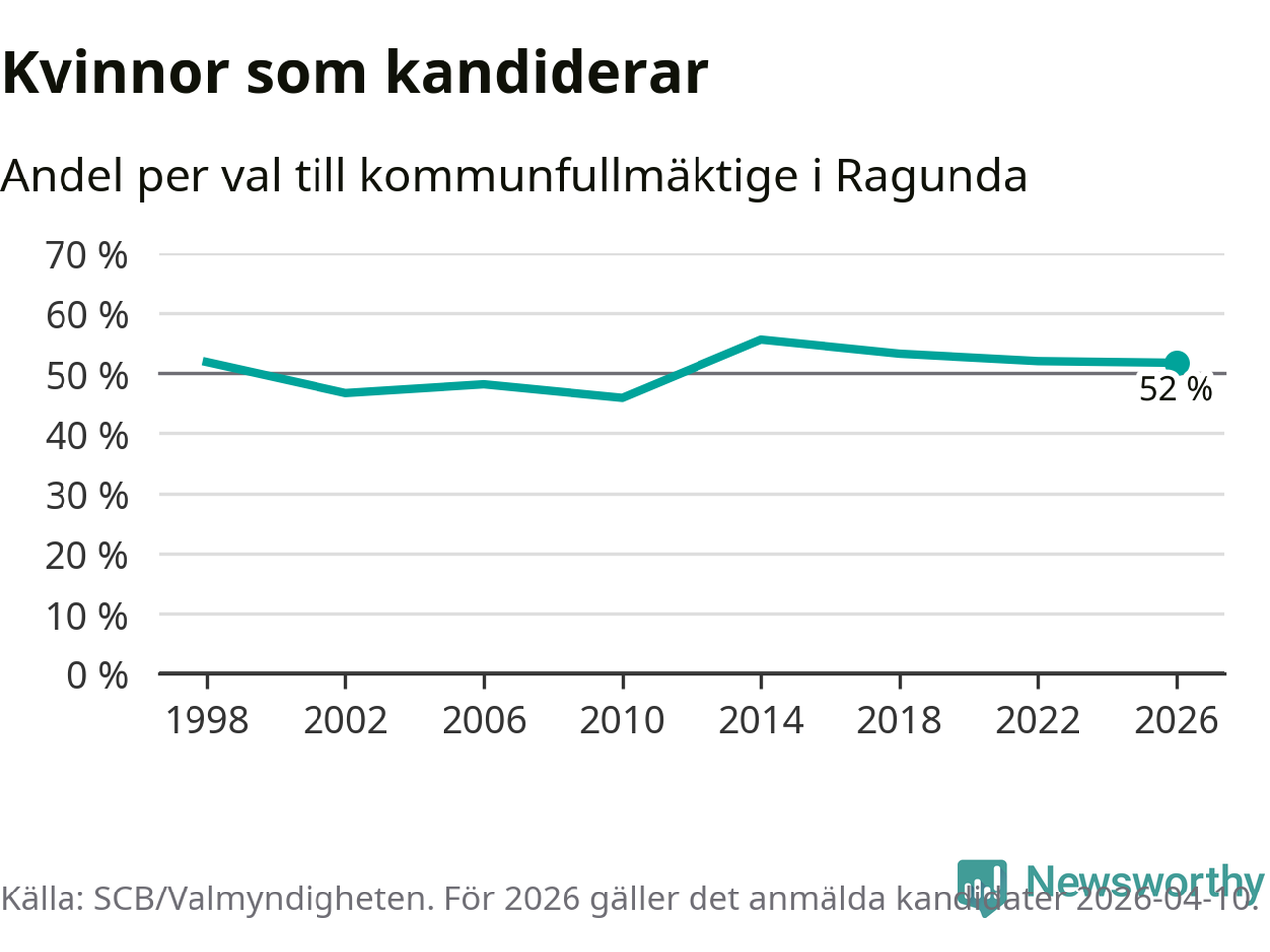Kvinnorna utgör 52 procent av de hittills anmälda kandidaterna, vilket är den lägsta andelen på listorna till kommunfullmäktige i Ragunda sedan valet 2010. Andelen kvinnor har minskat i Ragunda under de senaste två valen och minskningen ser alltså ut att forsätta i år. Ragunda är en av 26 kommuner i landet där kvinnorna utgör hälften eller mer av kandidaterna på listorna.