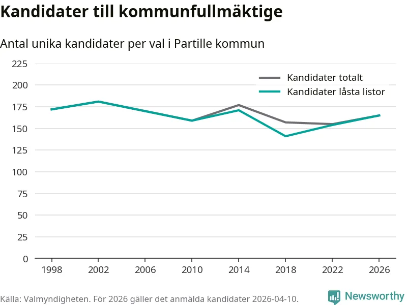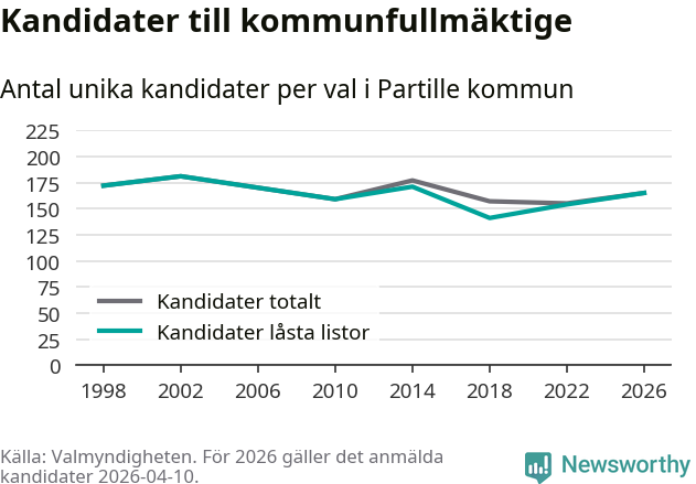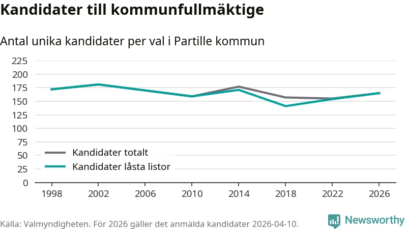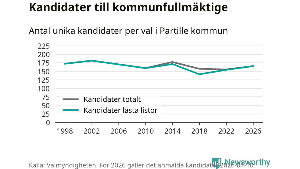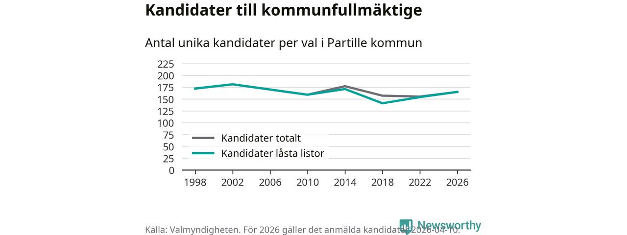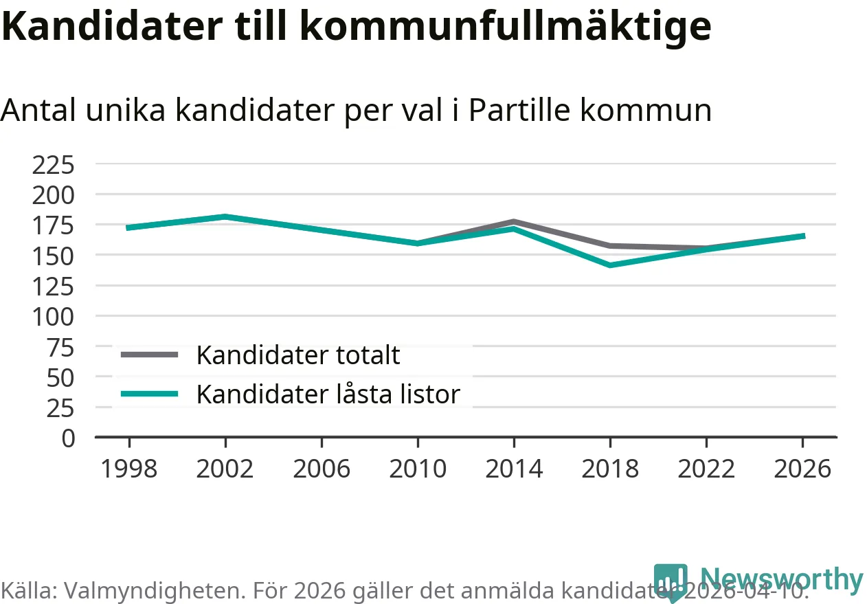 På torsdagen var det deadline för partier med låsta listor att registrera sina kandidater inför höstens val. Till valet till kommunfullmäktige i Partille är 165 kandidater anmälda på sådana listor, vilket är elva fler än i valet 2022.