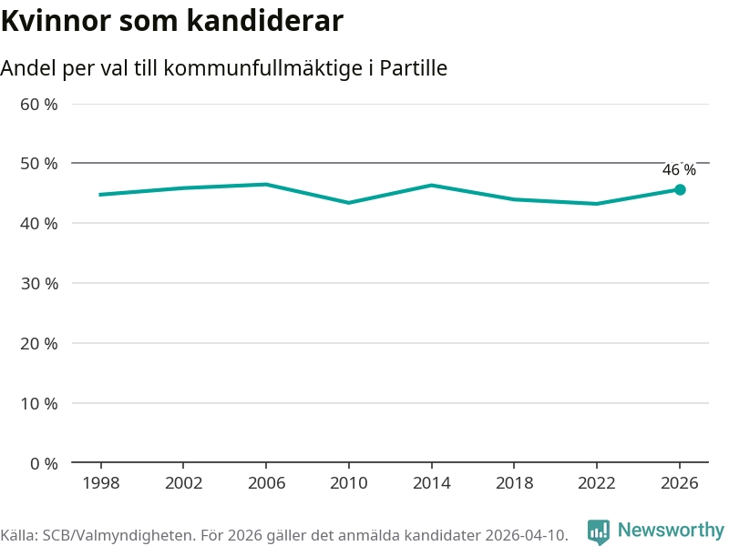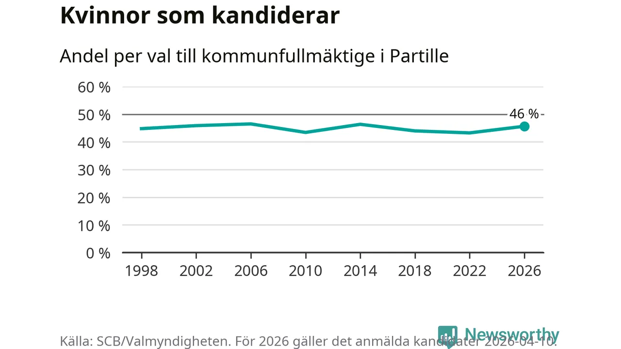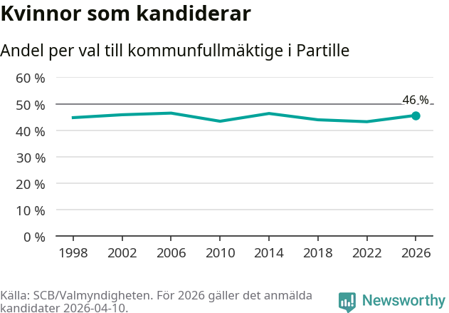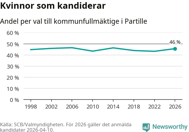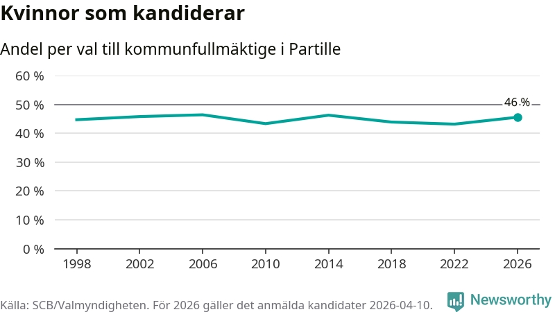 Kvinnorna utgör 46 procent av de hittills anmälda kandidaterna, vilket är den högsta andelen på listorna till kommunfullmäktige i Partille sedan valet 2014. Vid valet 2006 var 46 procent kvinnor, valet 2022 var motsvarande siffra 43 procent. Partille är en av 264 kommuner i landet där männen utgör en majoritet av kandidaterna på listorna.