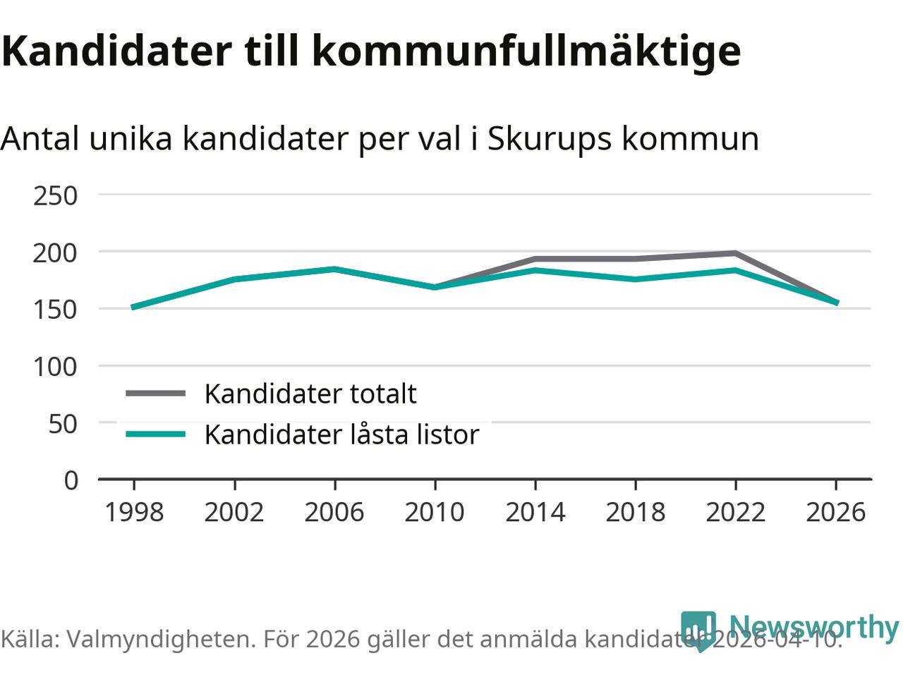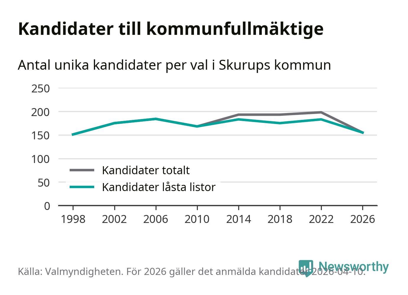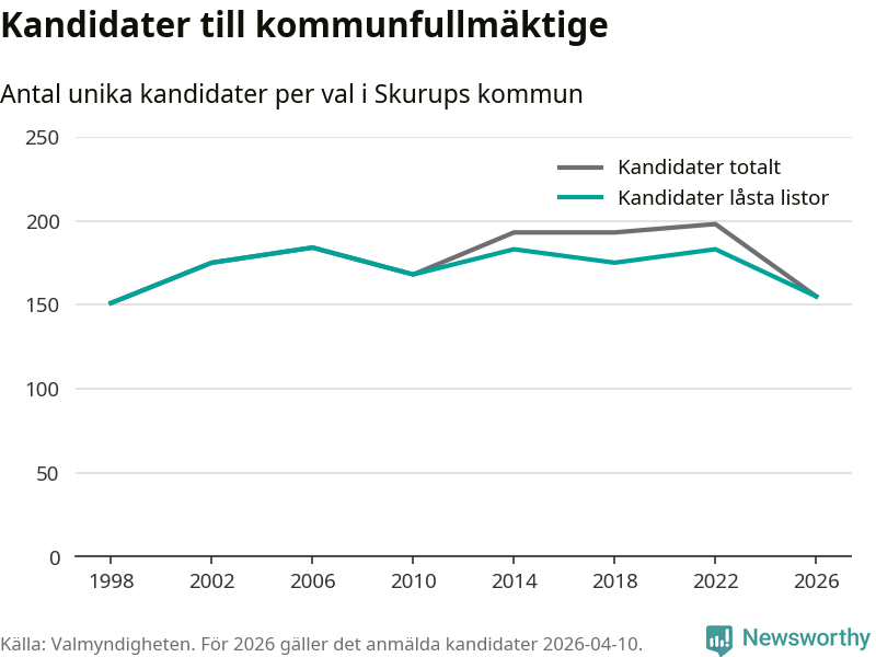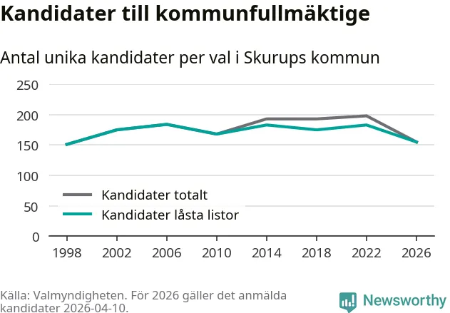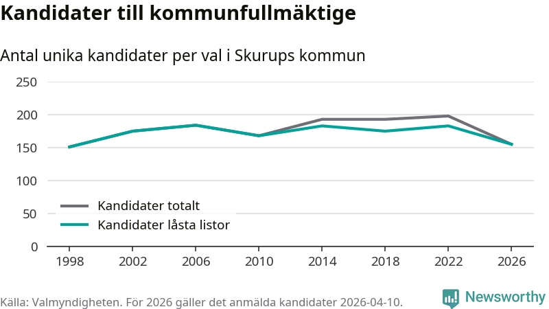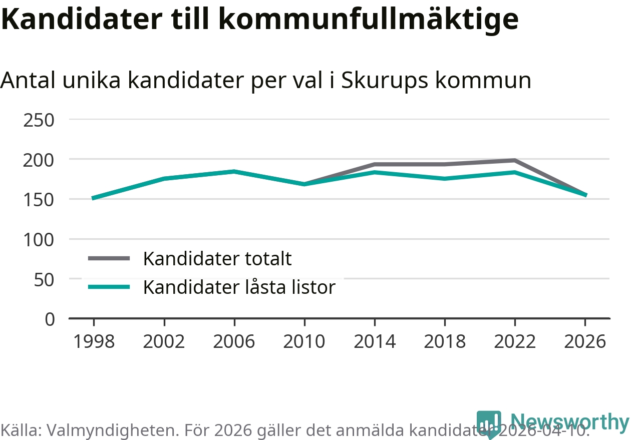 På torsdagen var det deadline för partier med låsta listor att registrera sina kandidater inför höstens val. Till valet till kommunfullmäktige i Skurup är 155 kandidater anmälda på sådana listor, vilket är 28 färre än i valet 2022.