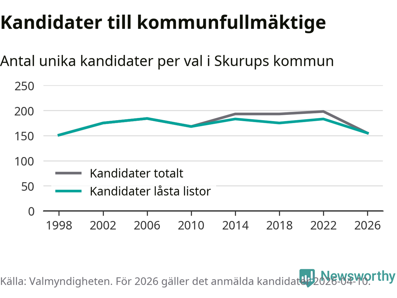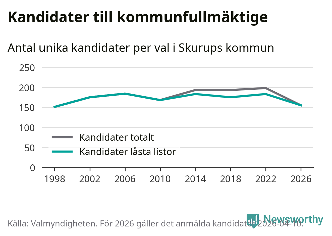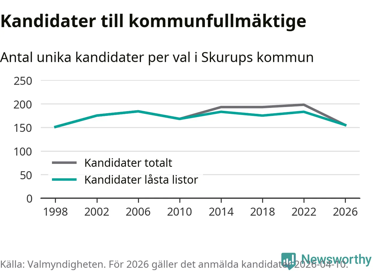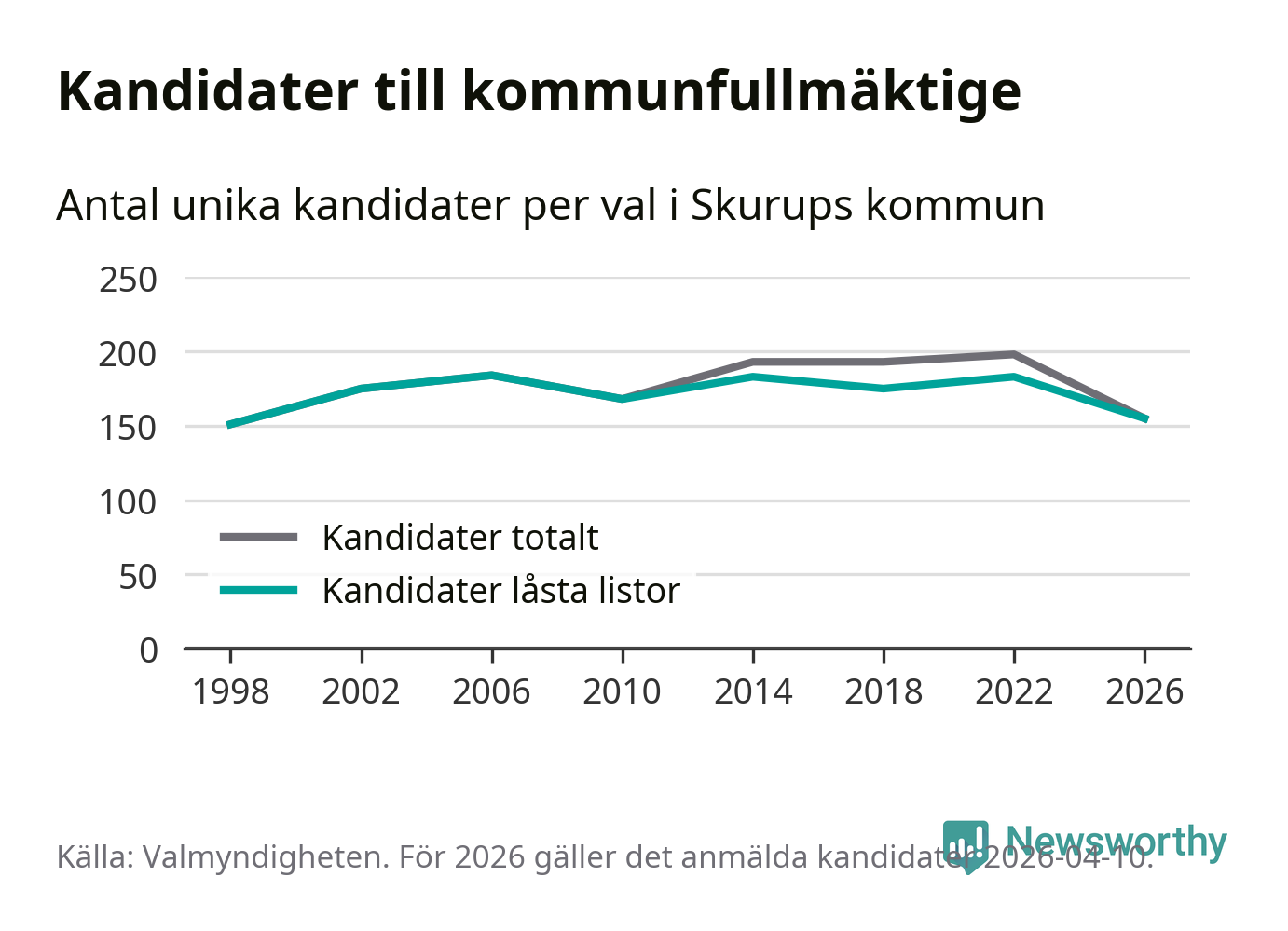 På torsdagen var det deadline för partier med låsta listor att registrera sina kandidater inför höstens val. Till valet till kommunfullmäktige i Skurup är 155 kandidater anmälda på sådana listor, vilket är 28 färre än i valet 2022.