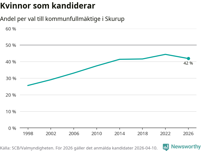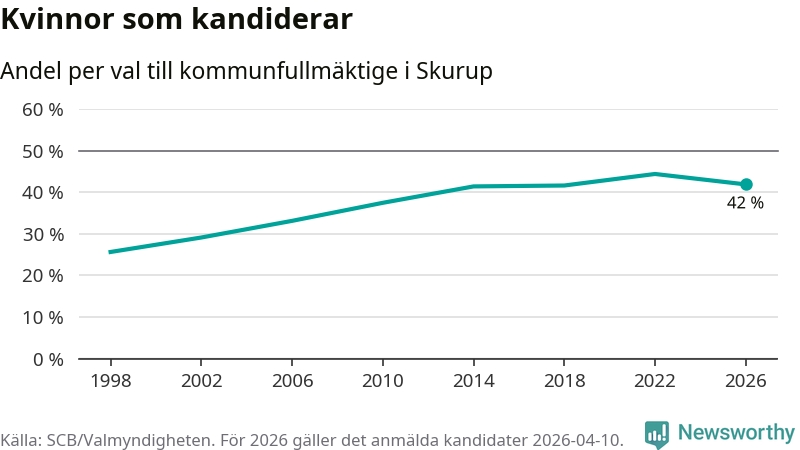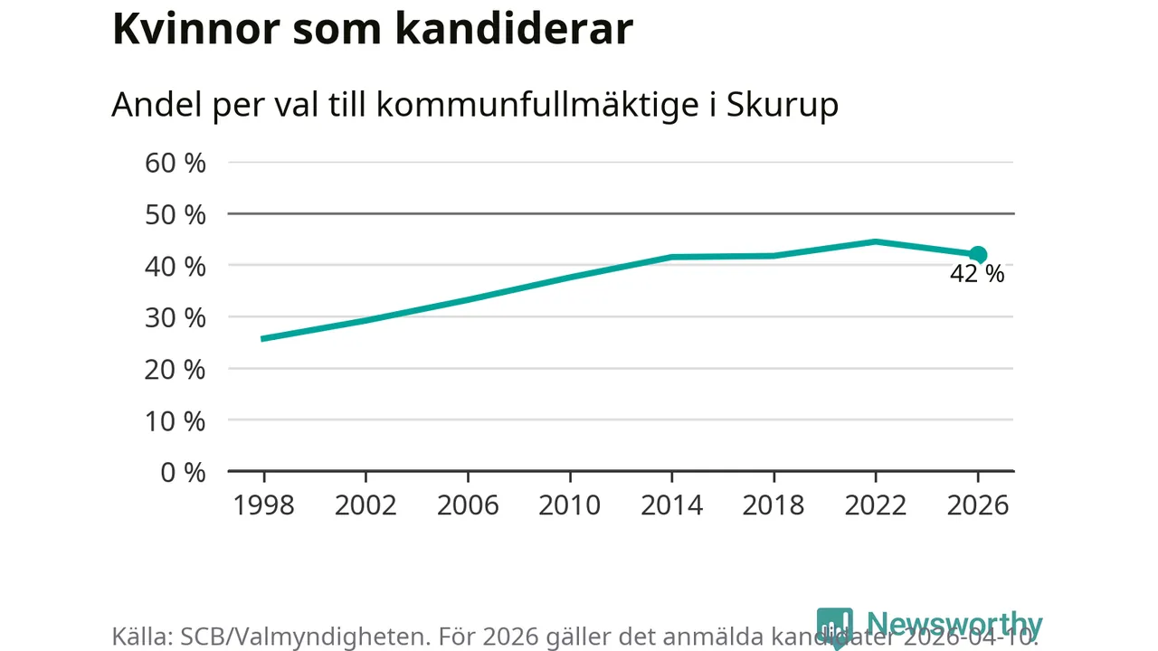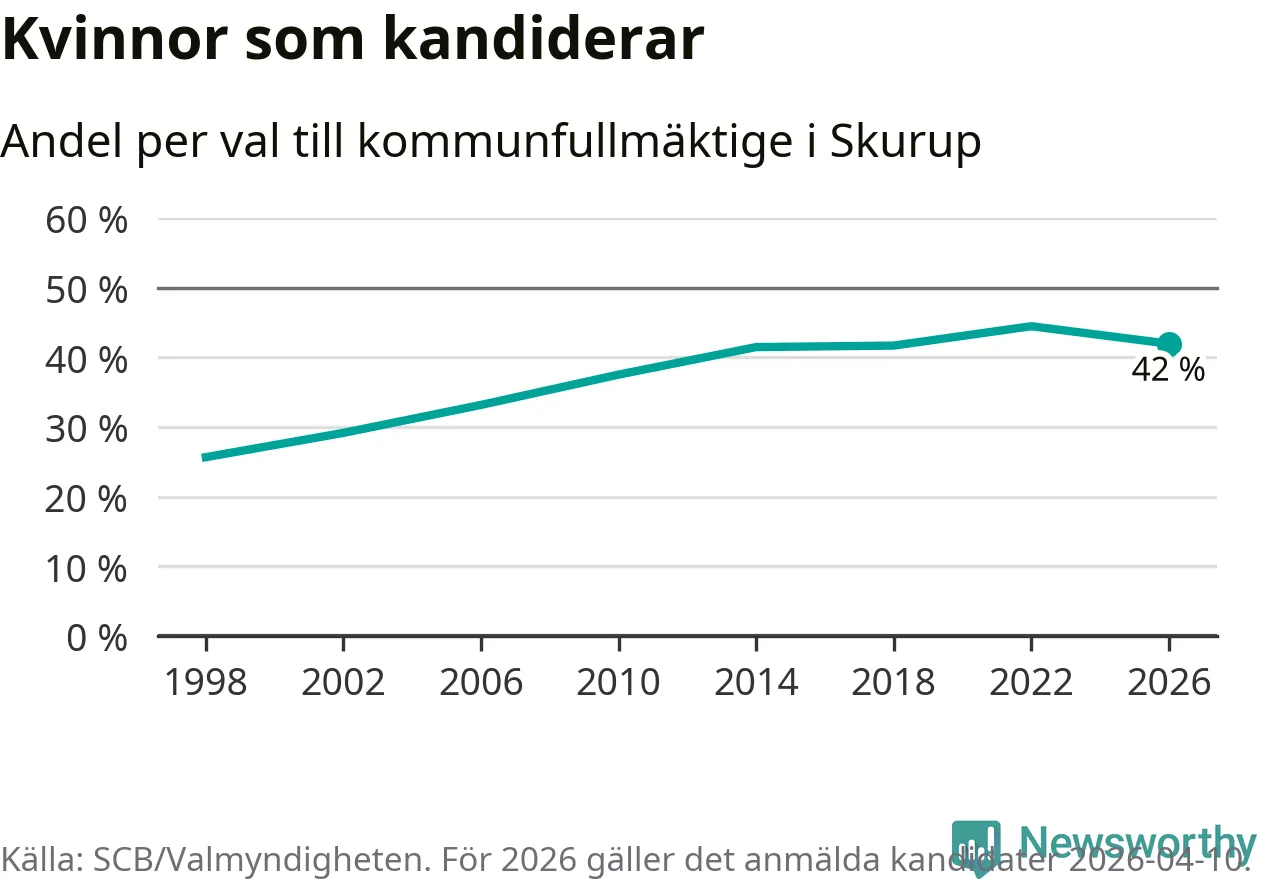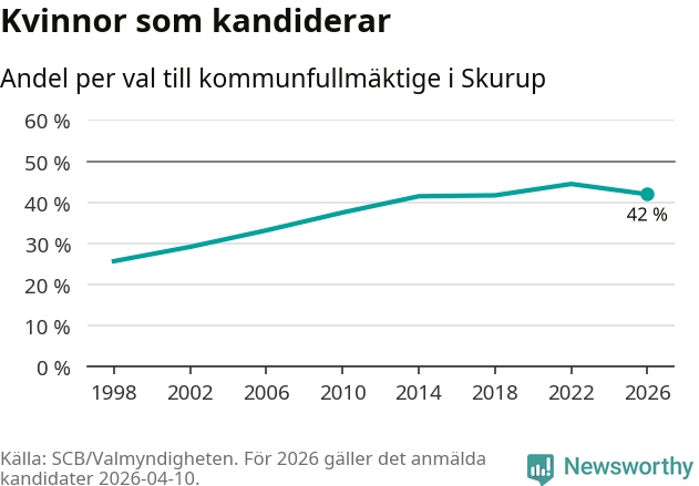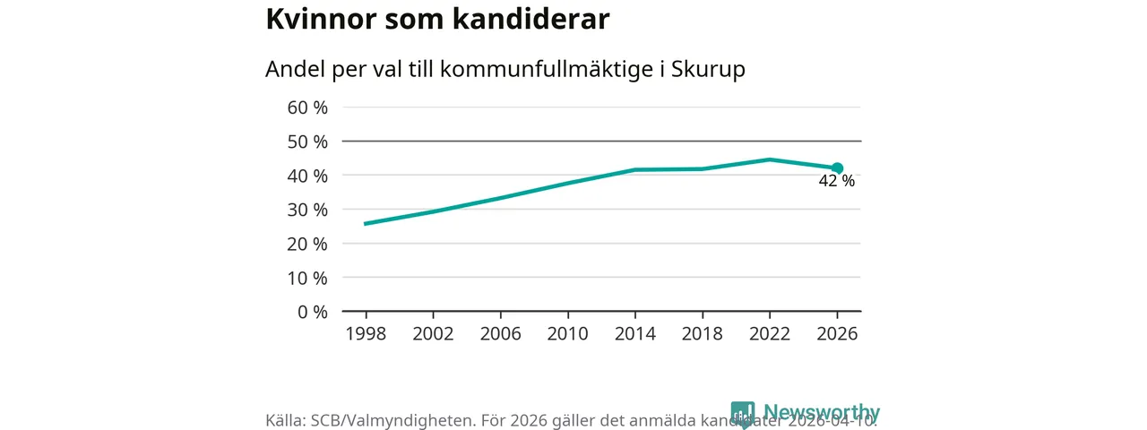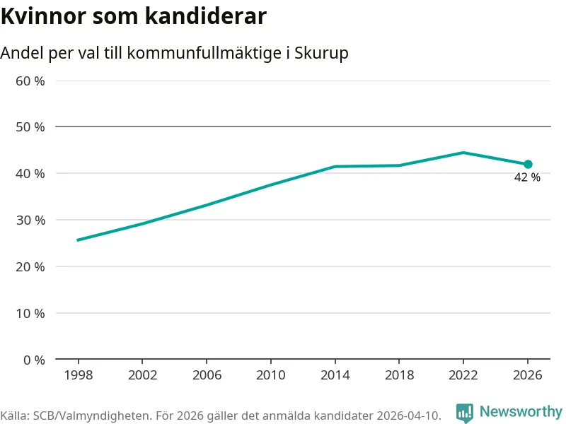 Kvinnorna utgör 42 procent av de hittills anmälda kandidaterna. Vid valet 2022 var 44 procent kvinnor, valet 1998 var motsvarande siffra 26 procent. Skurup är en av 264 kommuner i landet där männen utgör en majoritet av kandidaterna på listorna.