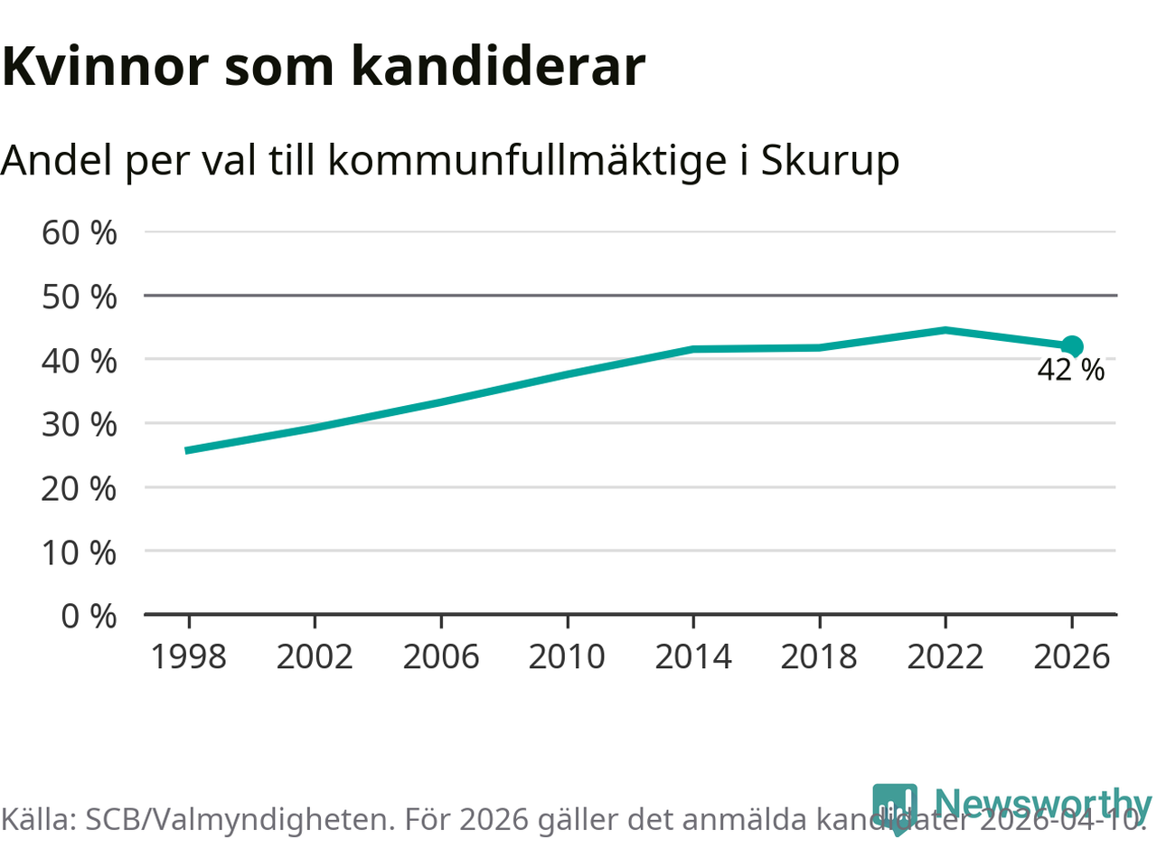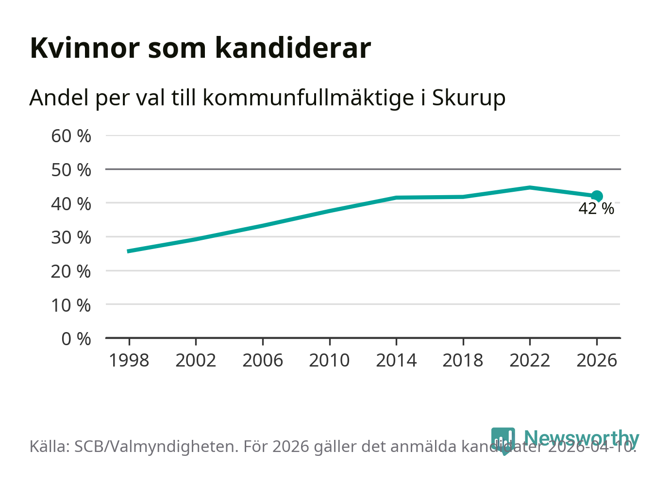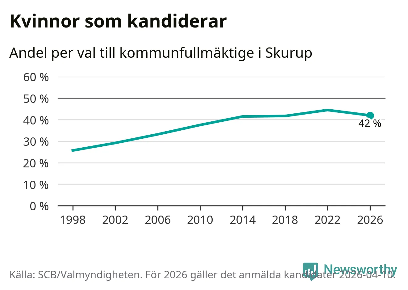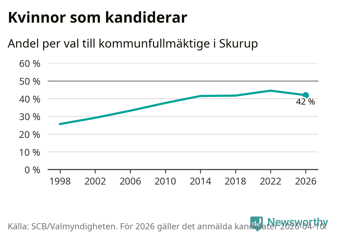 Kvinnorna utgör 42 procent av de hittills anmälda kandidaterna. Vid valet 2022 var 44 procent kvinnor, valet 1998 var motsvarande siffra 26 procent. Skurup är en av 264 kommuner i landet där männen utgör en majoritet av kandidaterna på listorna.
