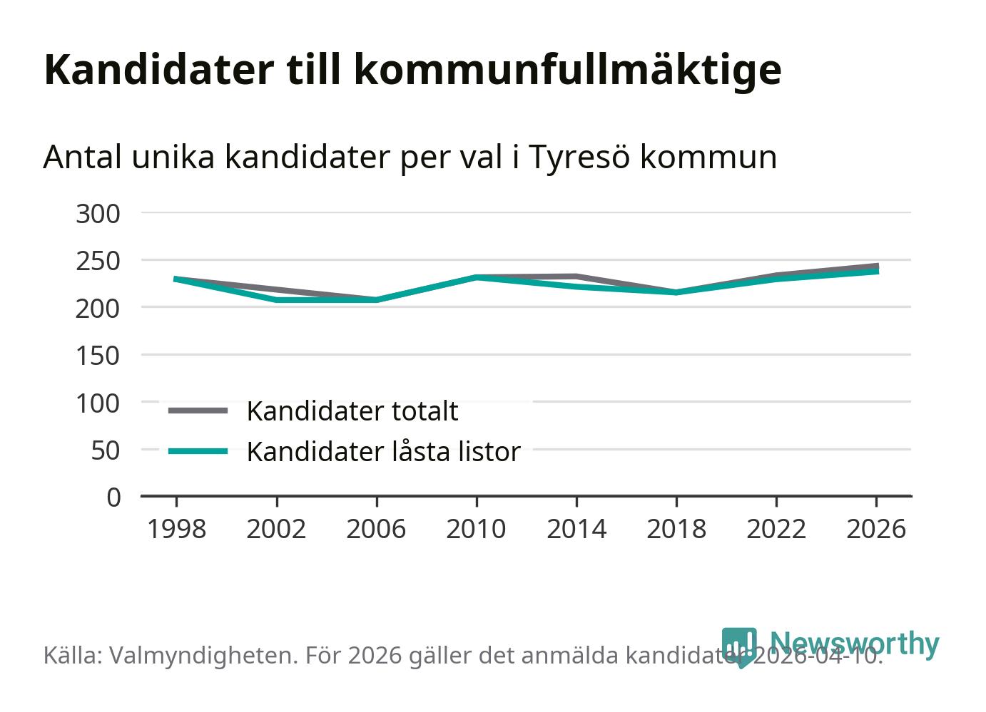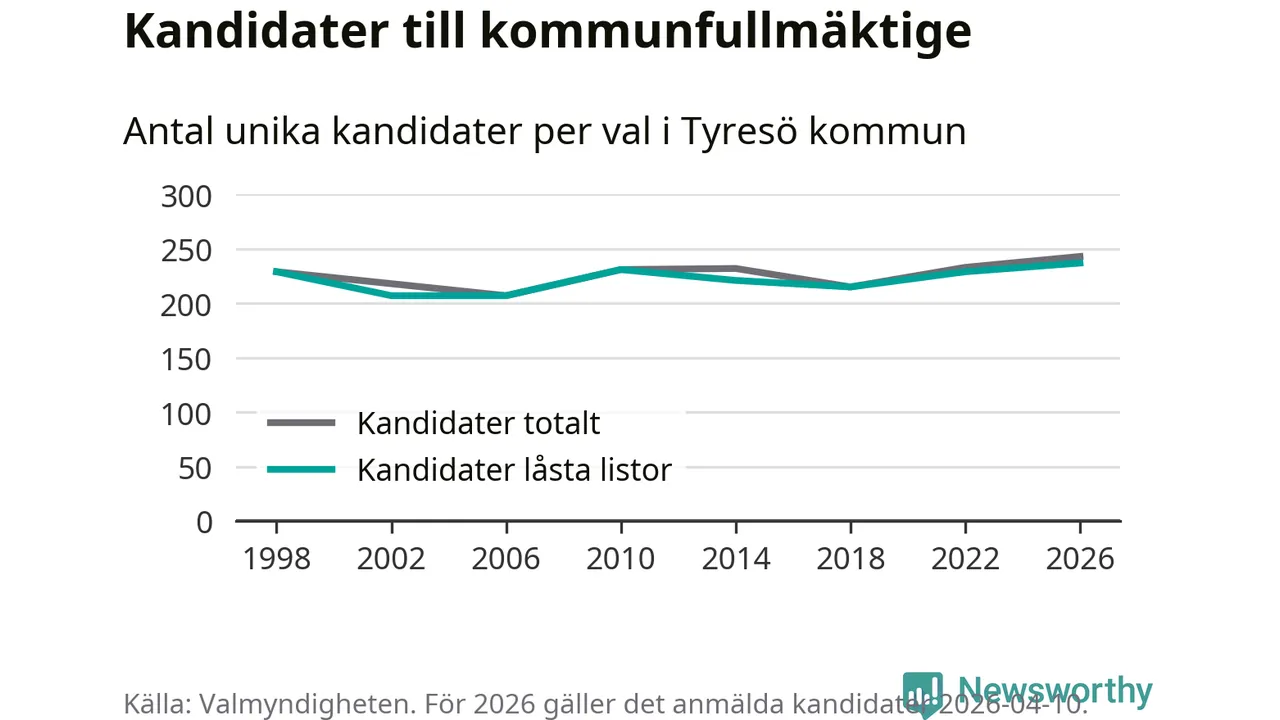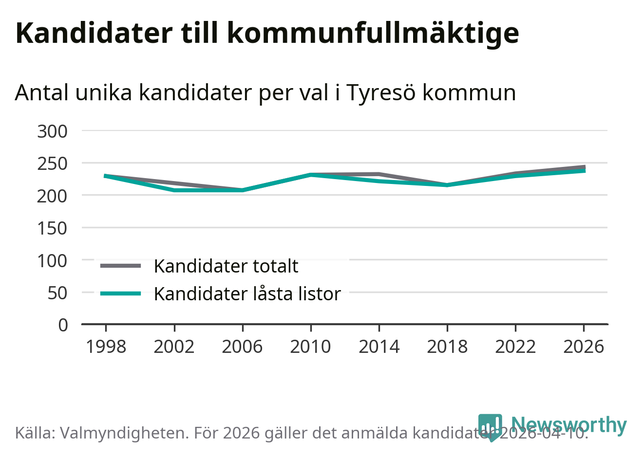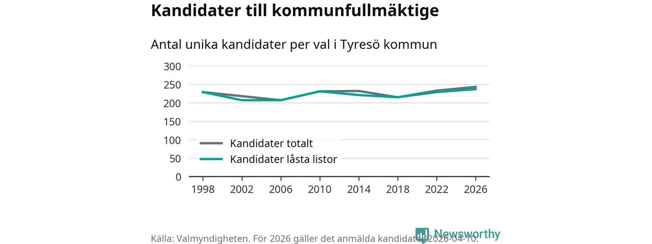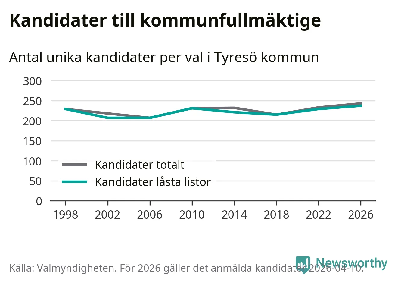 På torsdagen var det deadline för partier med låsta listor att registrera sina kandidater inför höstens val. Till valet till kommunfullmäktige i Tyresö är 237 kandidater anmälda på sådana listor, vilket är åtta fler än i valet 2022. Det är den högsta siffran sedan åtminstone valet 1998, vilket är så långt tillbaka som vi har statistik för.