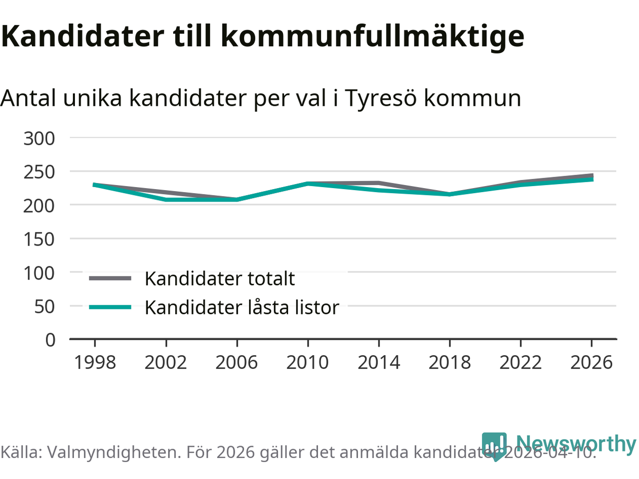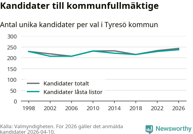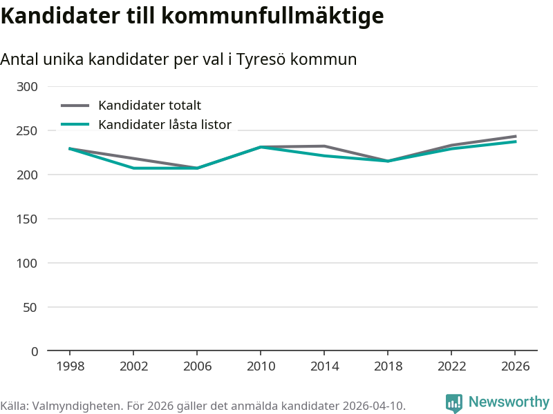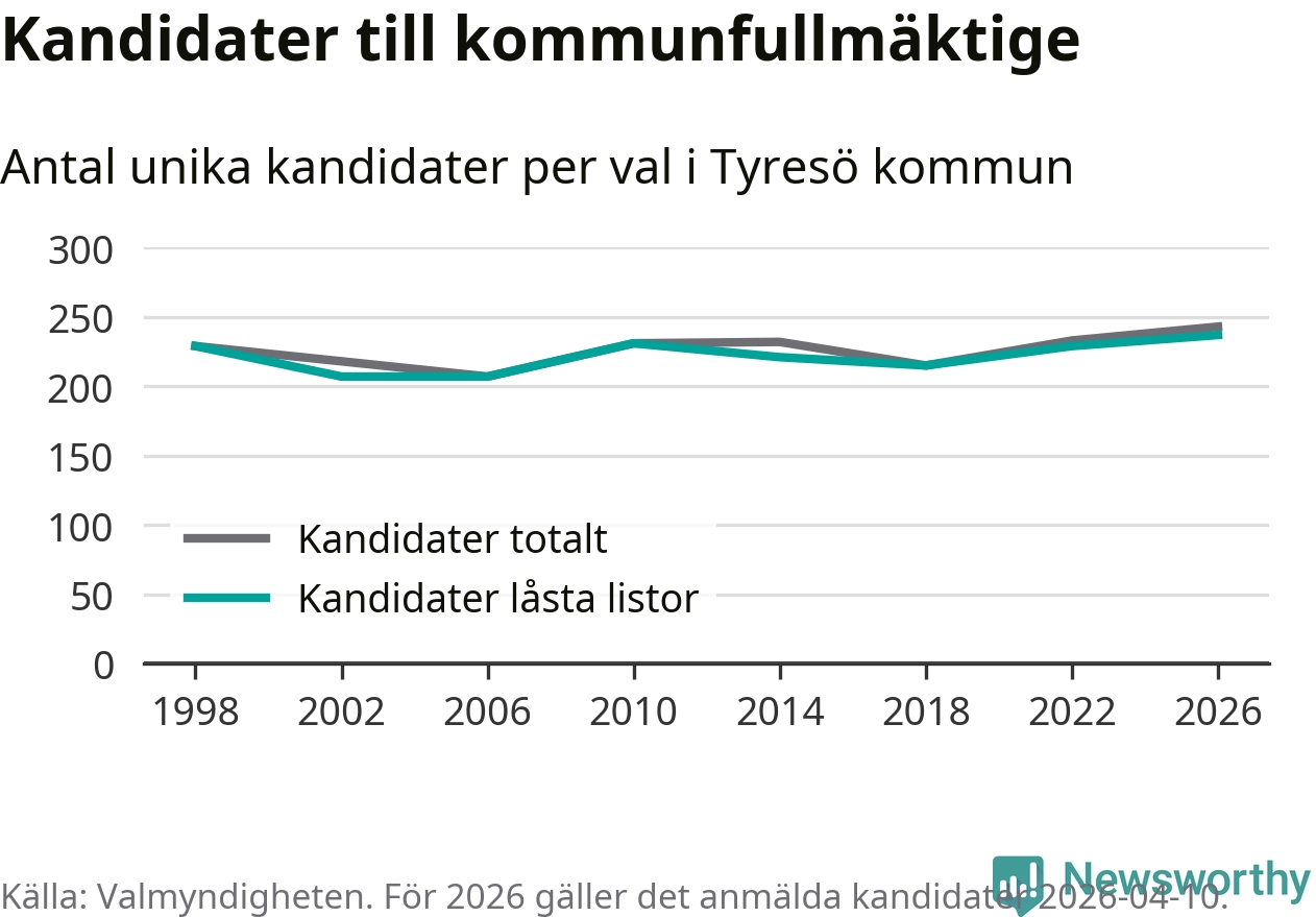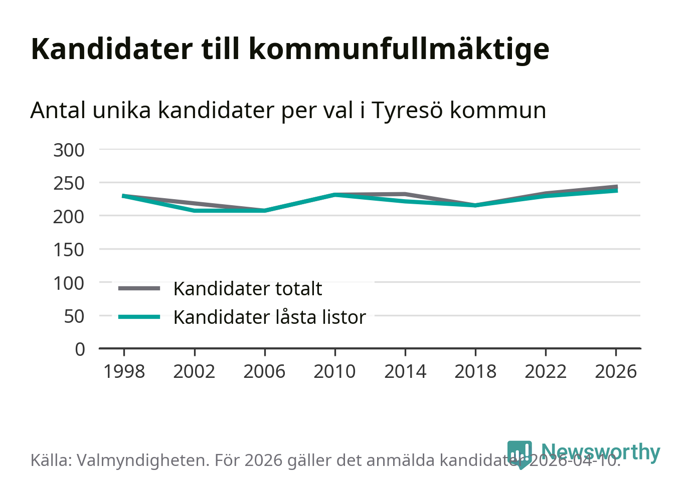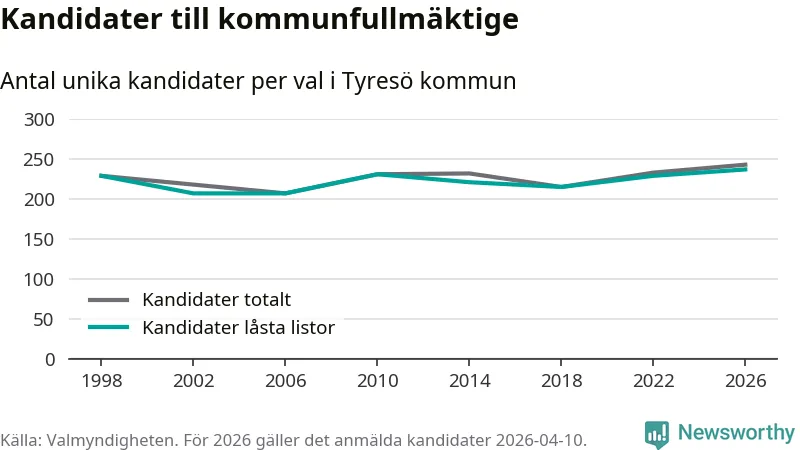 På torsdagen var det deadline för partier med låsta listor att registrera sina kandidater inför höstens val. Till valet till kommunfullmäktige i Tyresö är 237 kandidater anmälda på sådana listor, vilket är åtta fler än i valet 2022. Det är den högsta siffran sedan åtminstone valet 1998, vilket är så långt tillbaka som vi har statistik för.