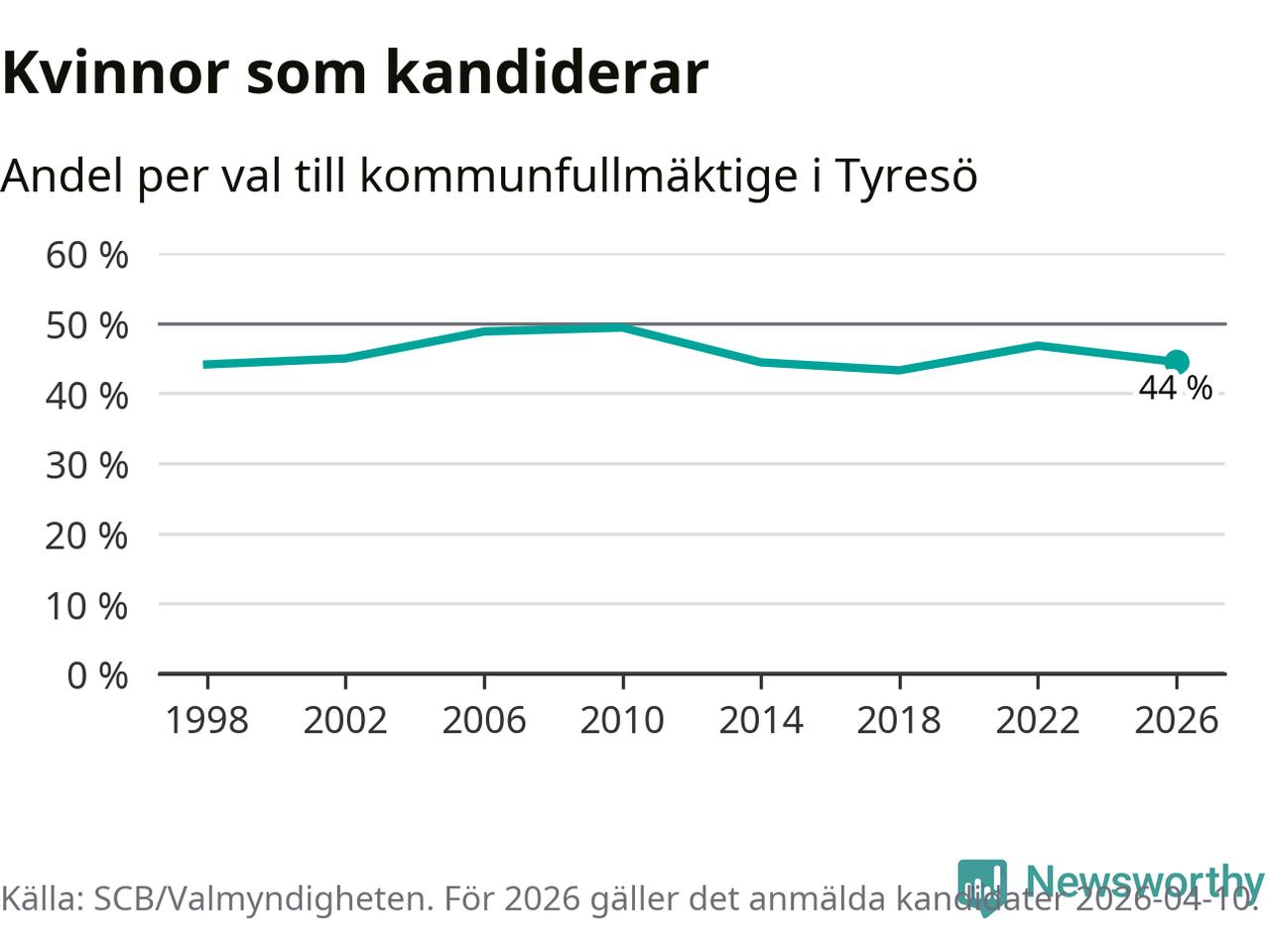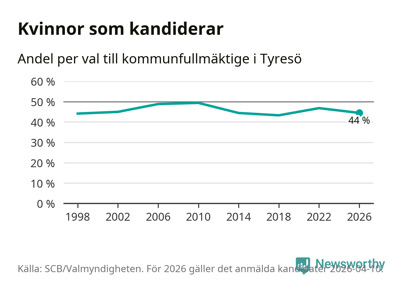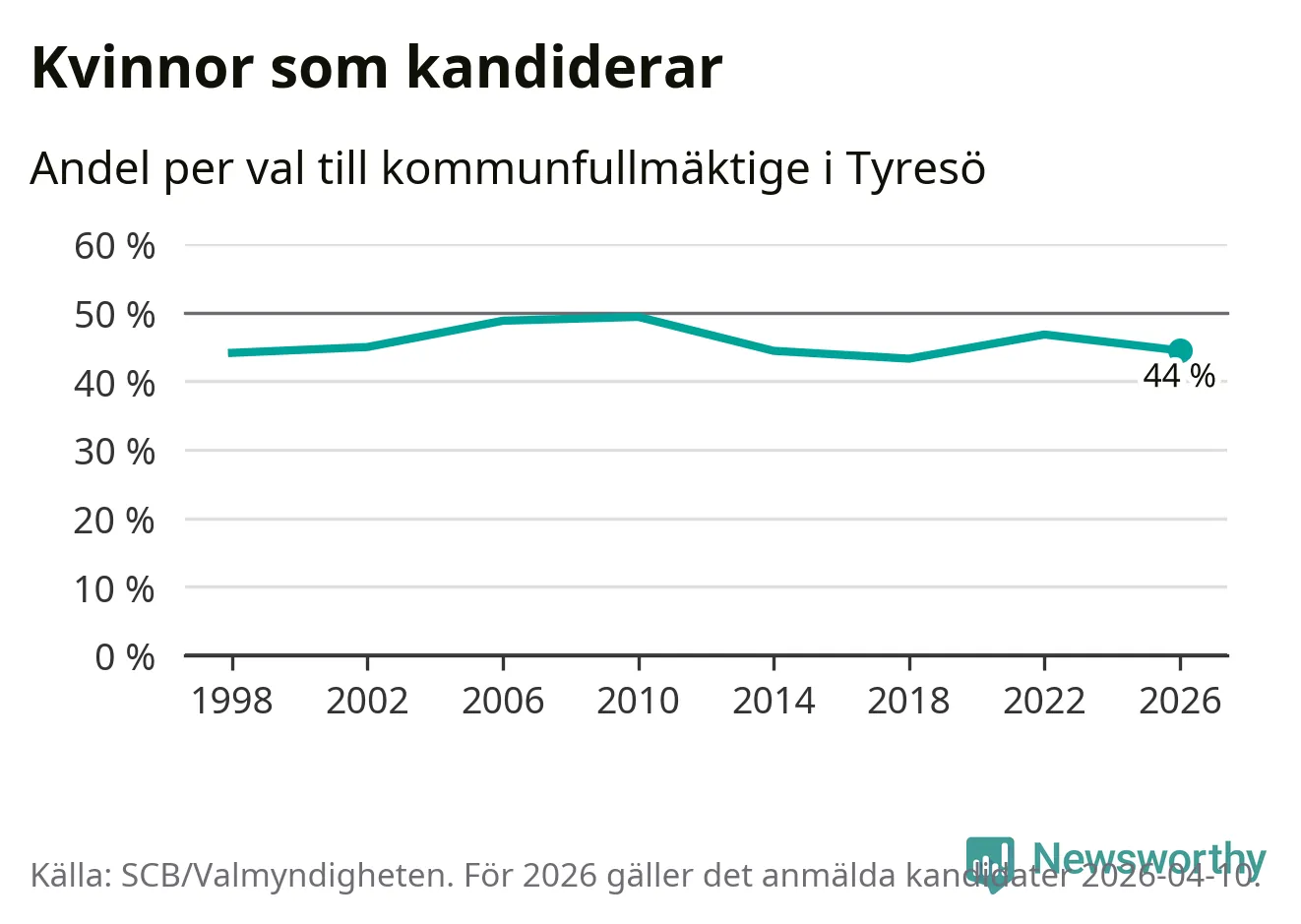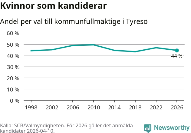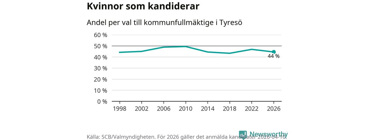 Kvinnorna utgör 44 procent av de hittills anmälda kandidaterna. Vid valet 2010 var 49 procent kvinnor, valet 2018 var motsvarande siffra 43 procent. Tyresö är en av 264 kommuner i landet där männen utgör en majoritet av kandidaterna på listorna.