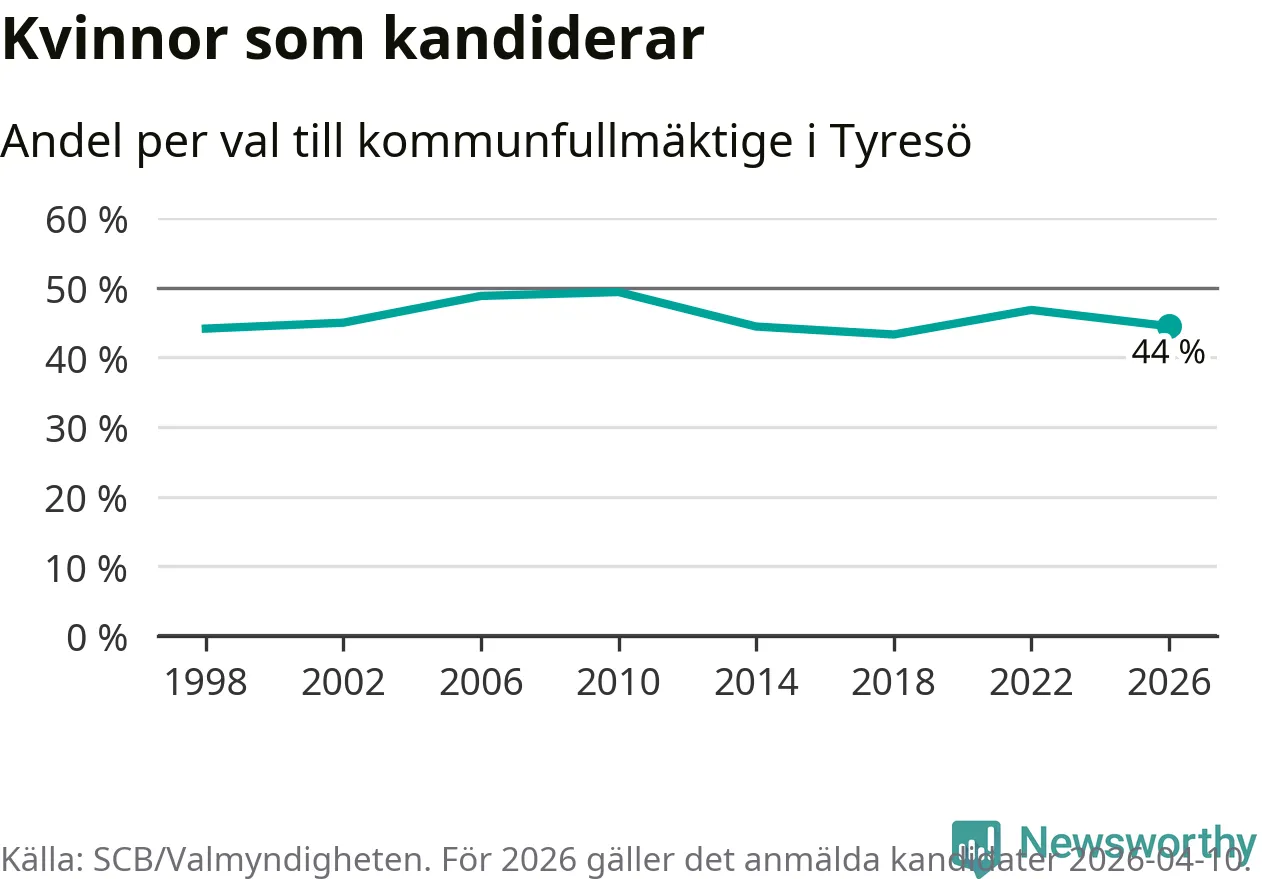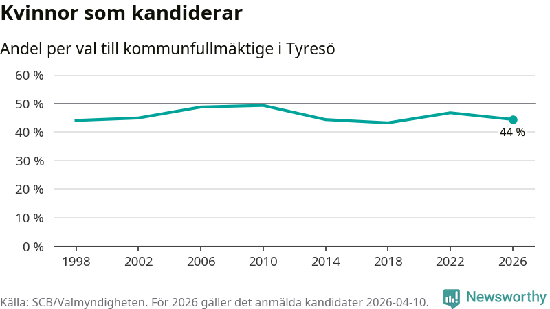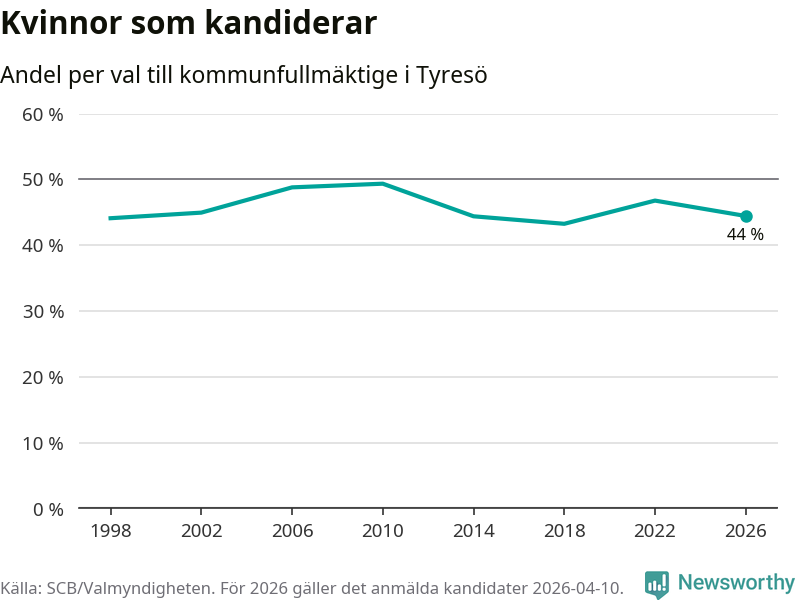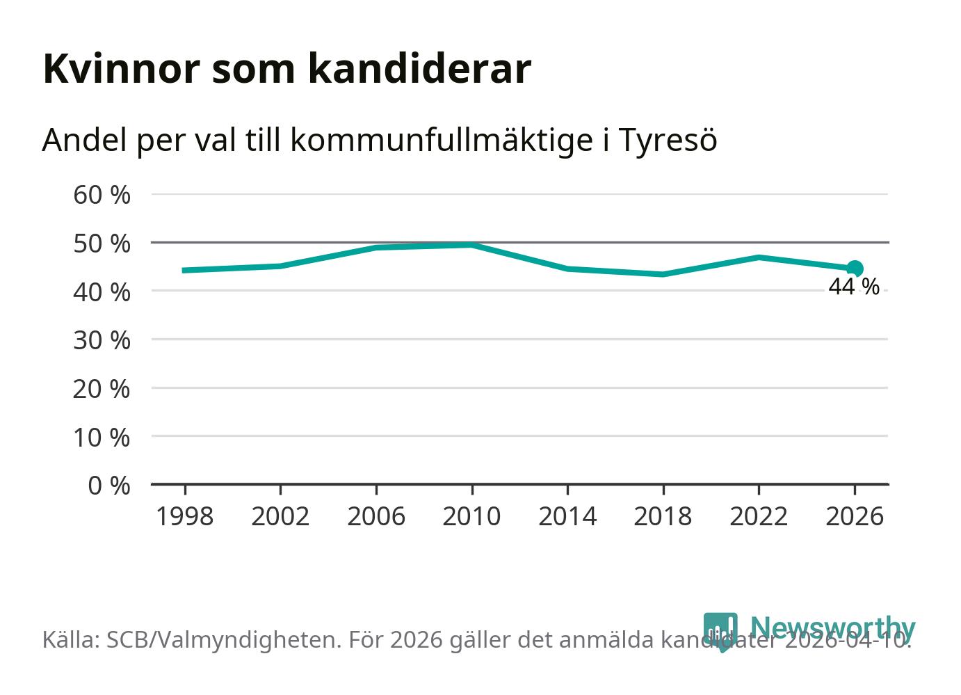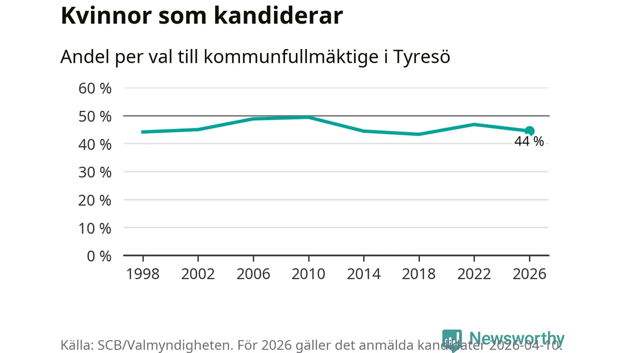 Kvinnorna utgör 44 procent av de hittills anmälda kandidaterna. Vid valet 2010 var 49 procent kvinnor, valet 2018 var motsvarande siffra 43 procent. Tyresö är en av 264 kommuner i landet där männen utgör en majoritet av kandidaterna på listorna.