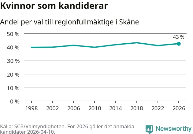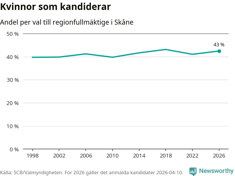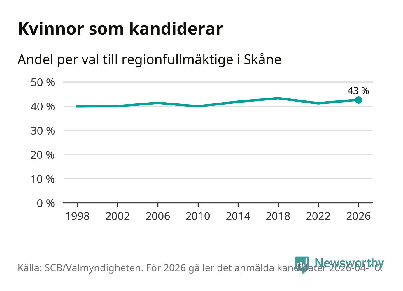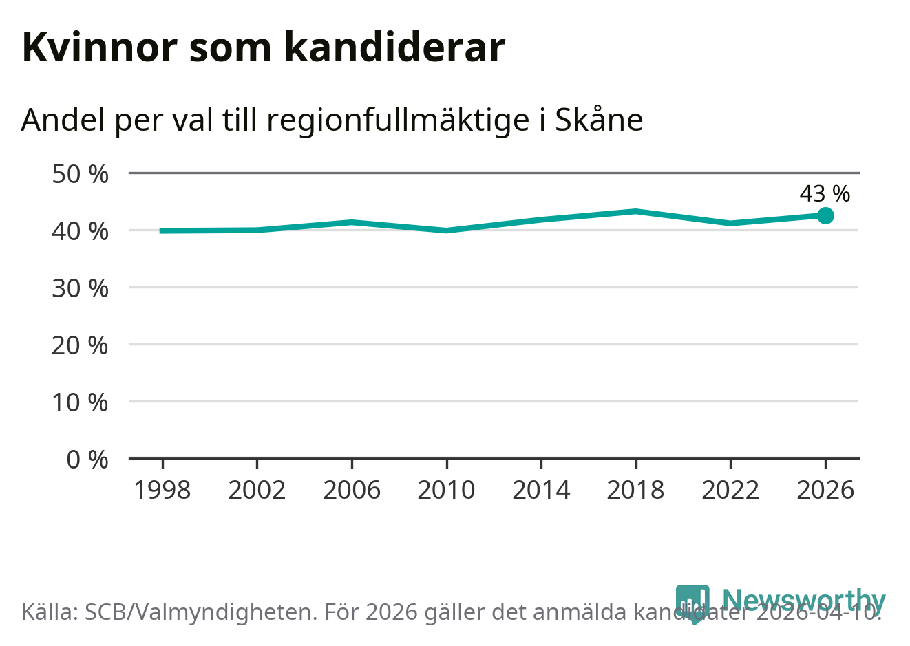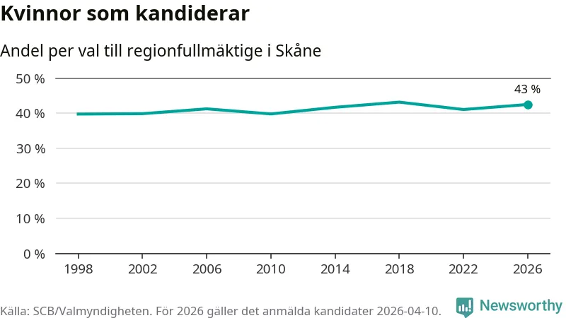 Kvinnorna utgör 43 procent av de hittills anmälda kandidaterna. Vid valet 2018 var 43 procent kvinnor, valet 1998 var motsvarande siffra 40 procent. Skåne är en av 20 regioner i landet där männen utgör en majoritet av kandidaterna på listorna.