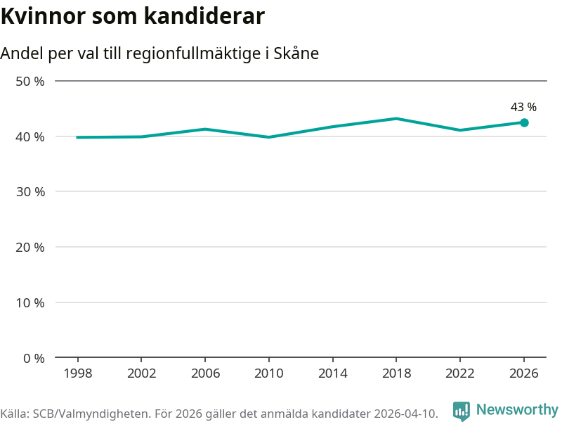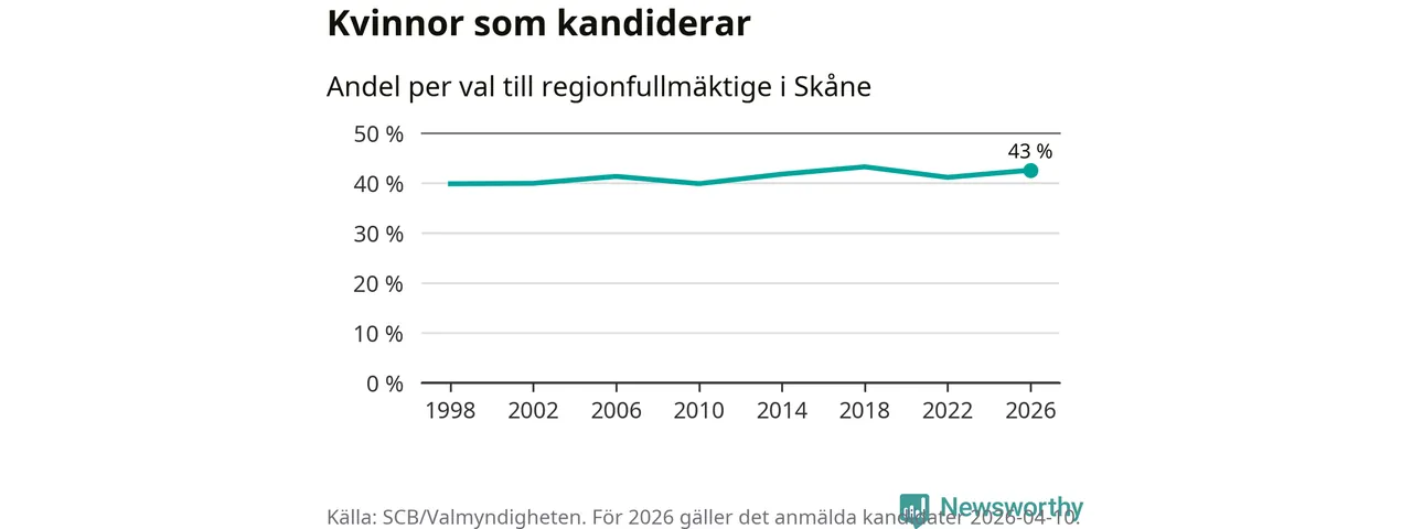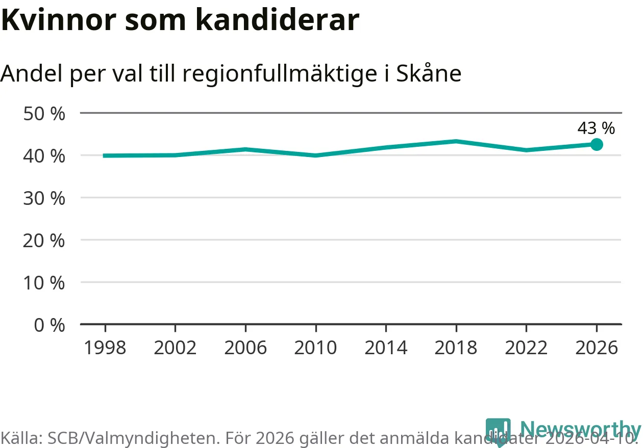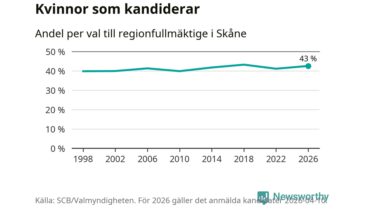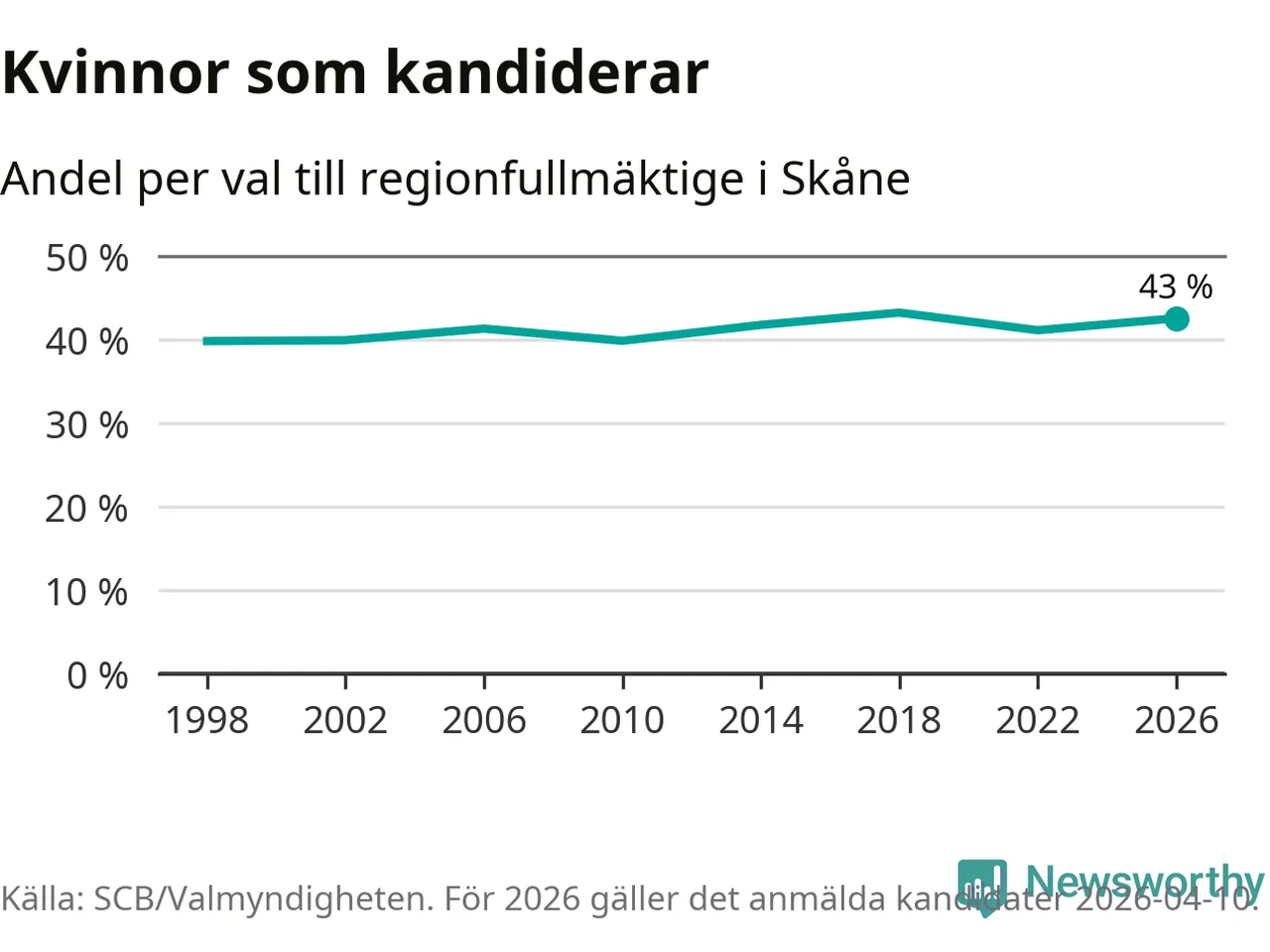 Kvinnorna utgör 43 procent av de hittills anmälda kandidaterna. Vid valet 2018 var 43 procent kvinnor, valet 1998 var motsvarande siffra 40 procent. Skåne är en av 20 regioner i landet där männen utgör en majoritet av kandidaterna på listorna.