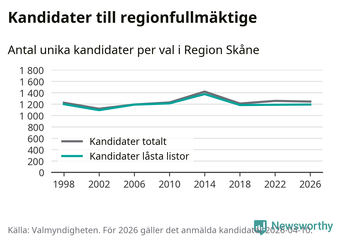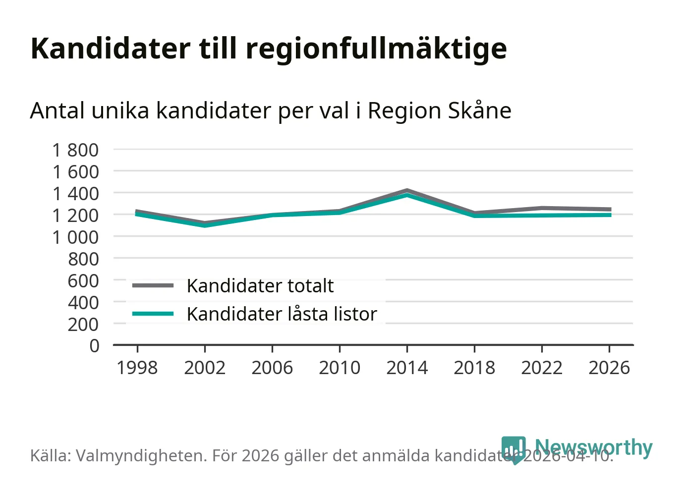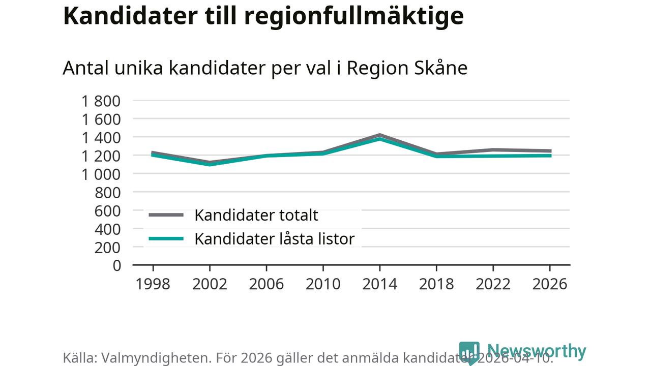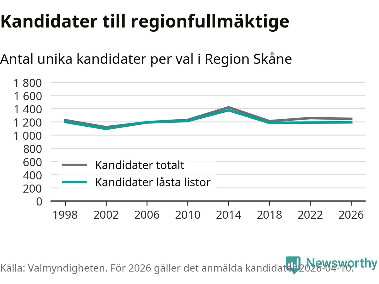 På torsdagen var det deadline för partier med låsta listor att registrera sina kandidater inför höstens val. Till valet till regionfullmäktige i Region Skåne är 1 192 kandidater anmälda på sådana listor, vilket är fyra fler än i valet 2022.