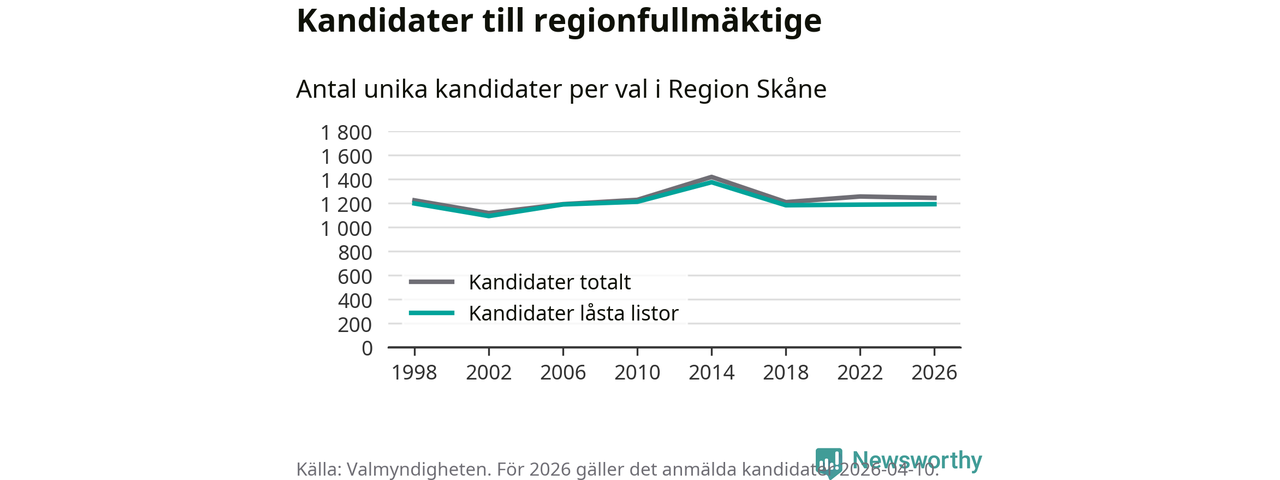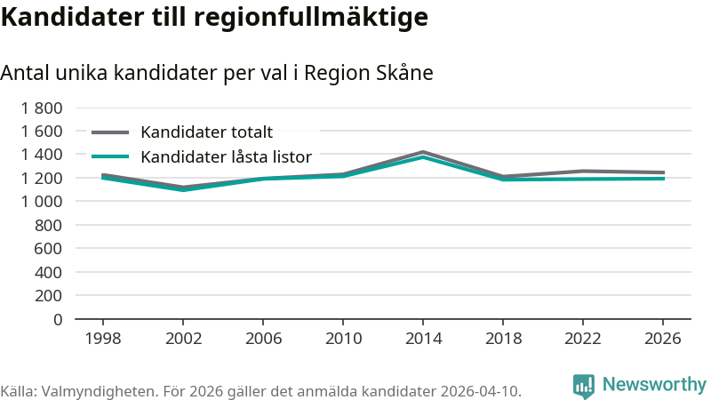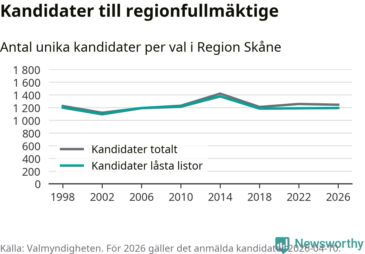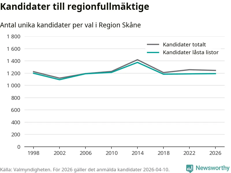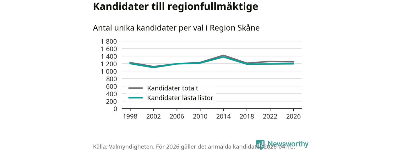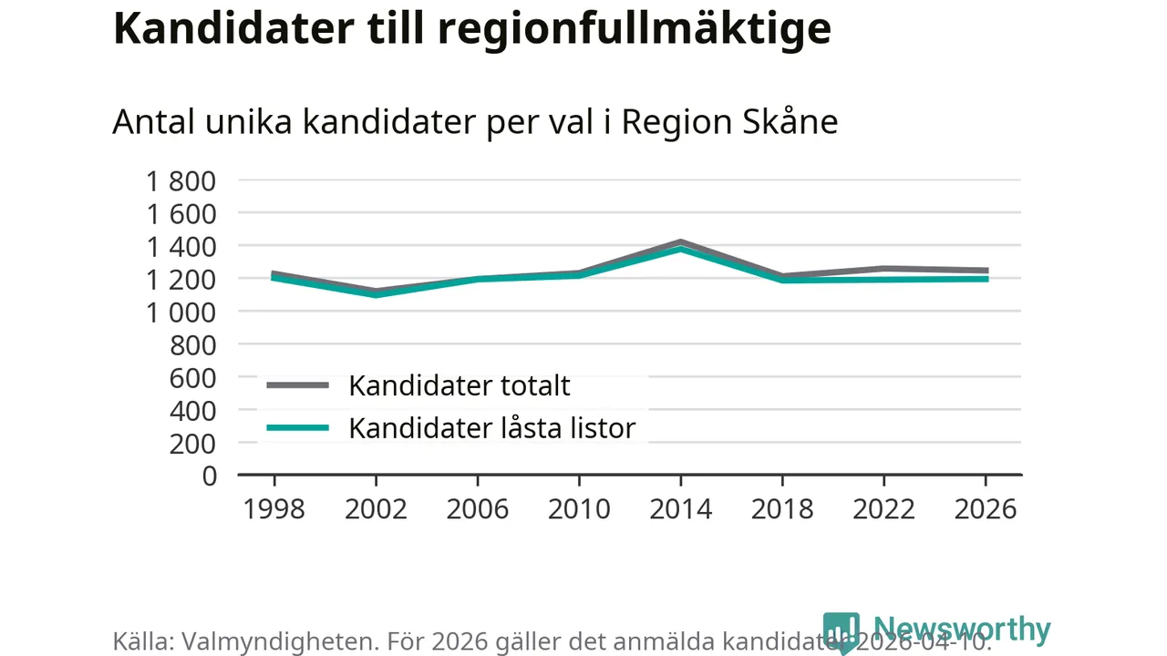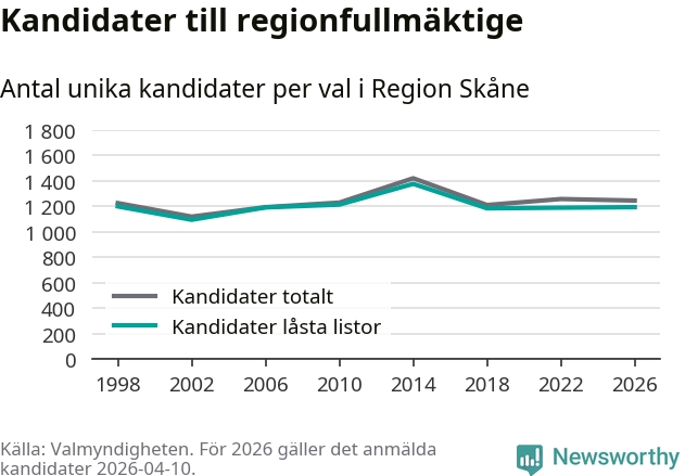 På torsdagen var det deadline för partier med låsta listor att registrera sina kandidater inför höstens val. Till valet till regionfullmäktige i Region Skåne är 1 192 kandidater anmälda på sådana listor, vilket är fyra fler än i valet 2022.