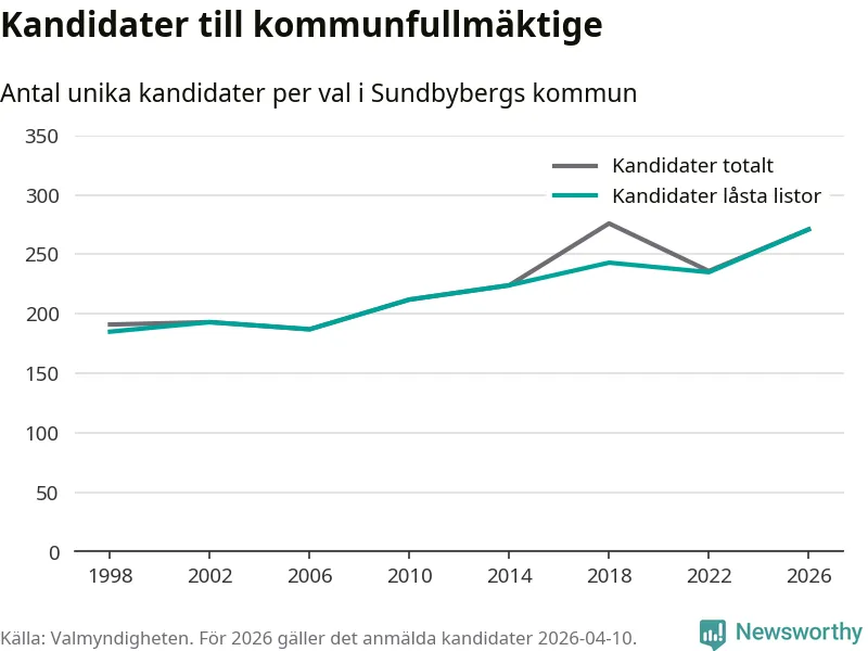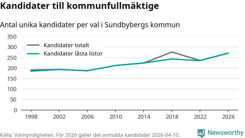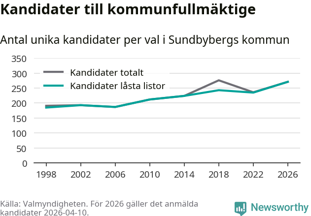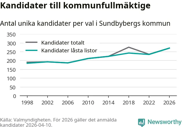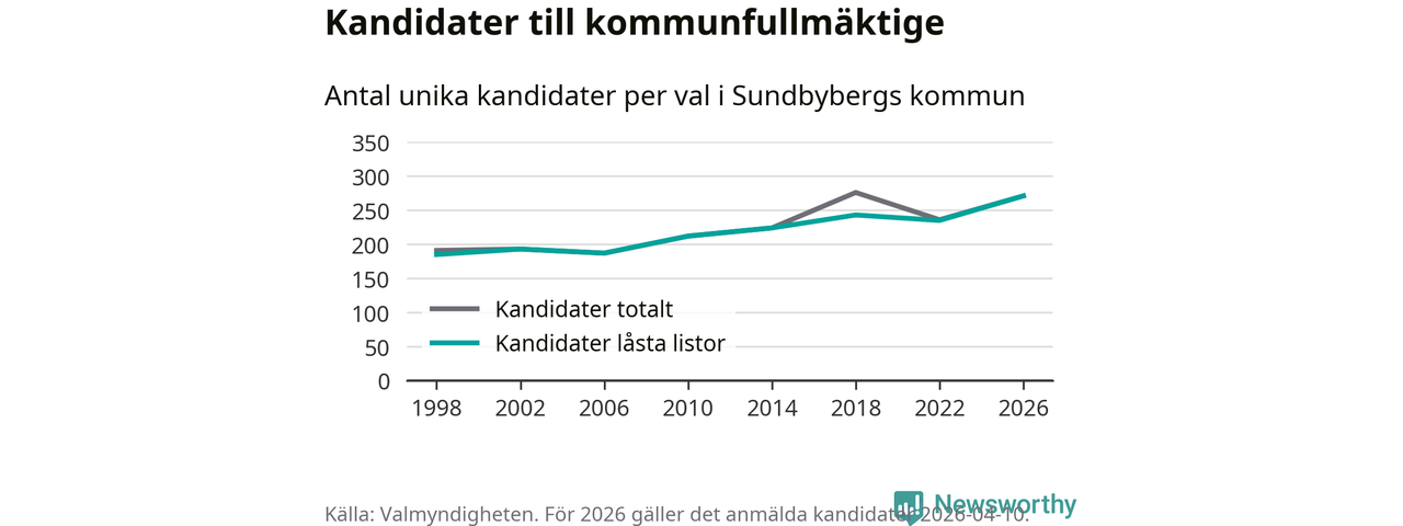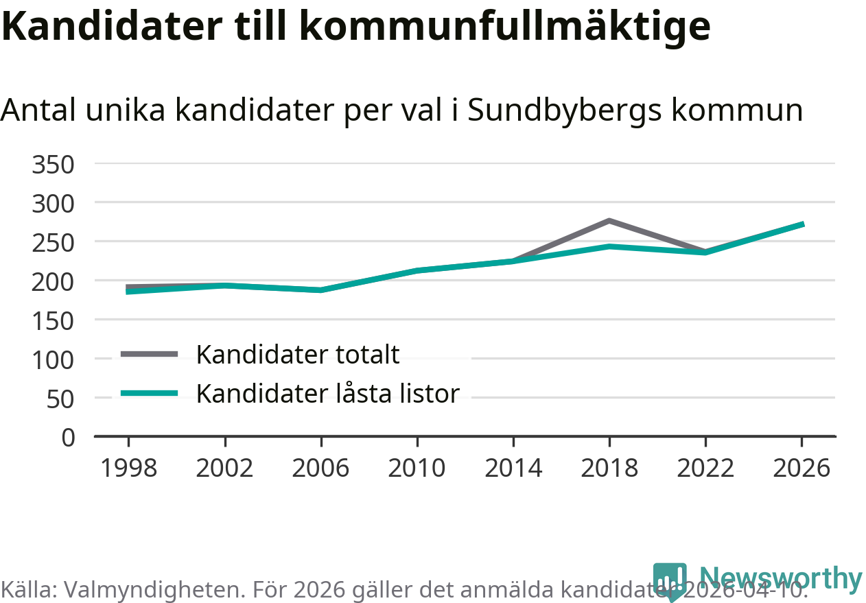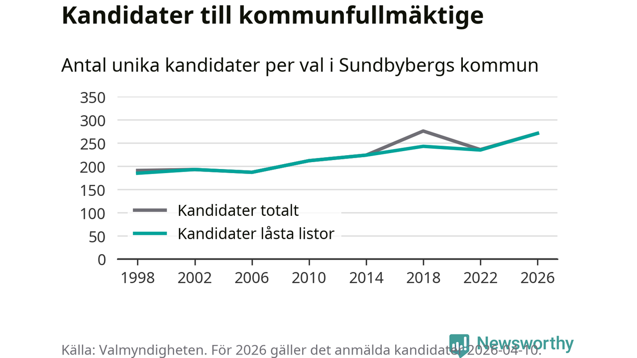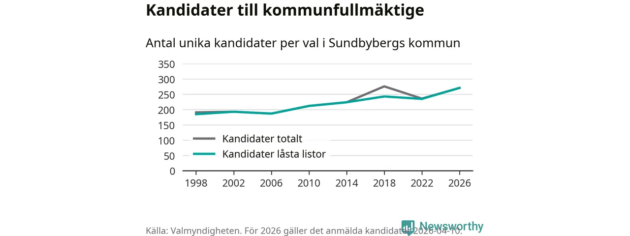 På torsdagen var det deadline för partier med låsta listor att registrera sina kandidater inför höstens val. Till valet till kommunfullmäktige i Sundbyberg är 271 kandidater anmälda på sådana listor, vilket är 36 fler än i valet 2022. Det är den högsta siffran sedan åtminstone valet 1998, vilket är så långt tillbaka som vi har statistik för.