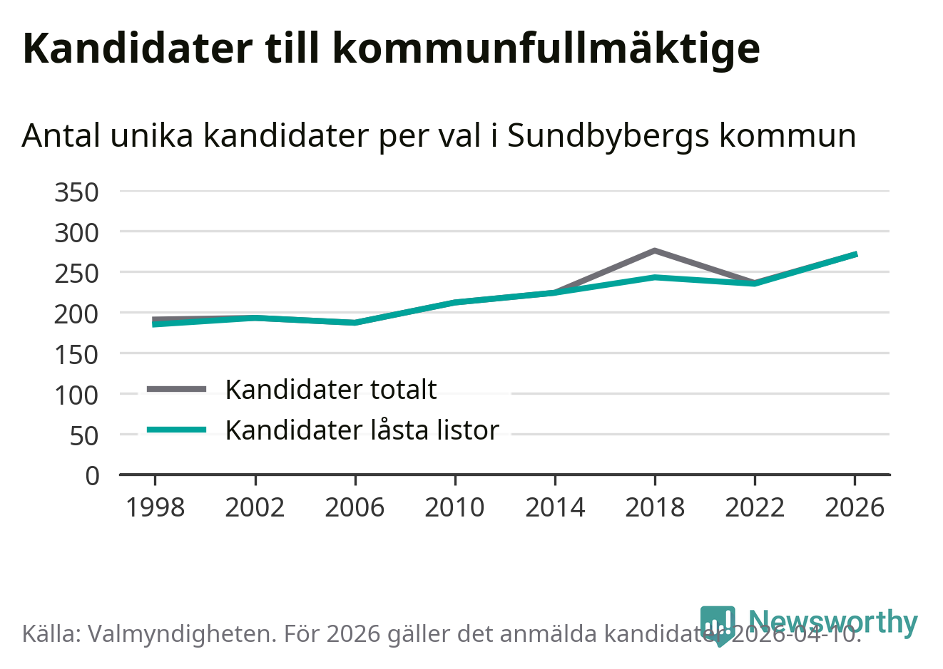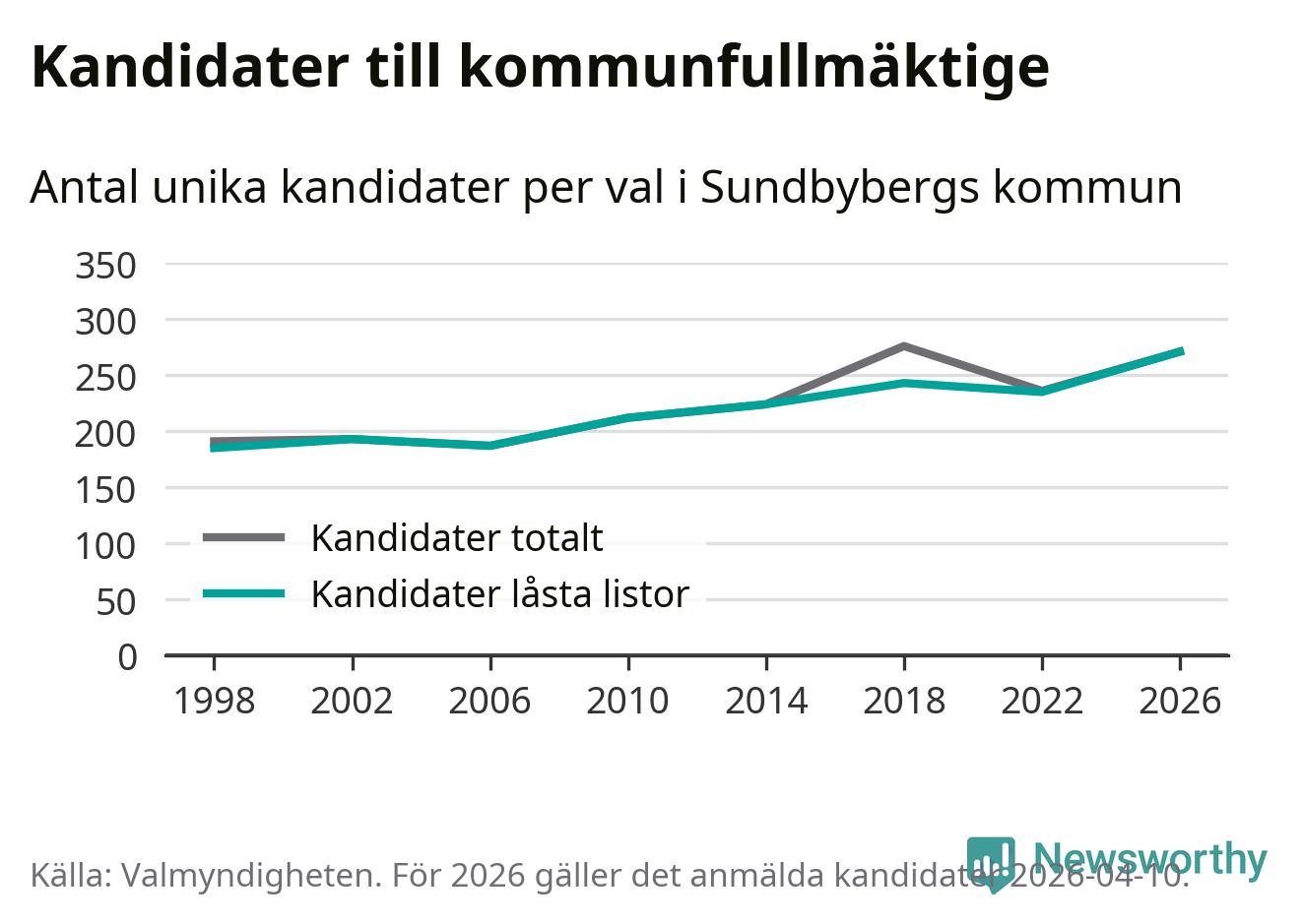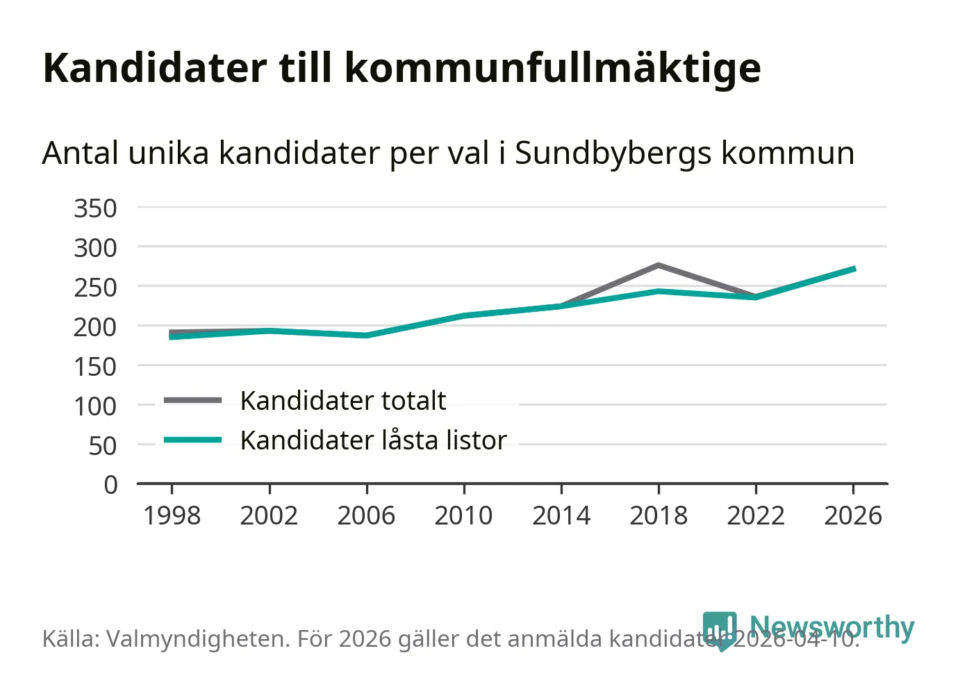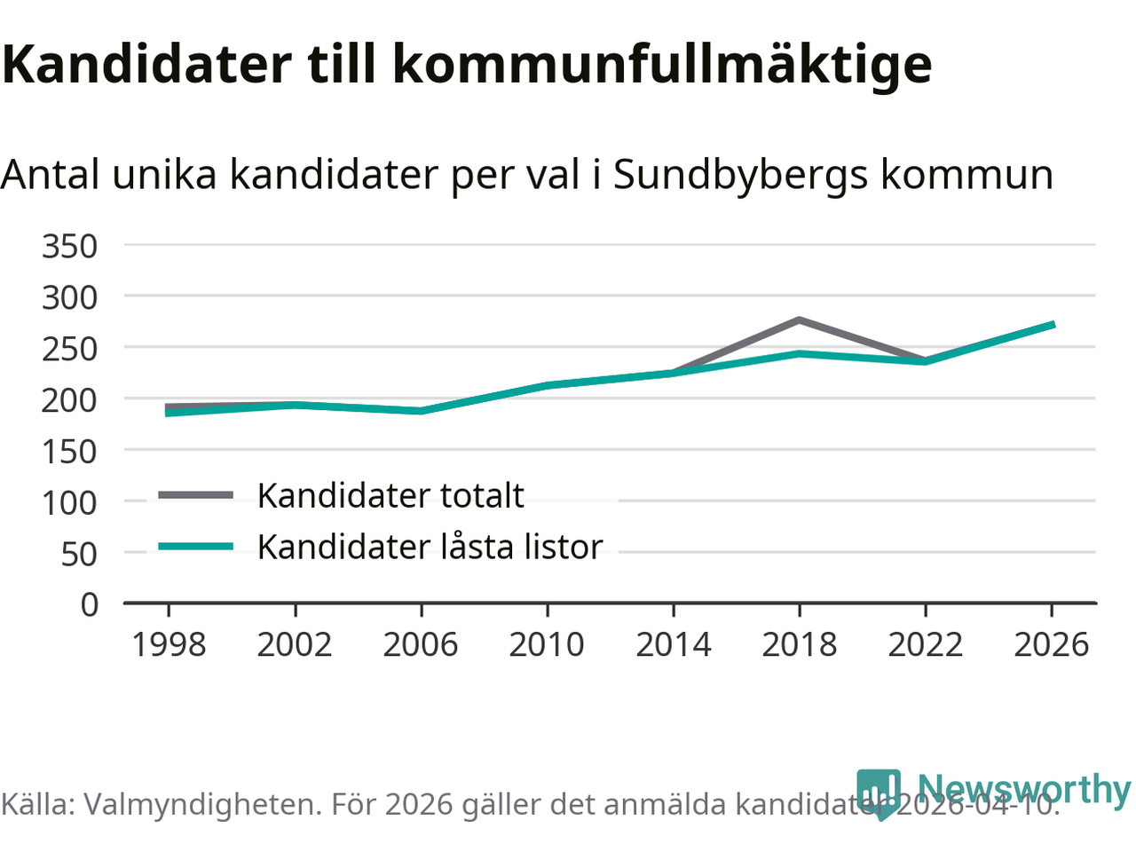 På torsdagen var det deadline för partier med låsta listor att registrera sina kandidater inför höstens val. Till valet till kommunfullmäktige i Sundbyberg är 271 kandidater anmälda på sådana listor, vilket är 36 fler än i valet 2022. Det är den högsta siffran sedan åtminstone valet 1998, vilket är så långt tillbaka som vi har statistik för.