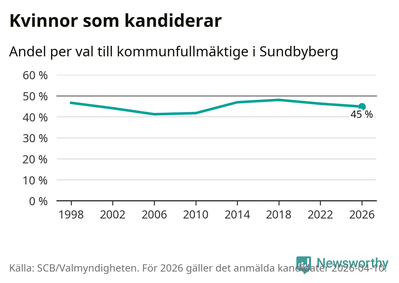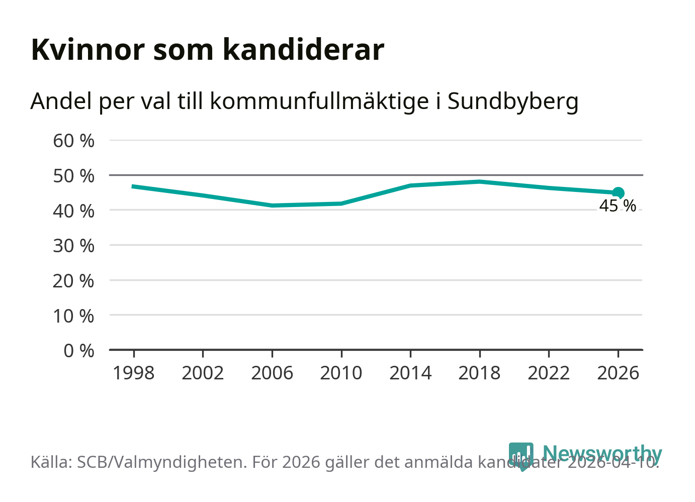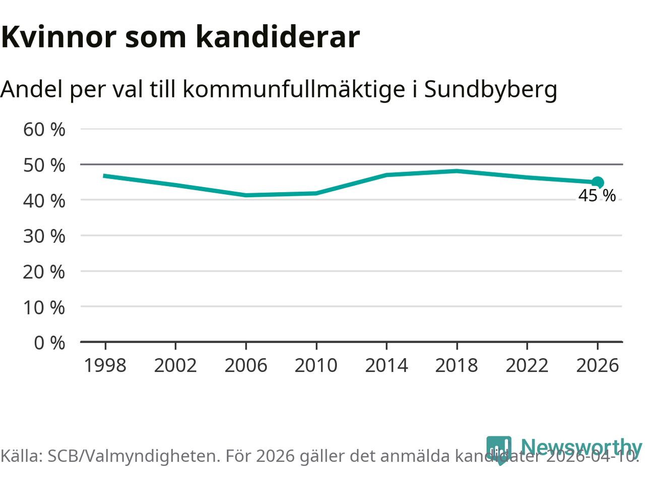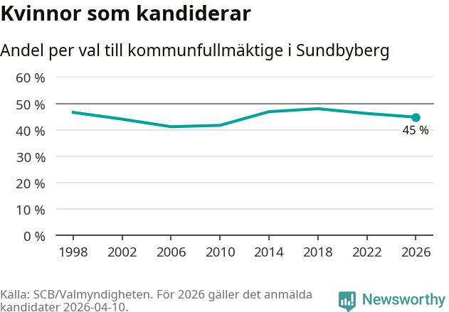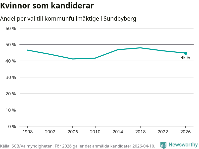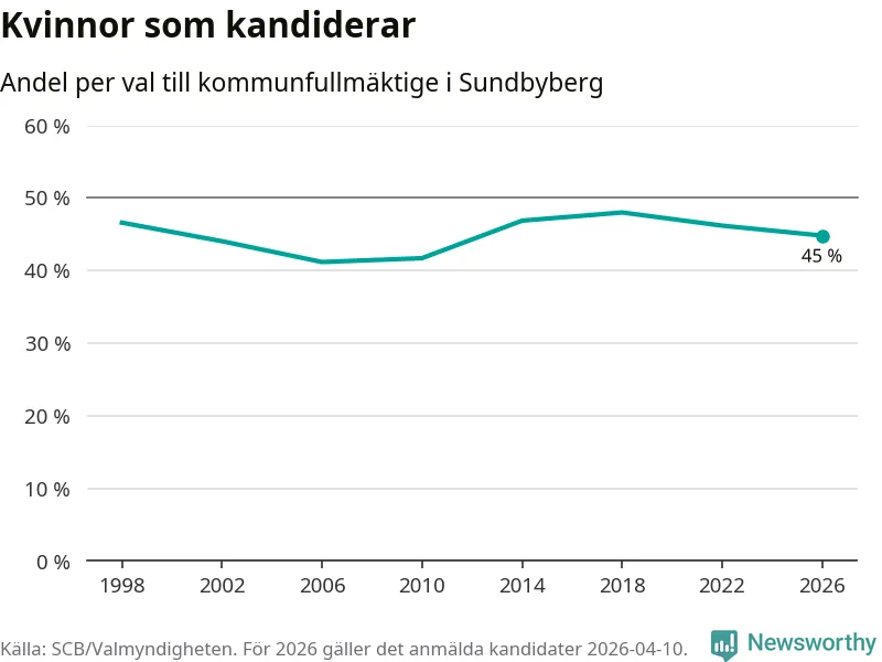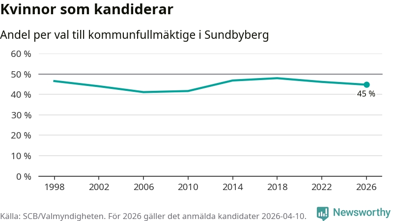 Kvinnorna utgör 45 procent av de hittills anmälda kandidaterna, vilket är den lägsta andelen på listorna till kommunfullmäktige i Sundbyberg sedan valet 2010. Vid valet 2018 var 48 procent kvinnor, valet 2006 var motsvarande siffra 41 procent. Sundbyberg är en av 264 kommuner i landet där männen utgör en majoritet av kandidaterna på listorna.