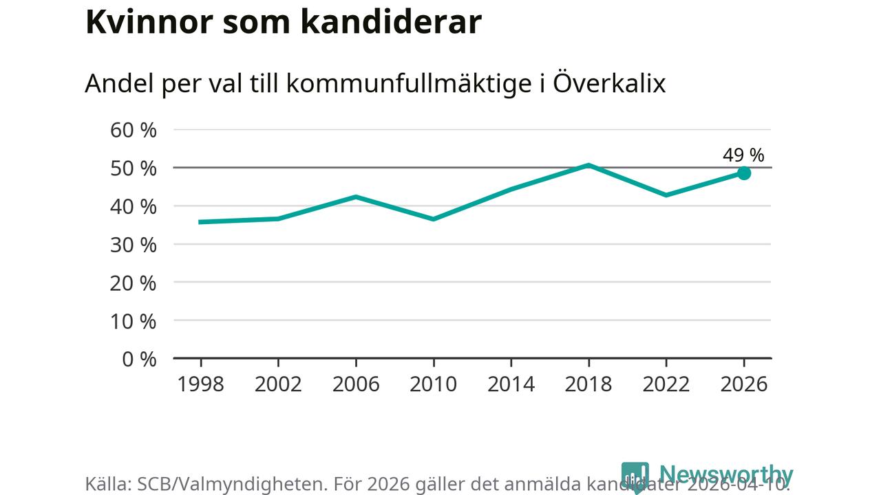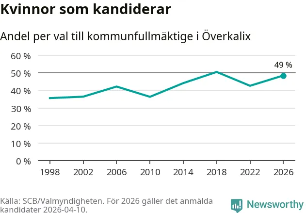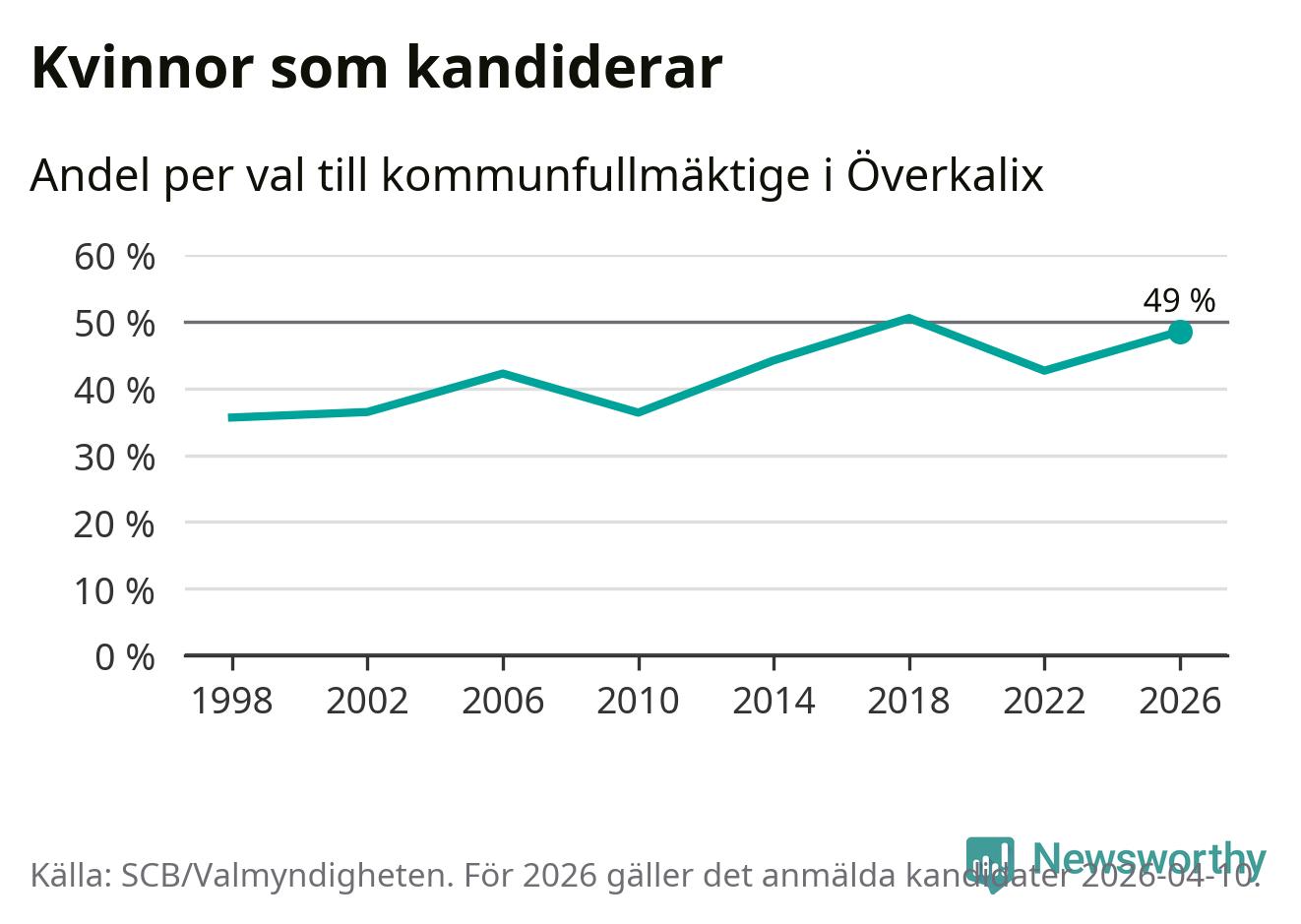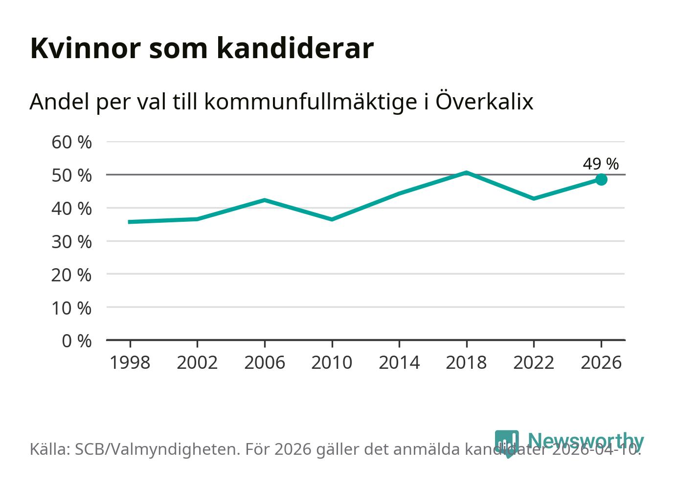Kvinnorna utgör 49 procent av de hittills anmälda kandidaterna. Vid valet 2018 var 51 procent kvinnor, valet 1998 var motsvarande siffra 36 procent. Överkalix är en av 264 kommuner i landet där männen utgör en majoritet av kandidaterna på listorna.