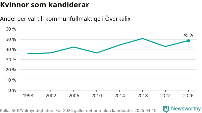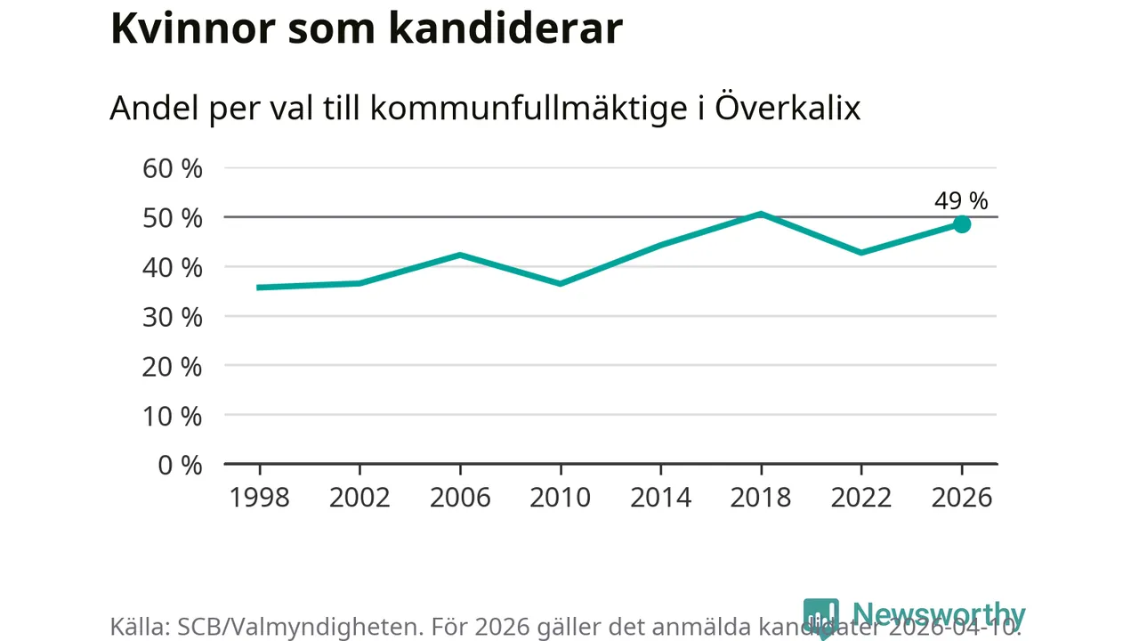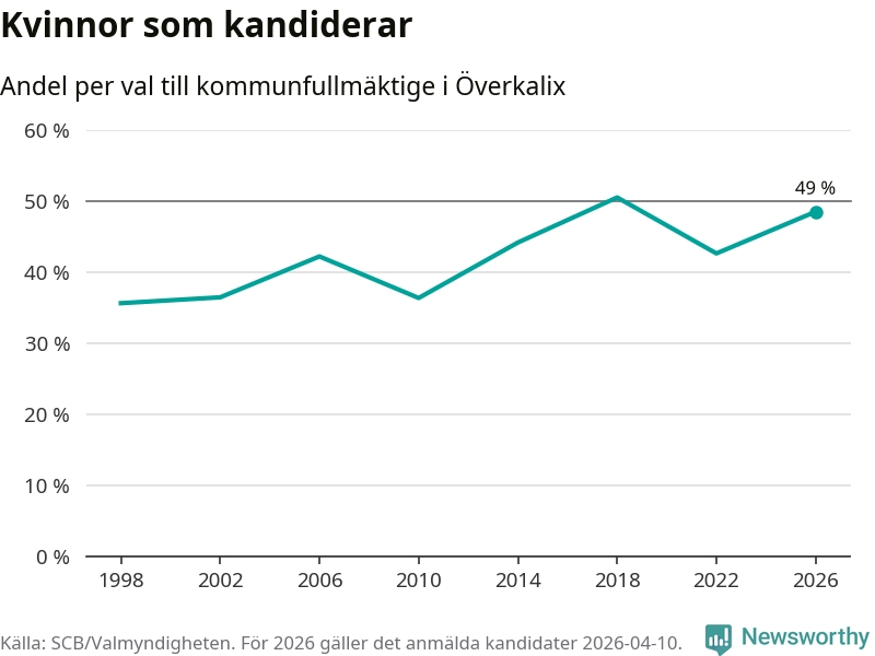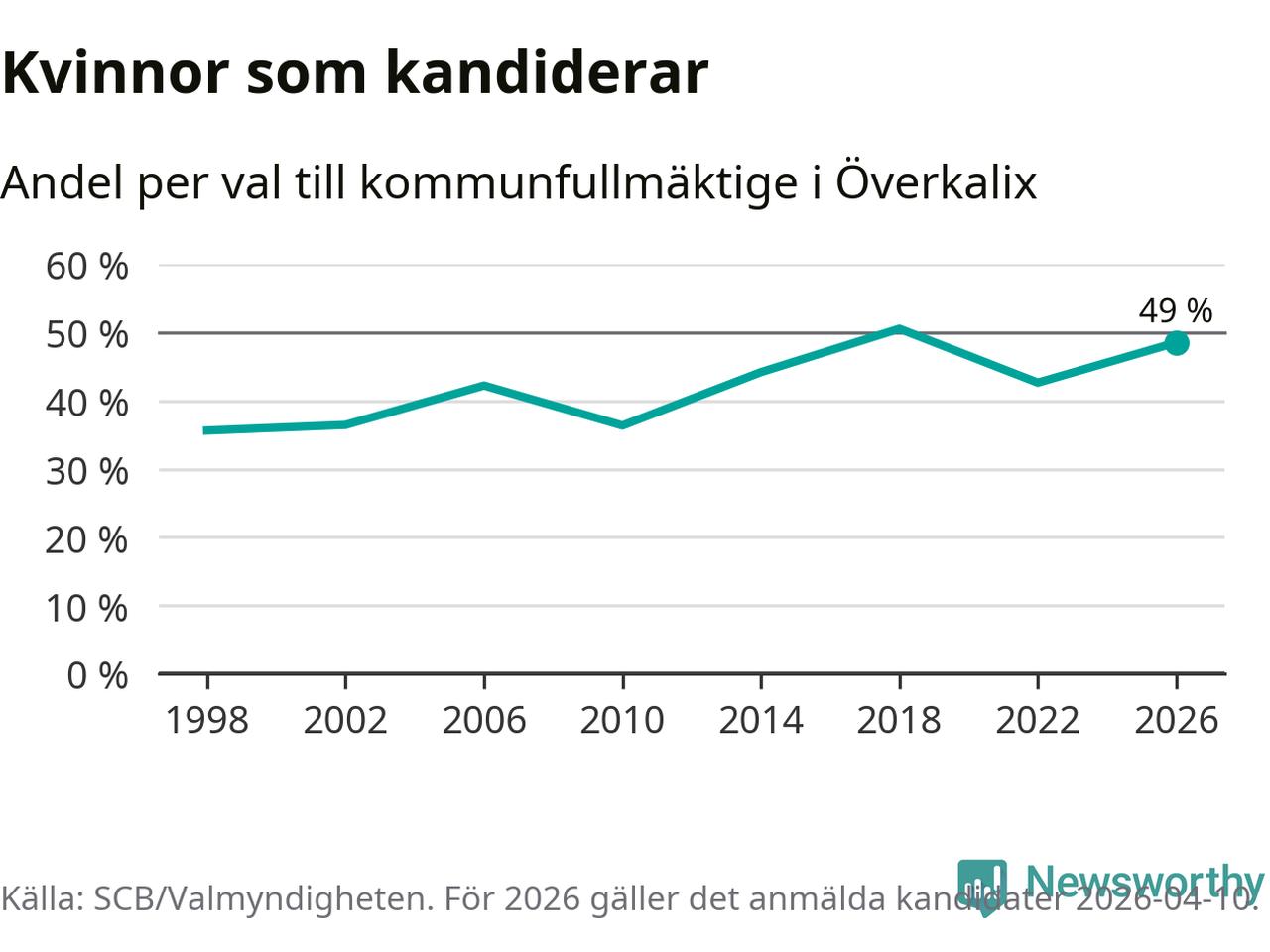 Kvinnorna utgör 49 procent av de hittills anmälda kandidaterna. Vid valet 2018 var 51 procent kvinnor, valet 1998 var motsvarande siffra 36 procent. Överkalix är en av 264 kommuner i landet där männen utgör en majoritet av kandidaterna på listorna.