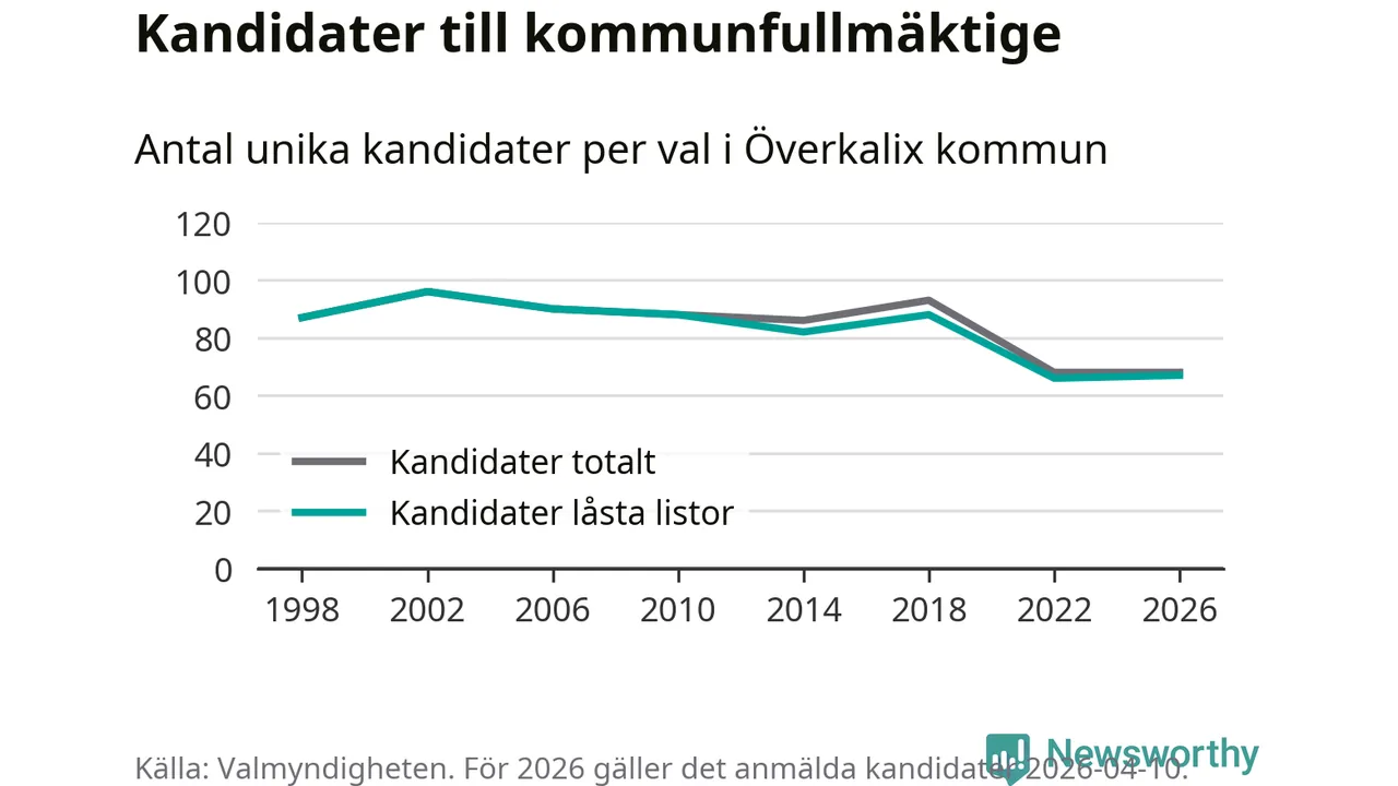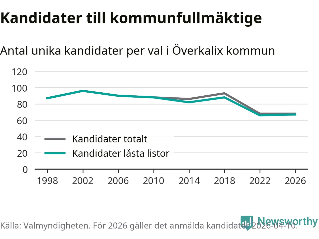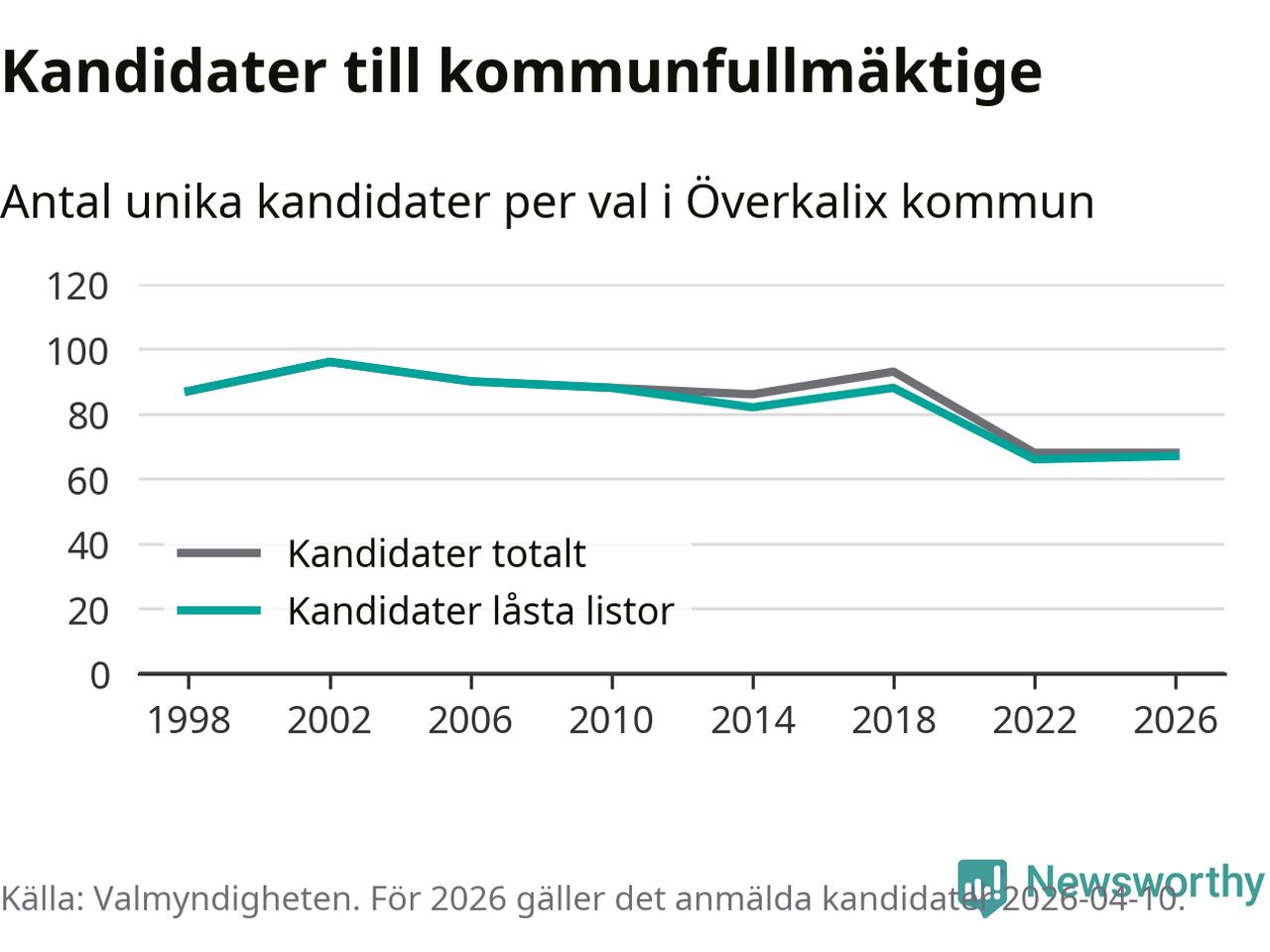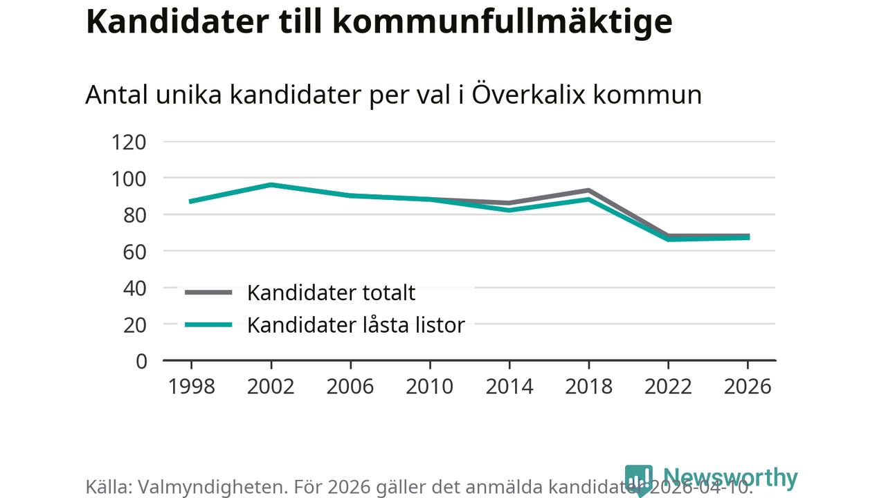 På torsdagen var det deadline för partier med låsta listor att registrera sina kandidater inför höstens val. Till valet till kommunfullmäktige i Överkalix är 67 kandidater anmälda på sådana listor, vilket är ett fler än i valet 2022.