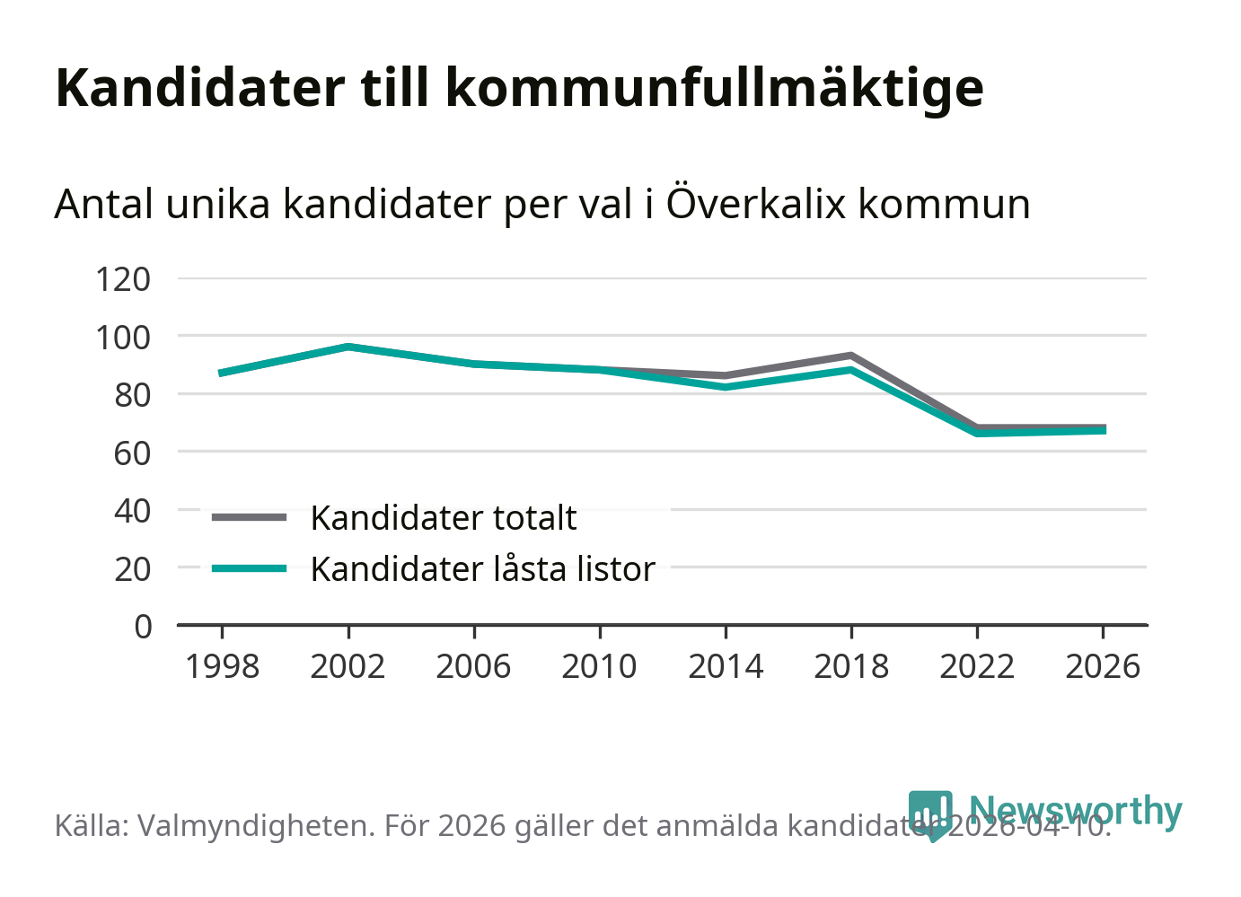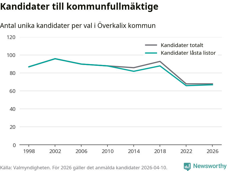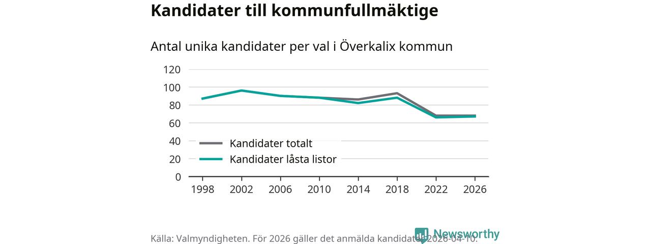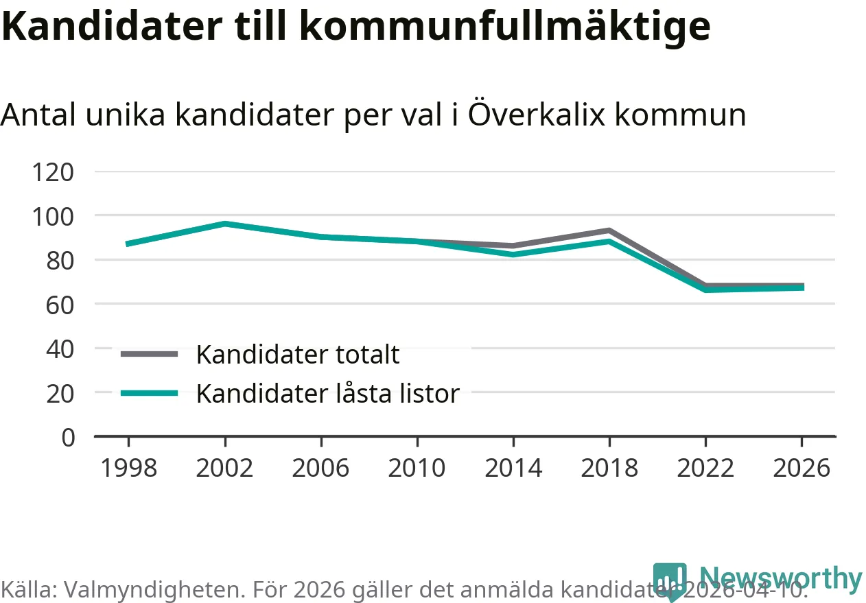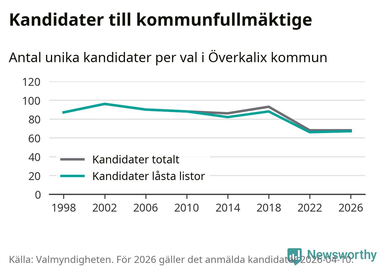 På torsdagen var det deadline för partier med låsta listor att registrera sina kandidater inför höstens val. Till valet till kommunfullmäktige i Överkalix är 67 kandidater anmälda på sådana listor, vilket är ett fler än i valet 2022.