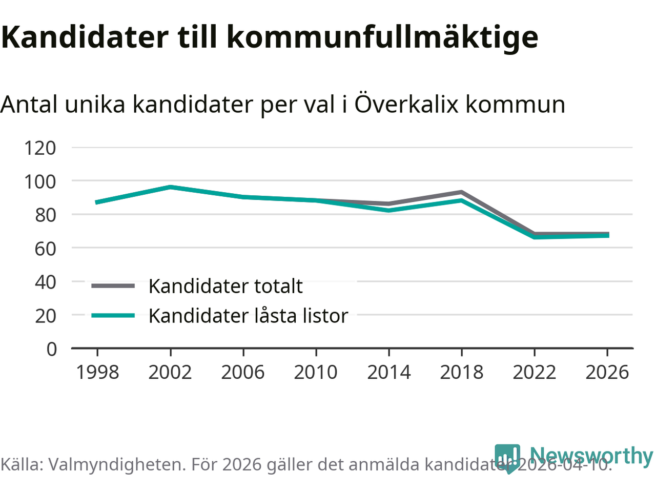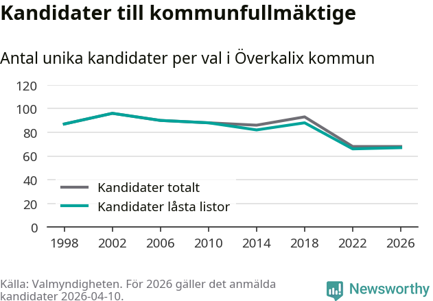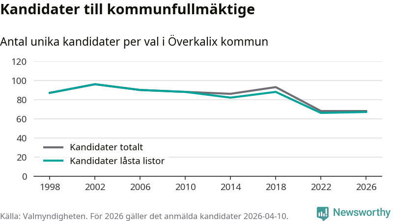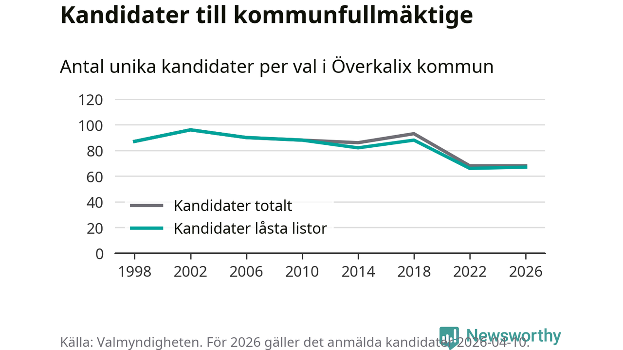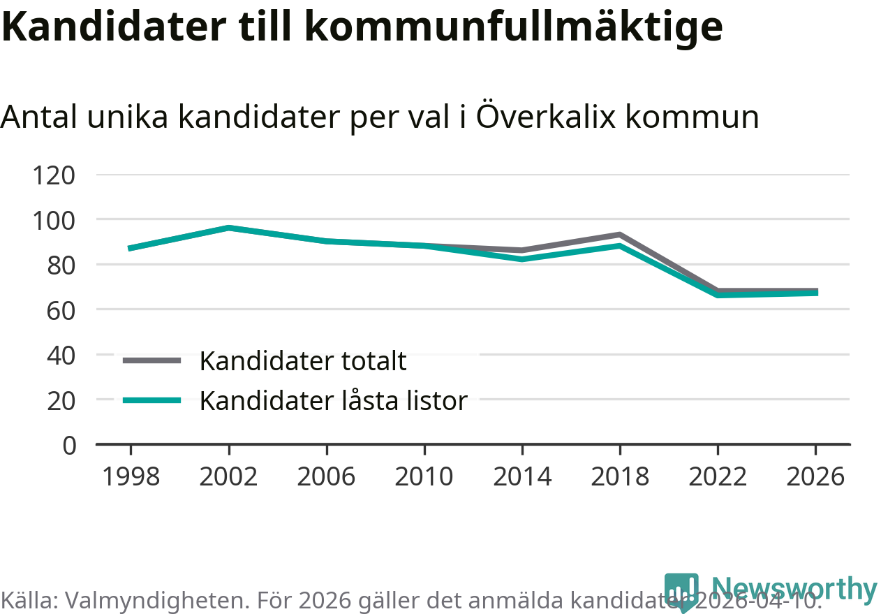 På torsdagen var det deadline för partier med låsta listor att registrera sina kandidater inför höstens val. Till valet till kommunfullmäktige i Överkalix är 67 kandidater anmälda på sådana listor, vilket är ett fler än i valet 2022.