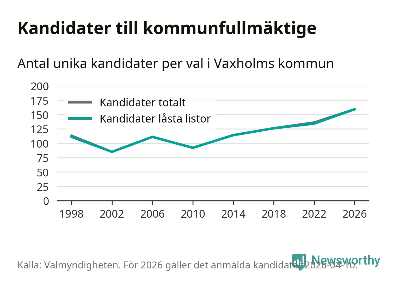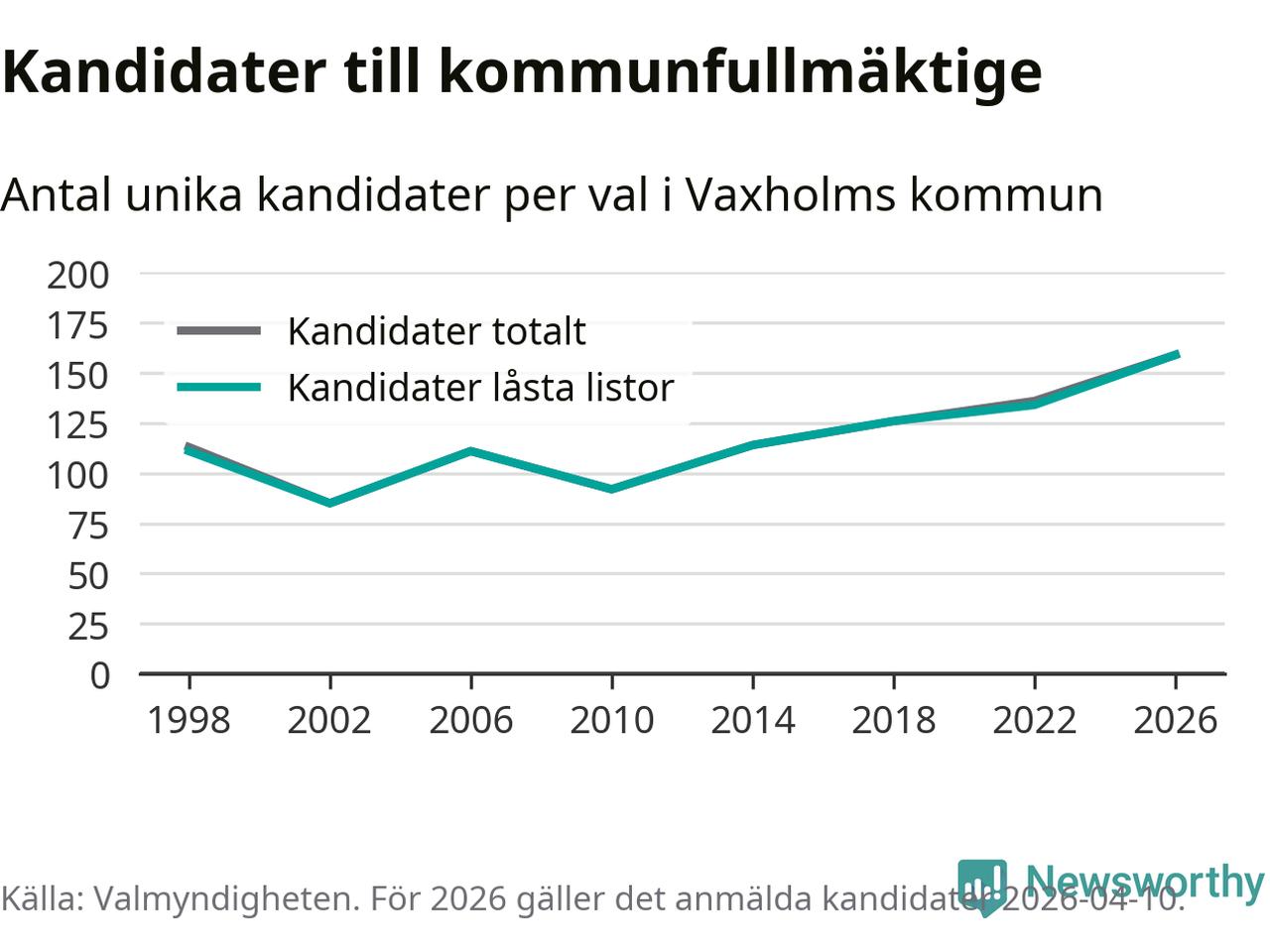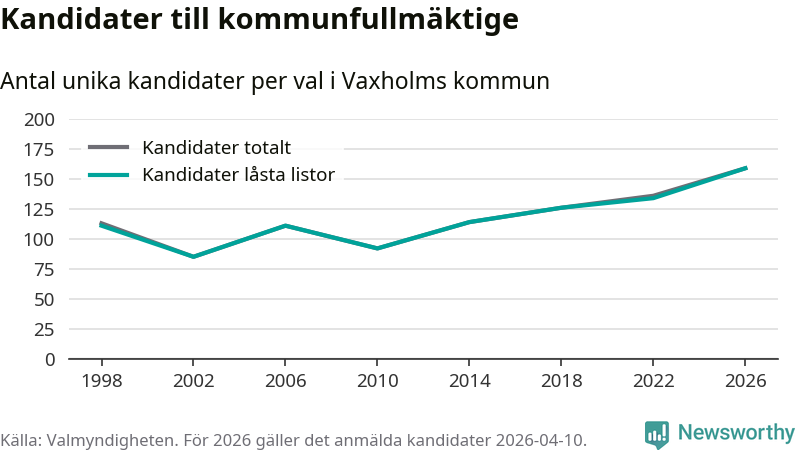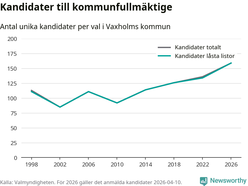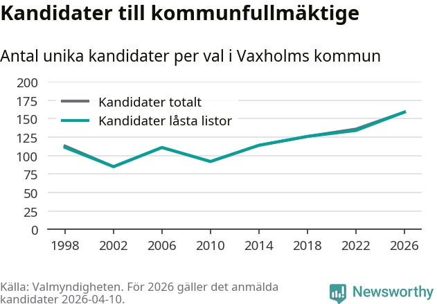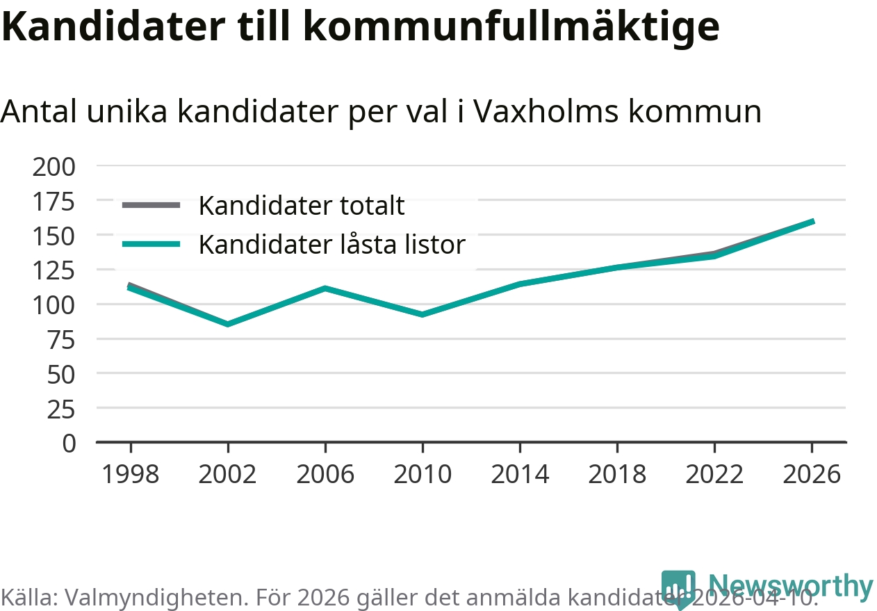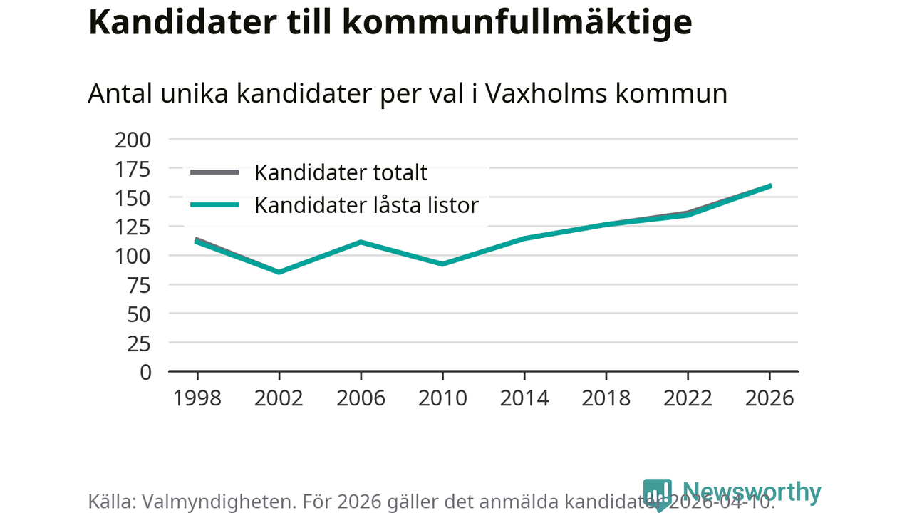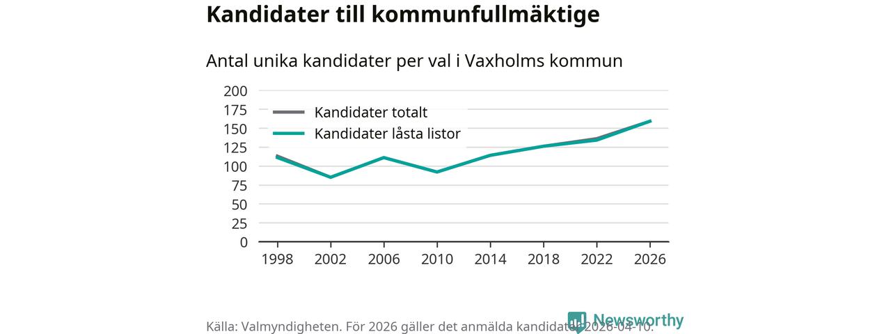 På torsdagen var det deadline för partier med låsta listor att registrera sina kandidater inför höstens val. Till valet till kommunfullmäktige i Vaxholm är 159 kandidater anmälda på sådana listor, vilket är 25 fler än i valet 2022. Det är den högsta siffran sedan åtminstone valet 1998, vilket är så långt tillbaka som vi har statistik för.