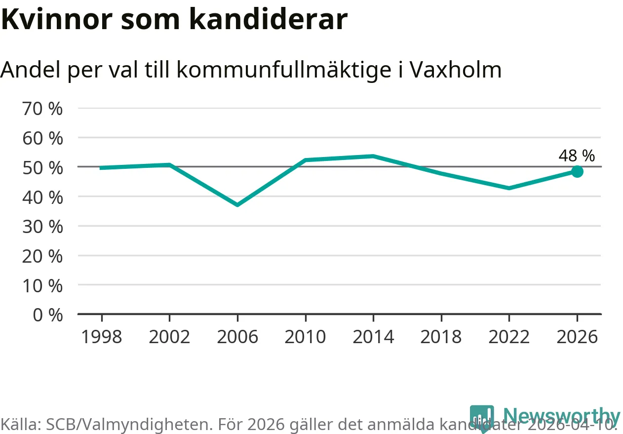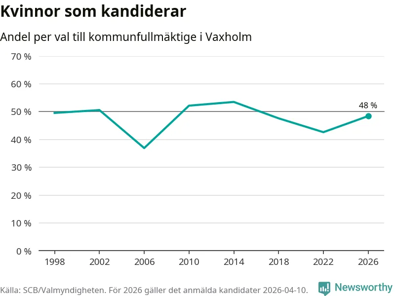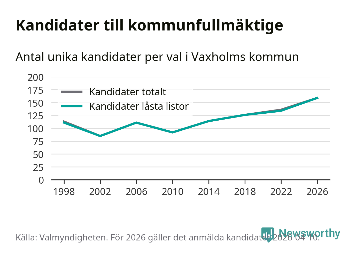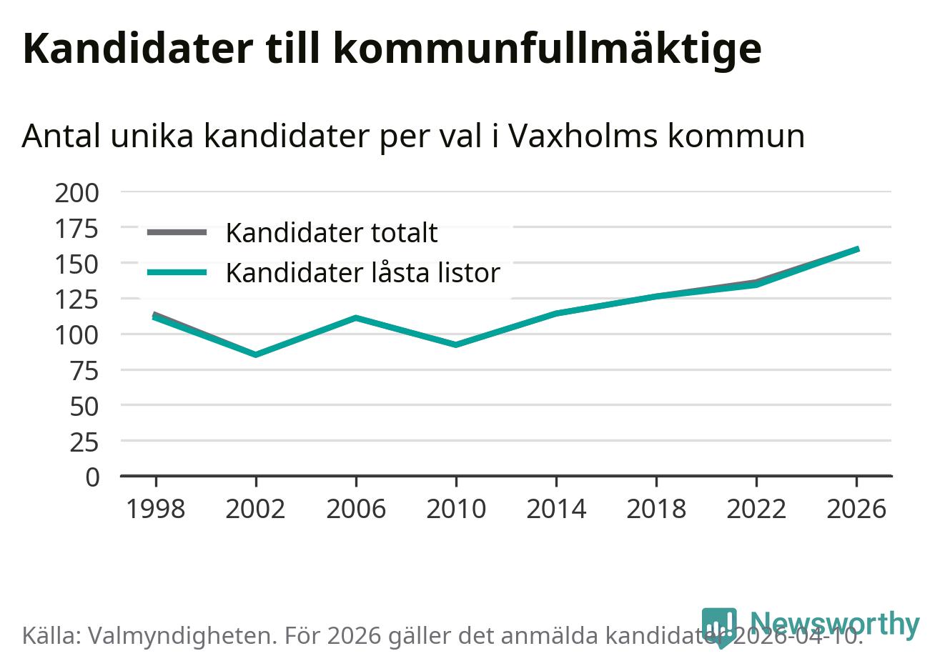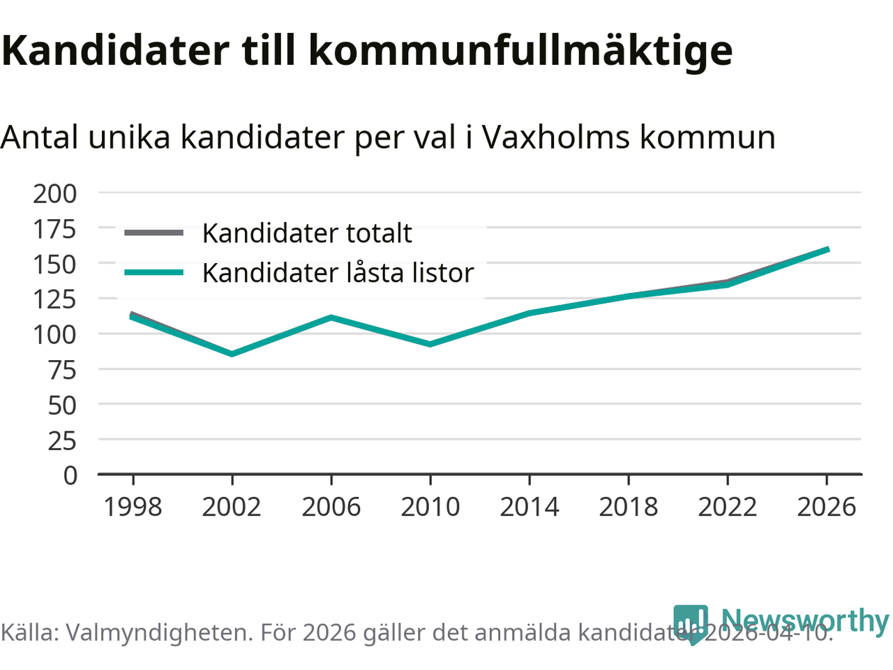 På torsdagen var det deadline för partier med låsta listor att registrera sina kandidater inför höstens val. Till valet till kommunfullmäktige i Vaxholm är 159 kandidater anmälda på sådana listor, vilket är 25 fler än i valet 2022. Det är den högsta siffran sedan åtminstone valet 1998, vilket är så långt tillbaka som vi har statistik för.