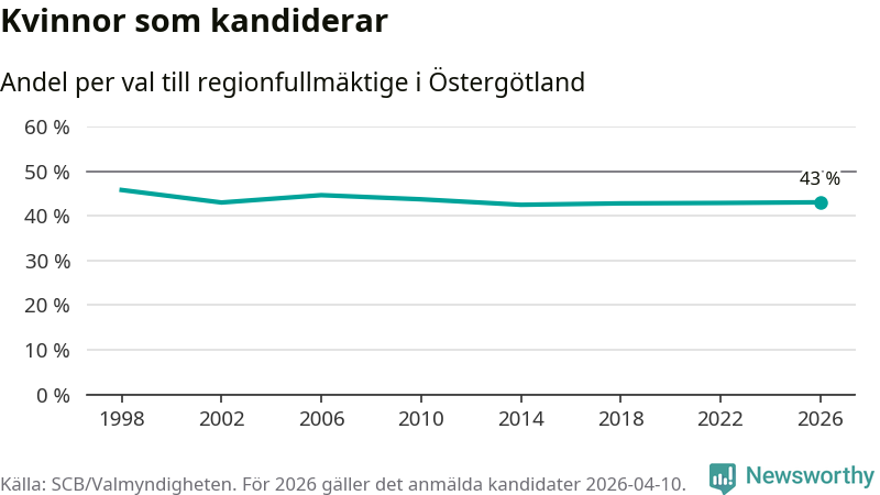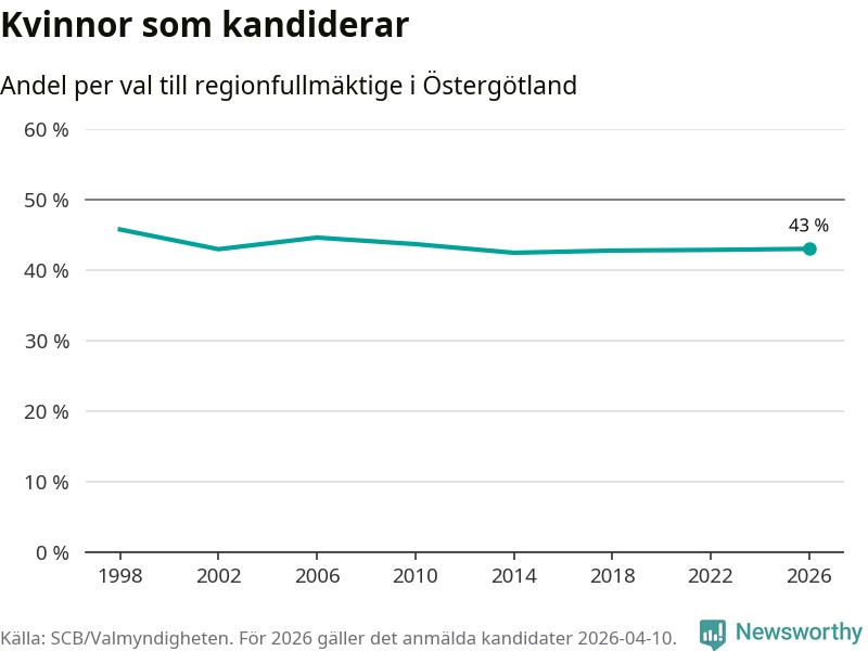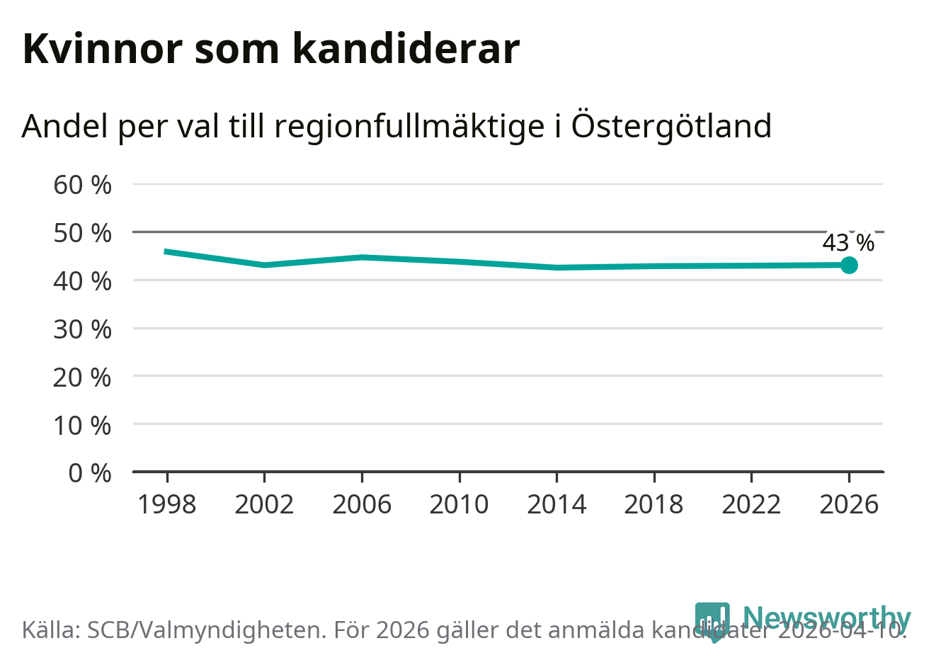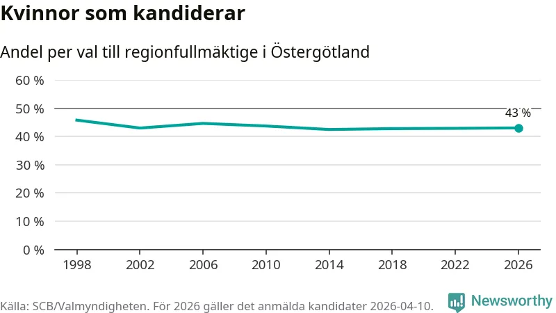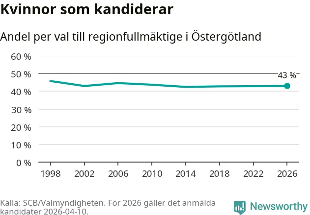 Kvinnorna utgör 43 procent av de hittills anmälda kandidaterna, vilket är den högsta andelen på listorna till regionfullmäktige i Region Östergötland sedan valet 2010. Andelen kvinnor har ökat i Region Östergötland under de senaste två valen och ökningen ser alltså ut att fortsätta i år. Östergötland är en av 20 regioner i landet där männen utgör en majoritet av kandidaterna på listorna.