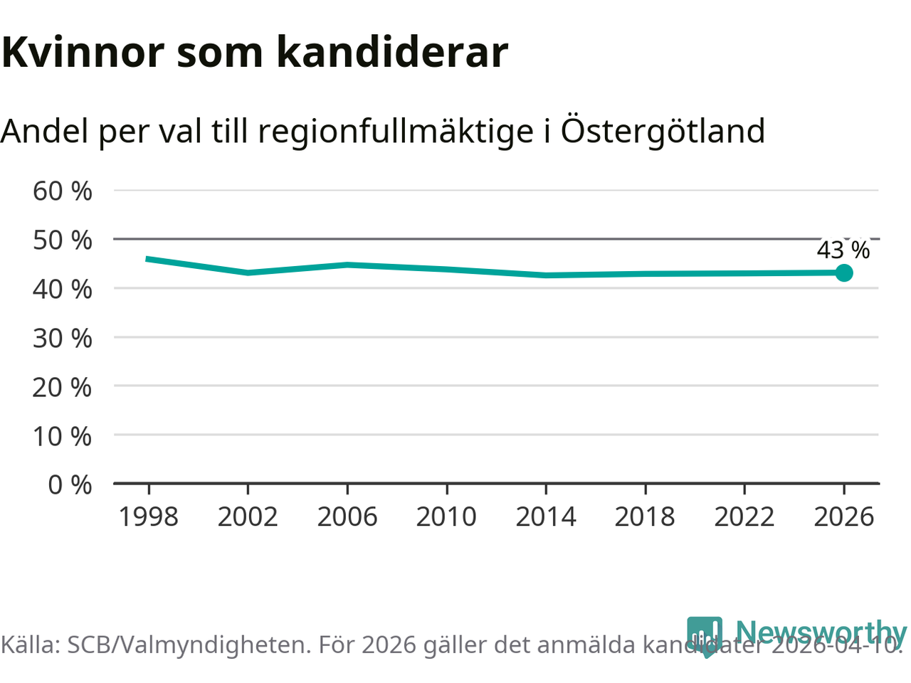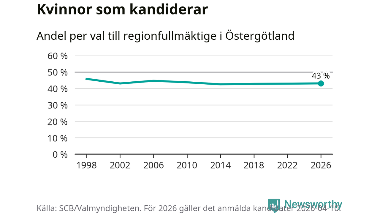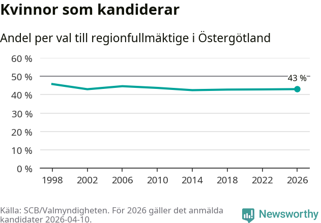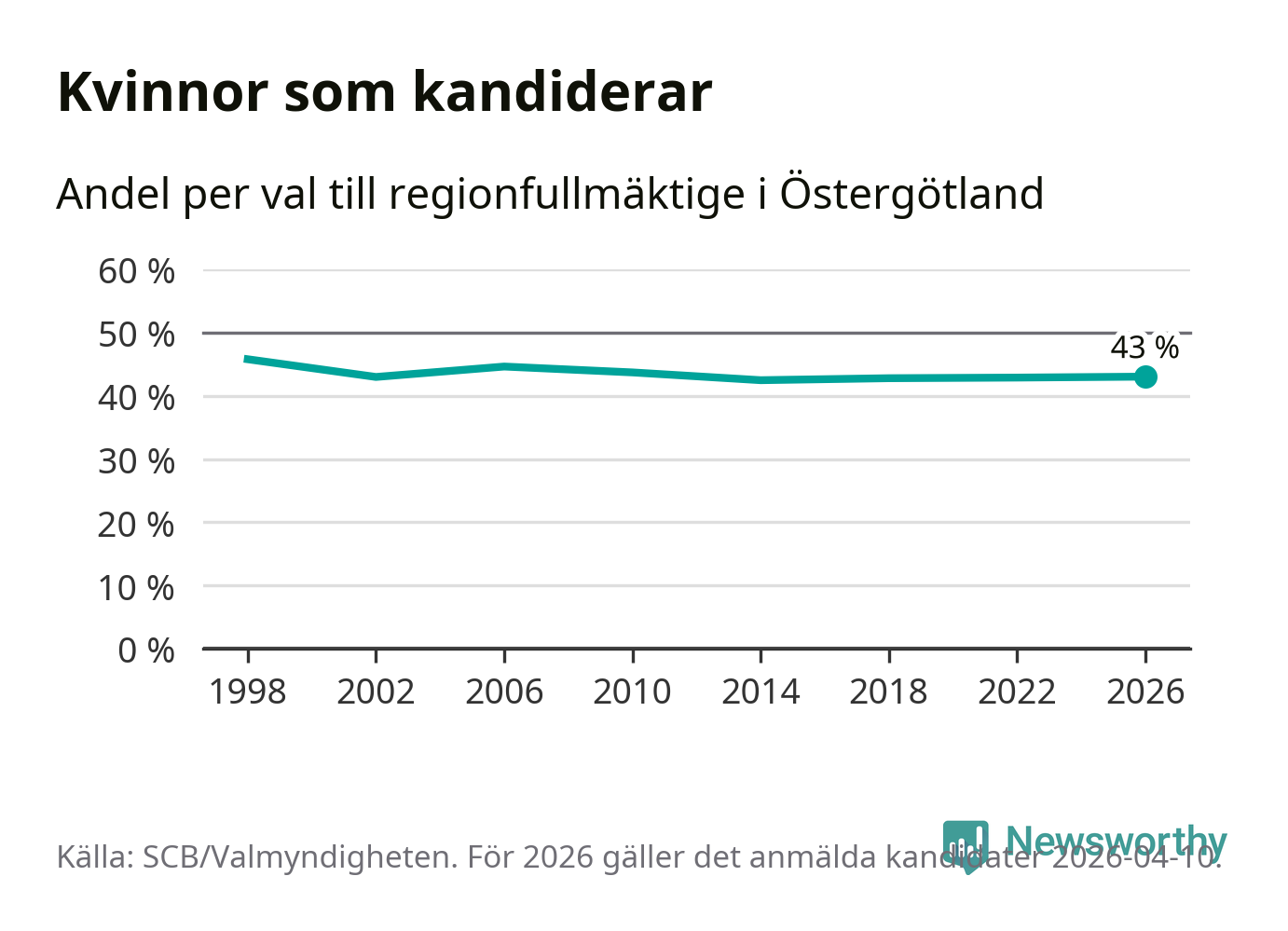Kvinnorna utgör 43 procent av de hittills anmälda kandidaterna, vilket är den högsta andelen på listorna till regionfullmäktige i Region Östergötland sedan valet 2010. Andelen kvinnor har ökat i Region Östergötland under de senaste två valen och ökningen ser alltså ut att fortsätta i år. Östergötland är en av 20 regioner i landet där männen utgör en majoritet av kandidaterna på listorna.