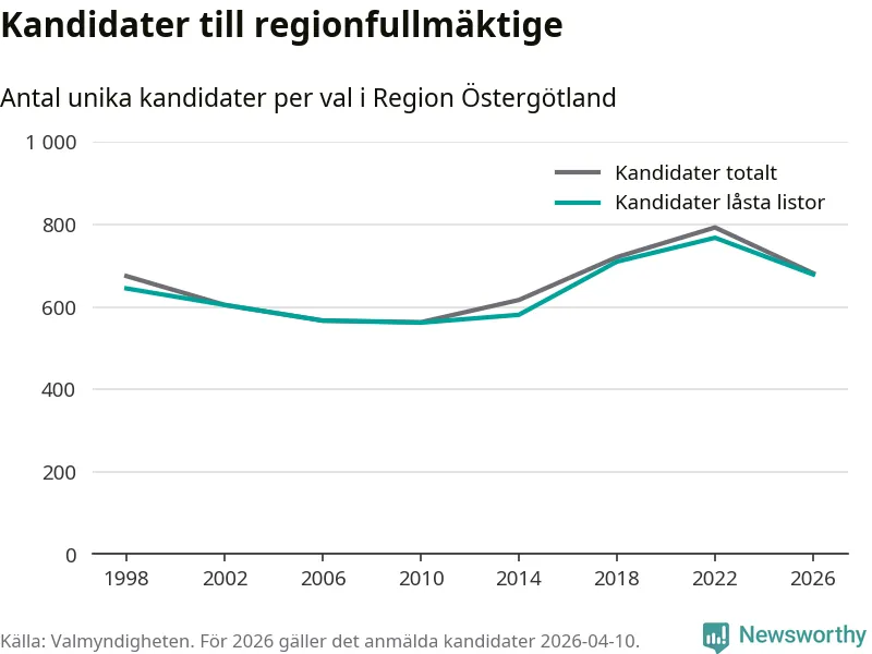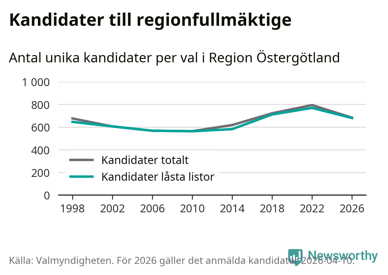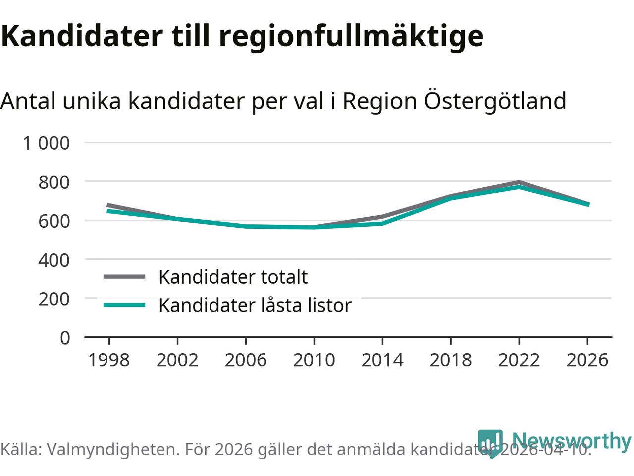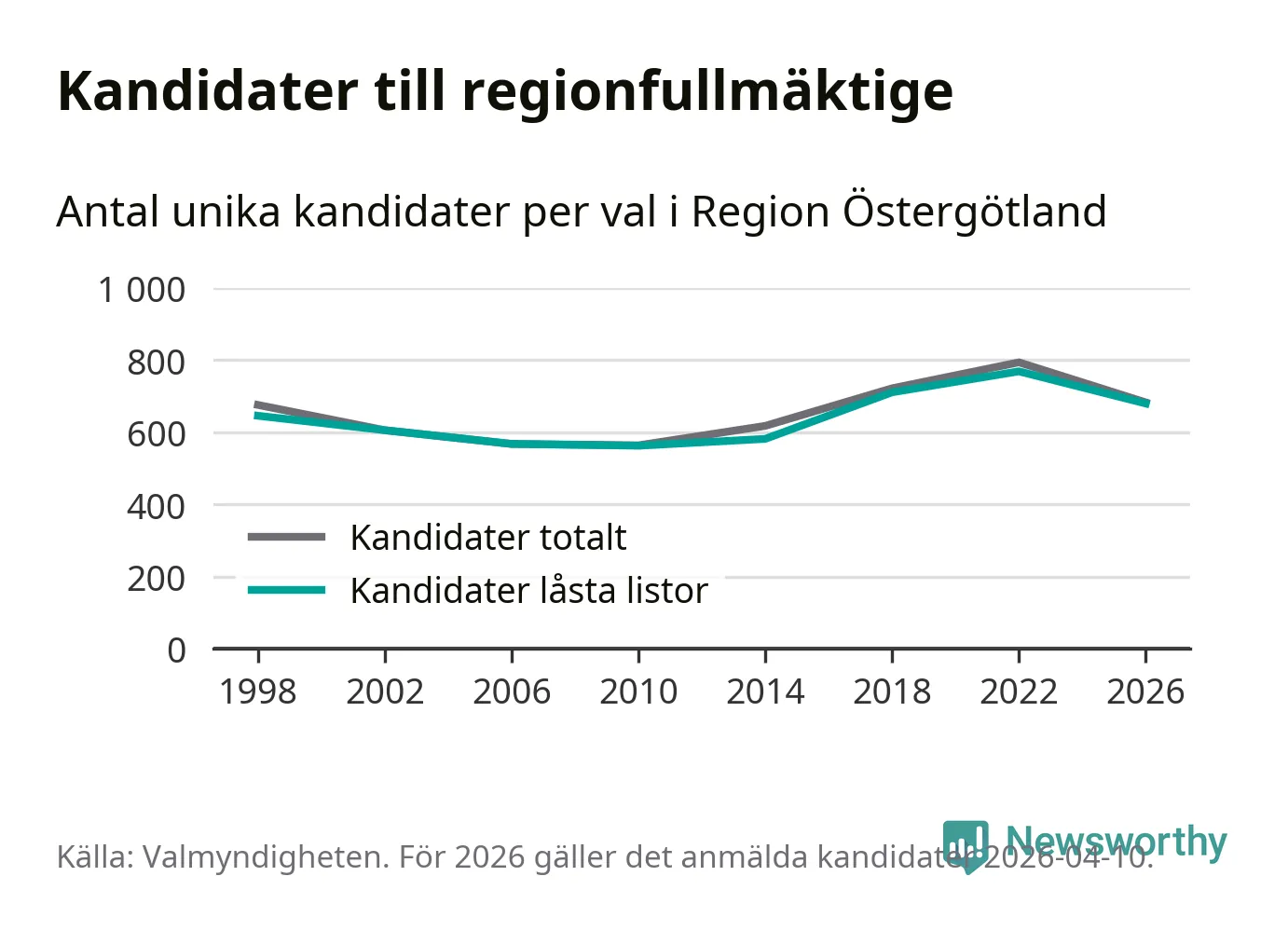På torsdagen var det deadline för partier med låsta listor att registrera sina kandidater inför höstens val. Till valet till regionfullmäktige i Region Östergötland är 679 kandidater anmälda på sådana listor, vilket är 89 färre än i valet 2022.
