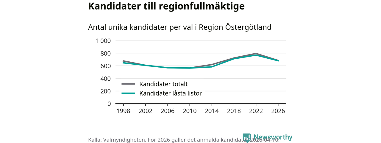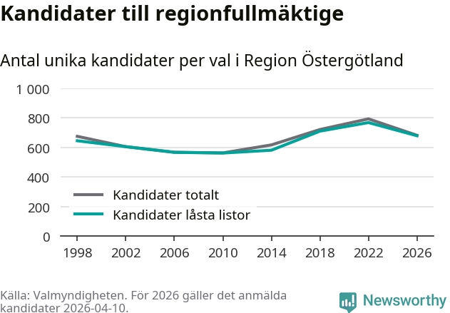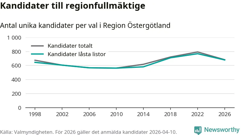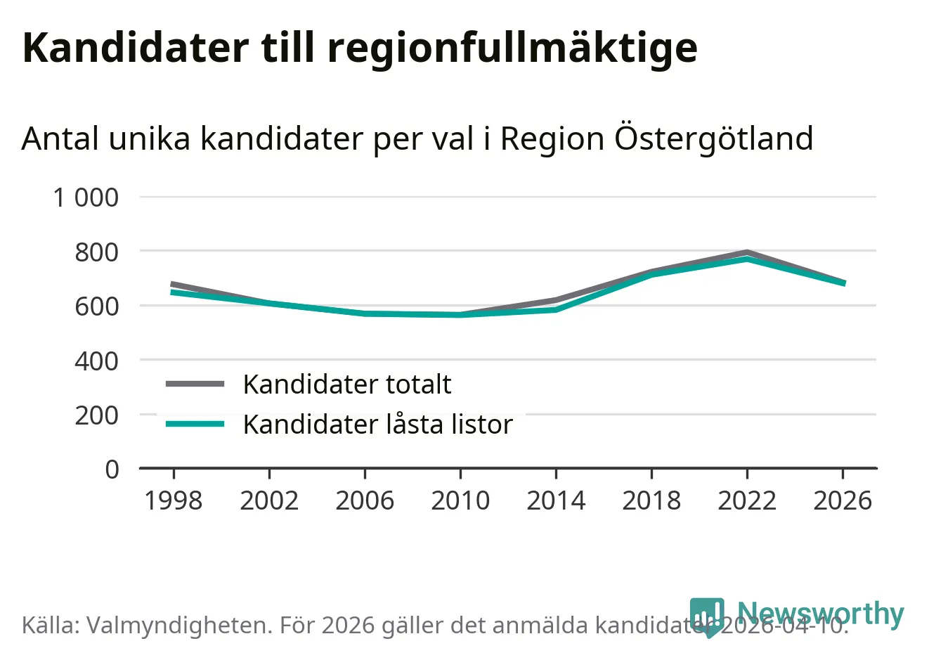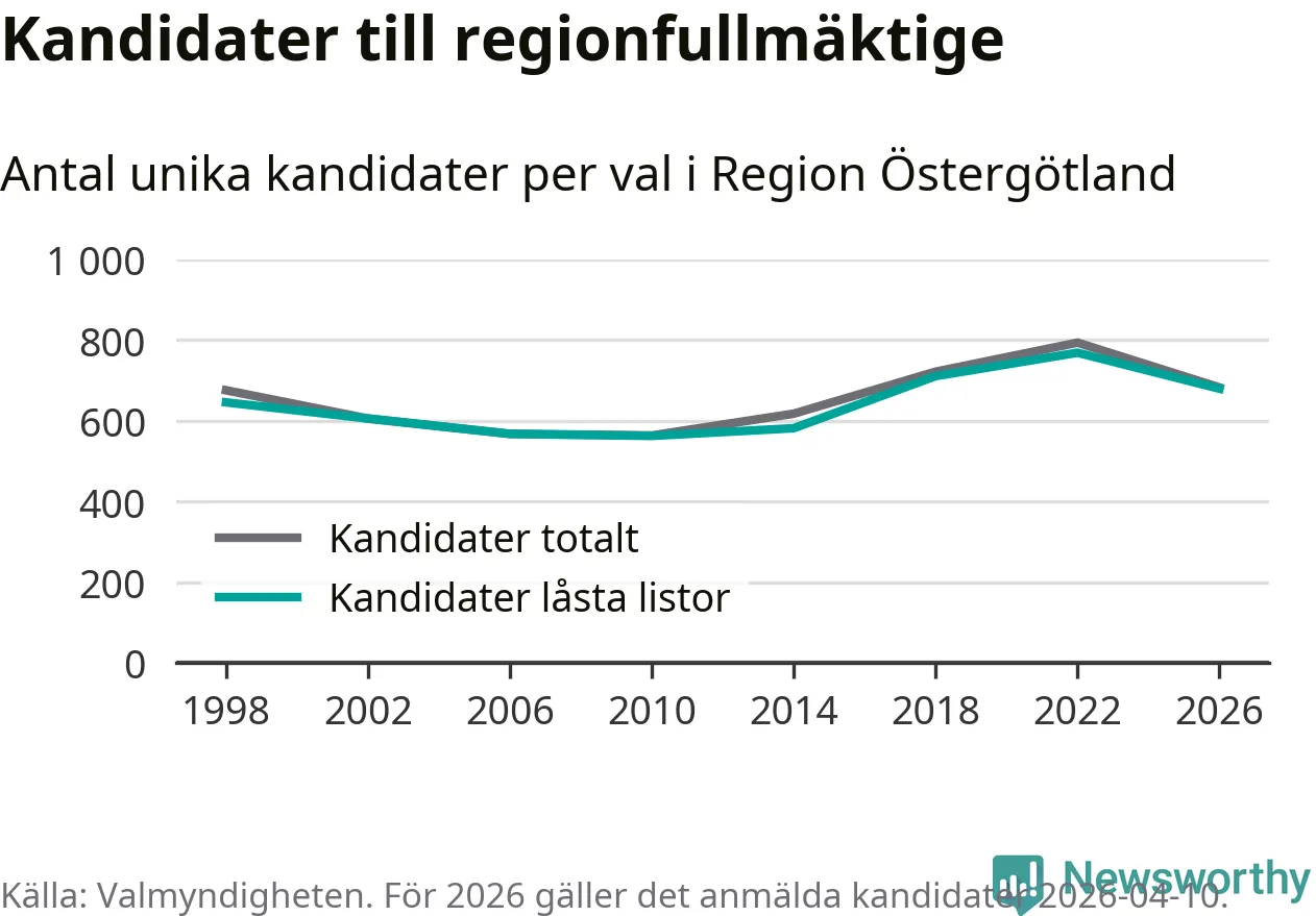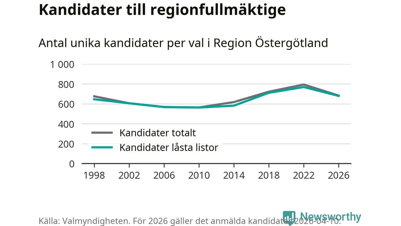 På torsdagen var det deadline för partier med låsta listor att registrera sina kandidater inför höstens val. Till valet till regionfullmäktige i Region Östergötland är 679 kandidater anmälda på sådana listor, vilket är 89 färre än i valet 2022.