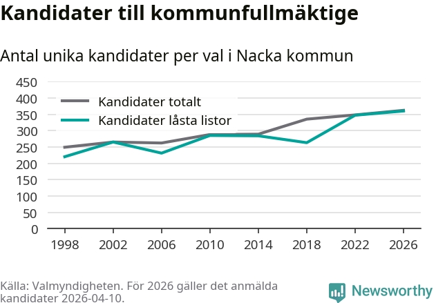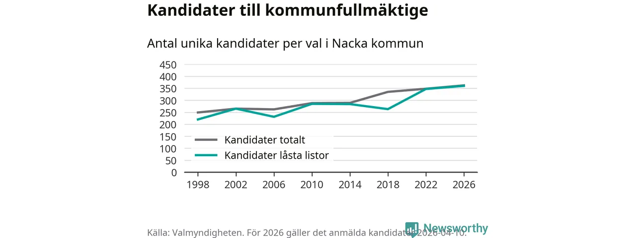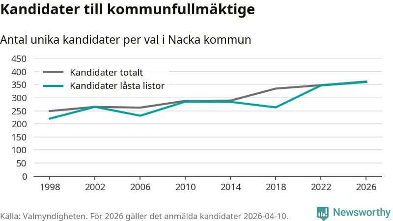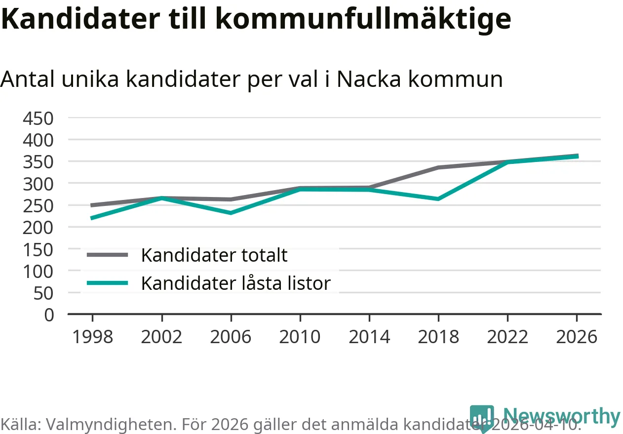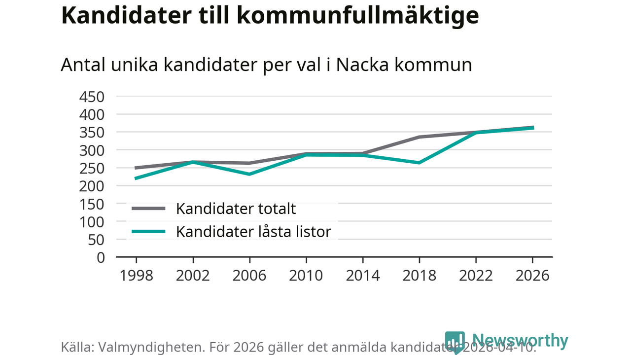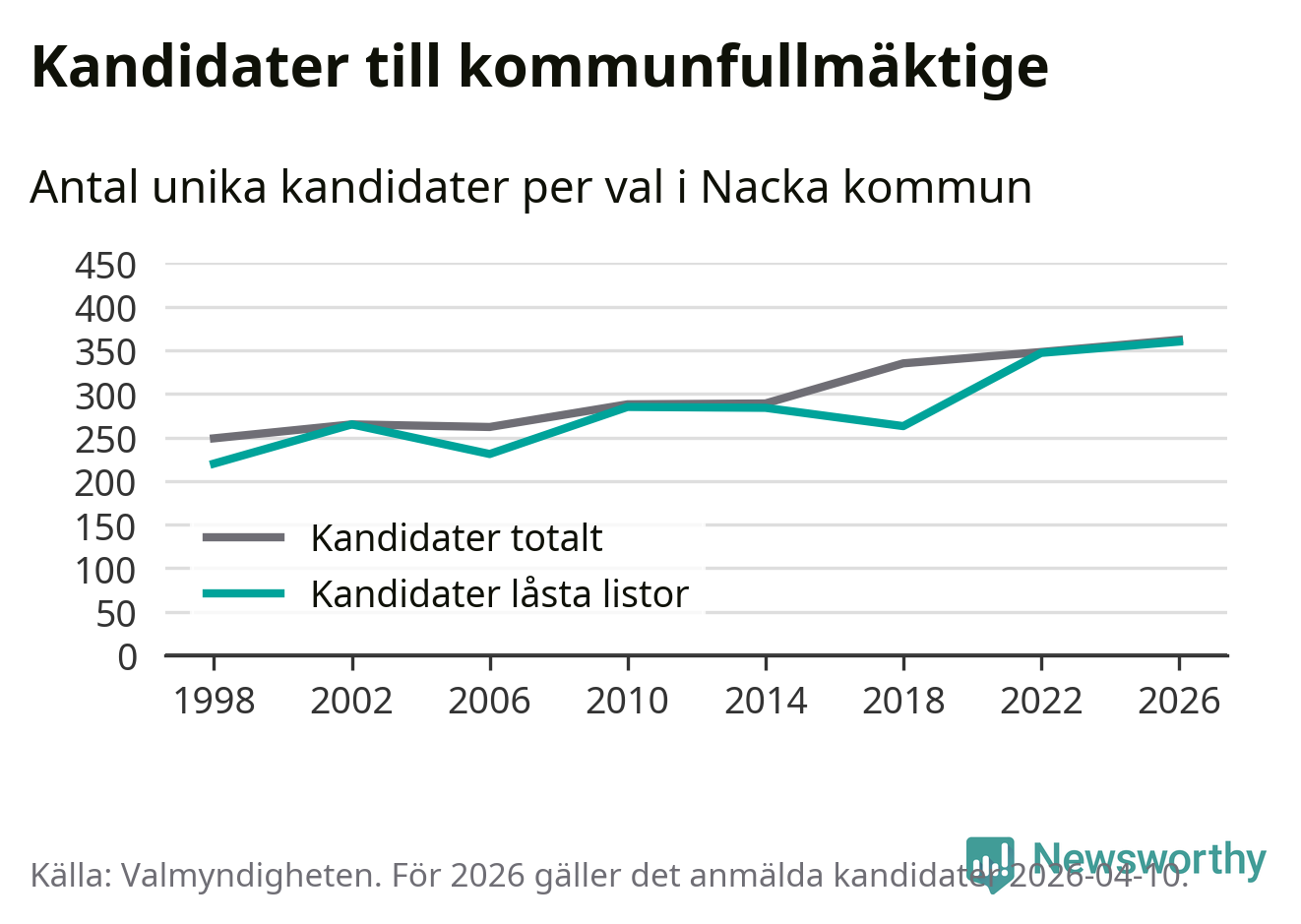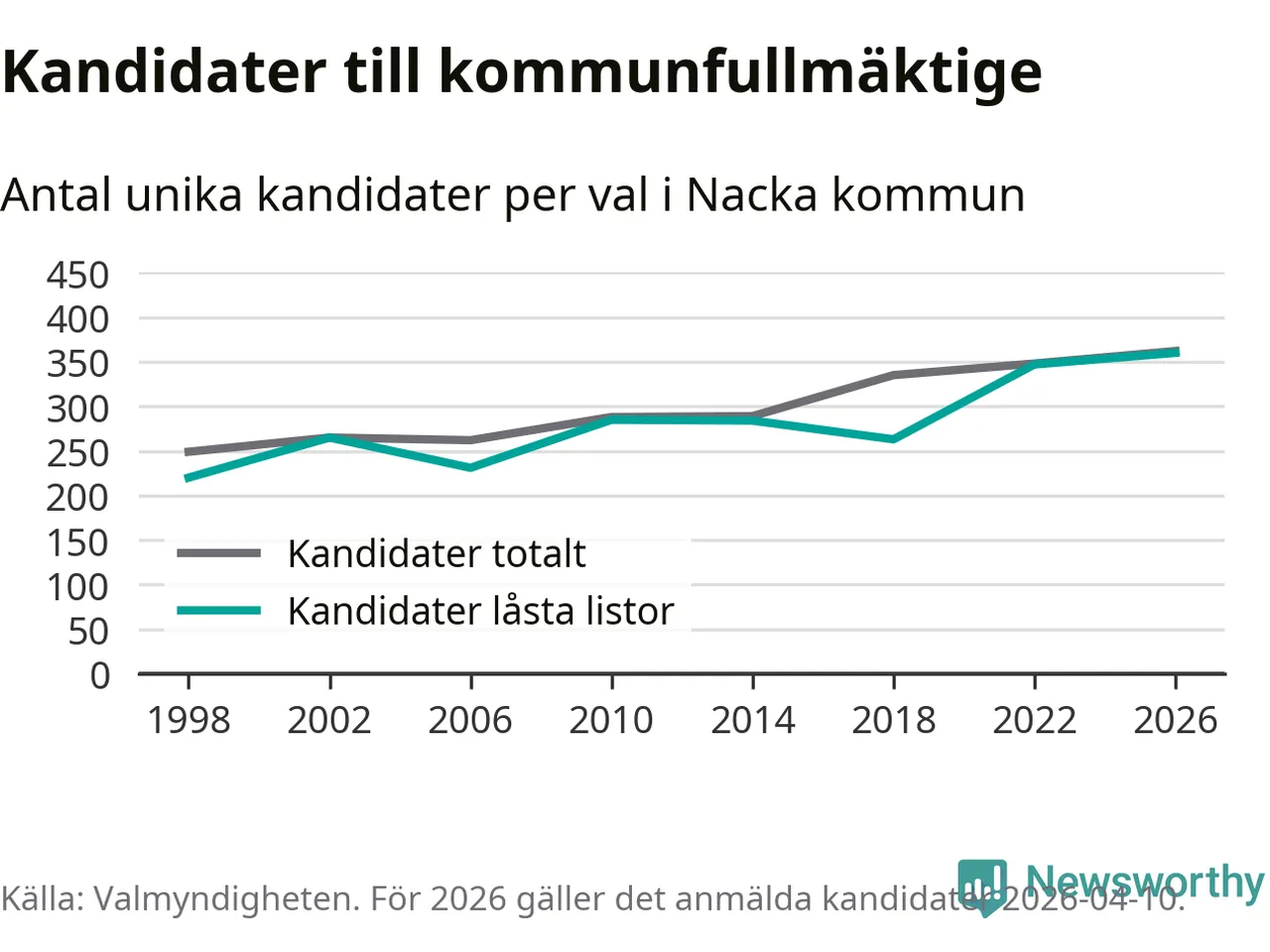 På torsdagen var det deadline för partier med låsta listor att registrera sina kandidater inför höstens val. Till valet till kommunfullmäktige i Nacka är 360 kandidater anmälda på sådana listor, vilket är 13 fler än i valet 2022. Det är den högsta siffran sedan åtminstone valet 1998, vilket är så långt tillbaka som vi har statistik för.