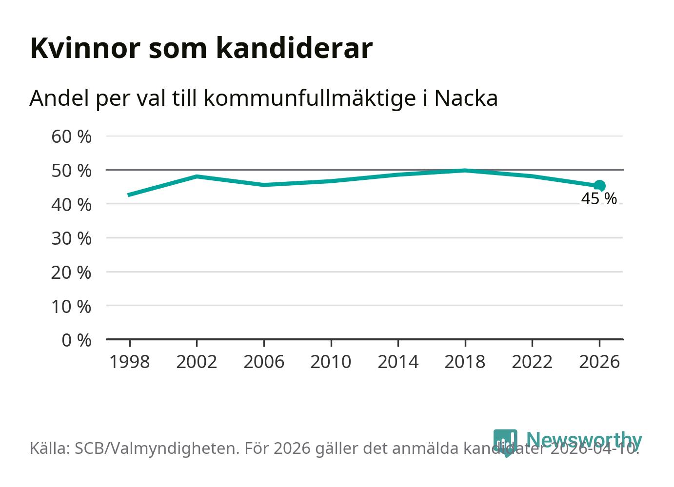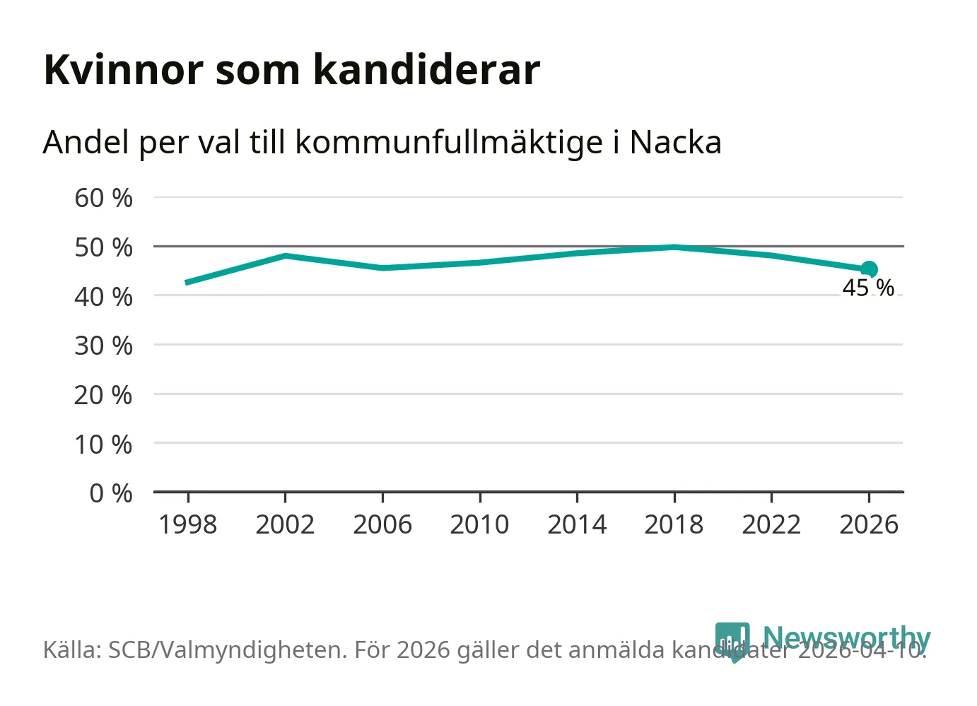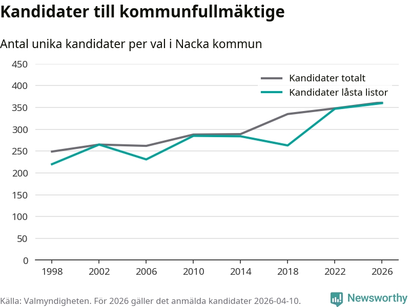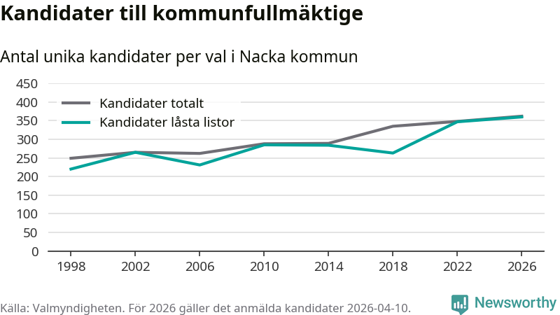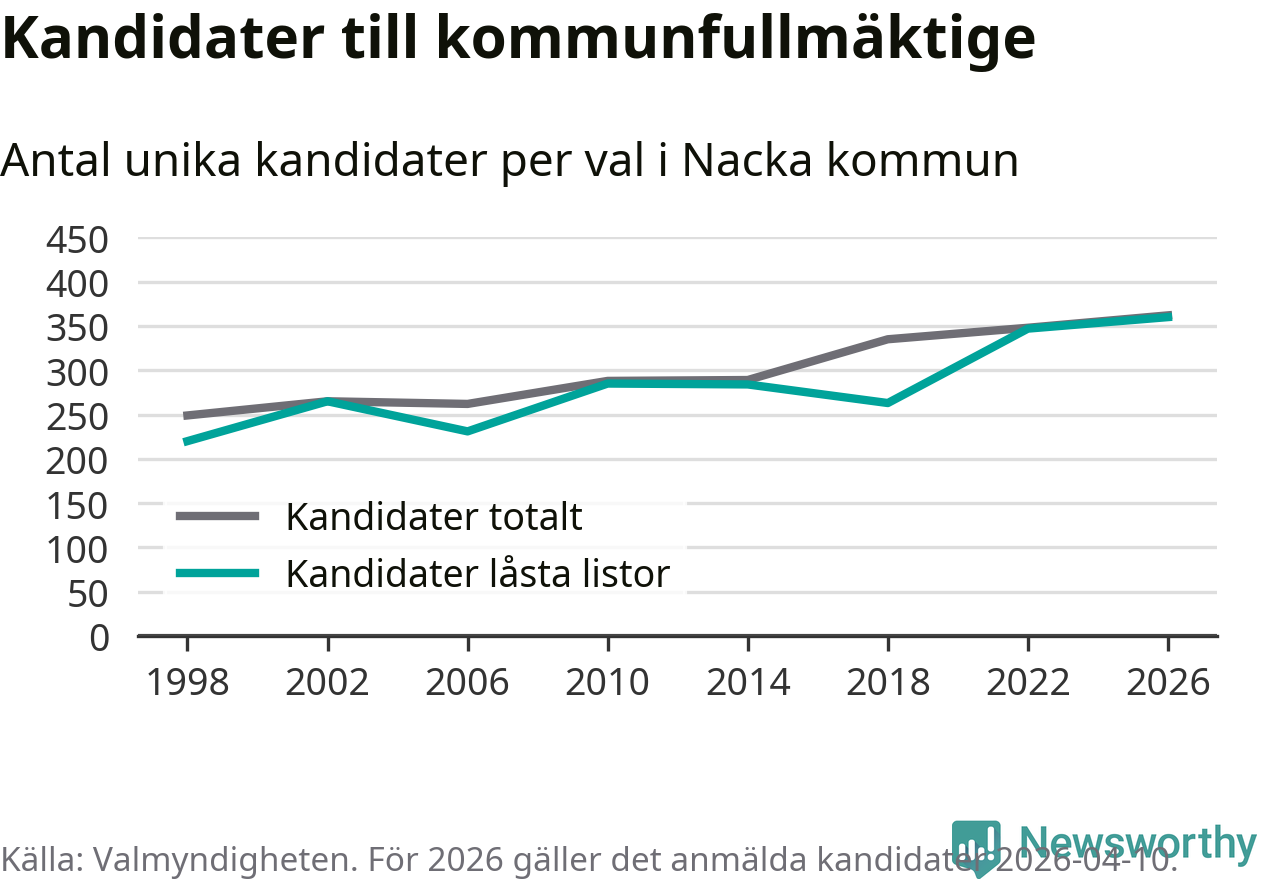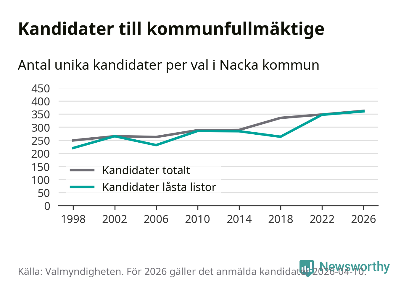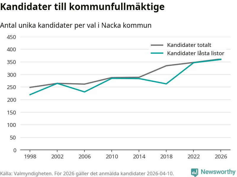 På torsdagen var det deadline för partier med låsta listor att registrera sina kandidater inför höstens val. Till valet till kommunfullmäktige i Nacka är 360 kandidater anmälda på sådana listor, vilket är 13 fler än i valet 2022. Det är den högsta siffran sedan åtminstone valet 1998, vilket är så långt tillbaka som vi har statistik för.