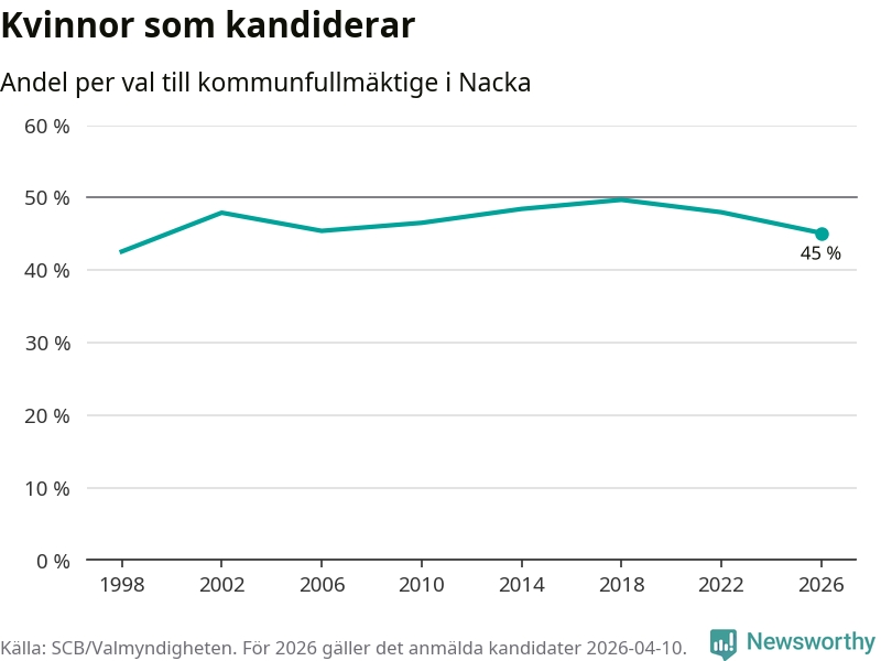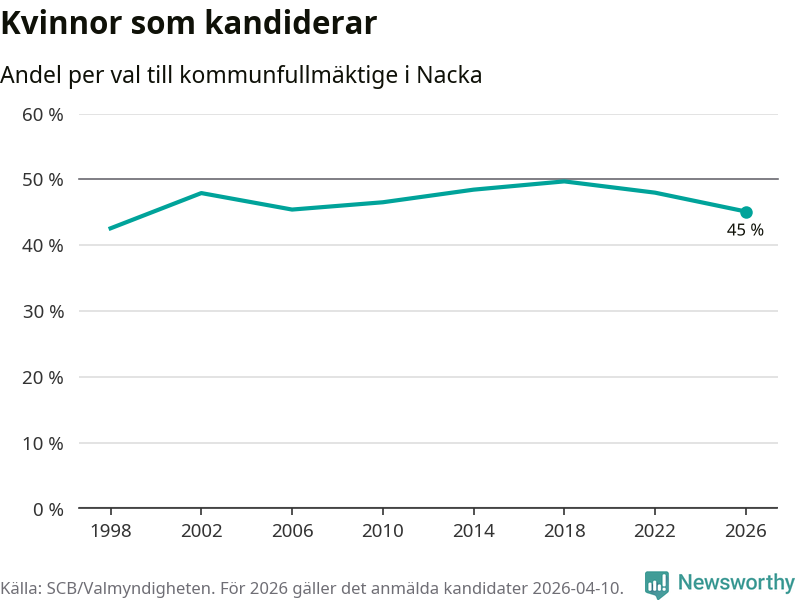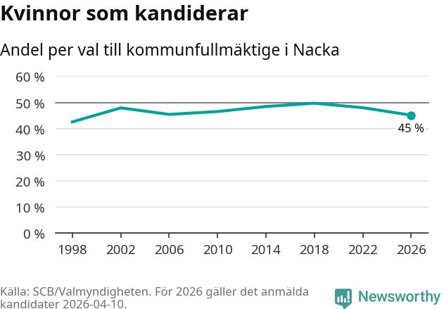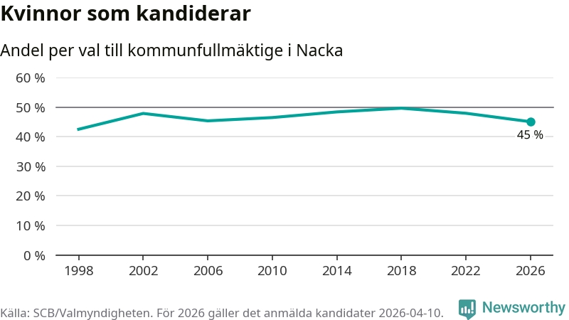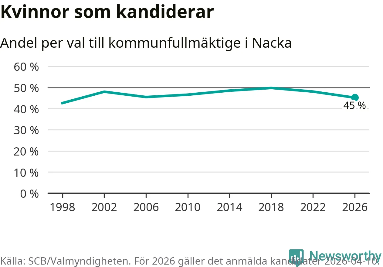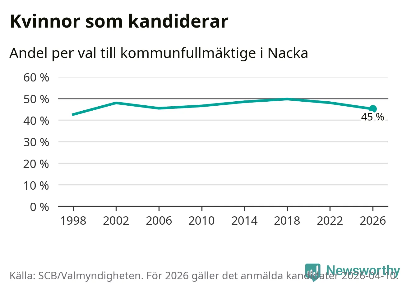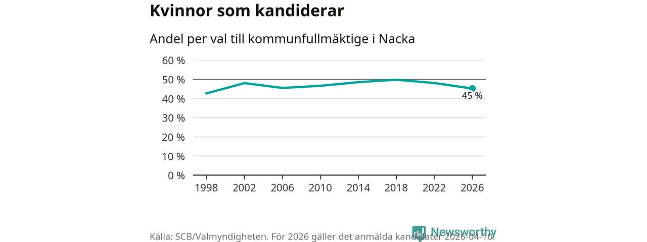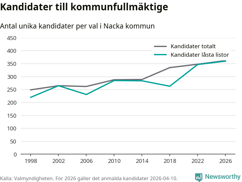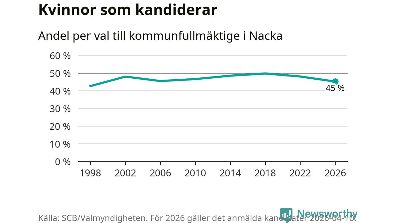 På torsdagen var det deadline för partier med låsta listor att registrera sina kandidater inför höstens val. Till valet till kommunfullmäktige i Nacka är 360 kandidater anmälda på sådana listor, vilket är 13 fler än i valet 2022. Det är den högsta siffran sedan åtminstone valet 1998, vilket är så långt tillbaka som vi har statistik för.