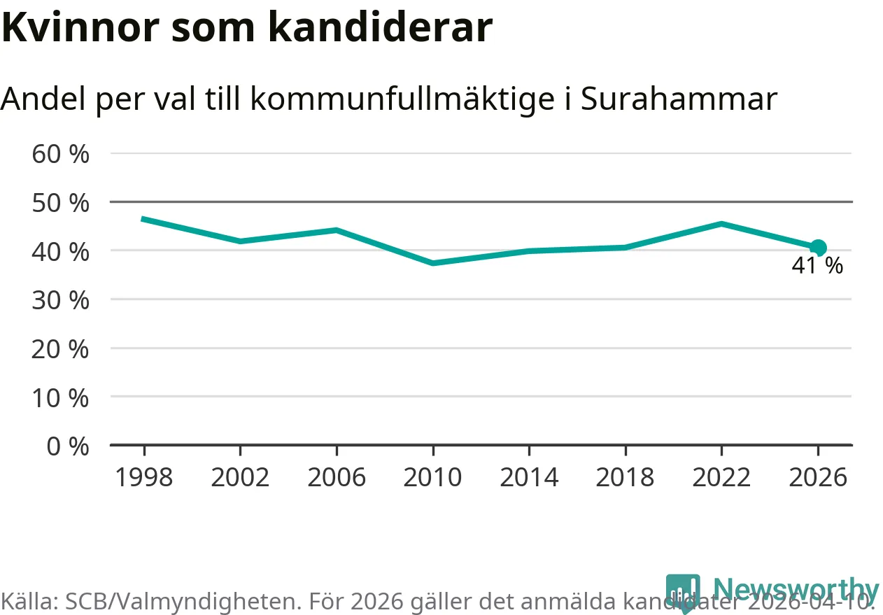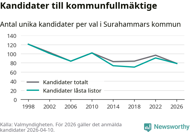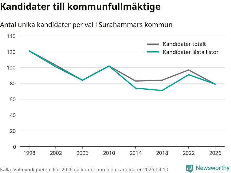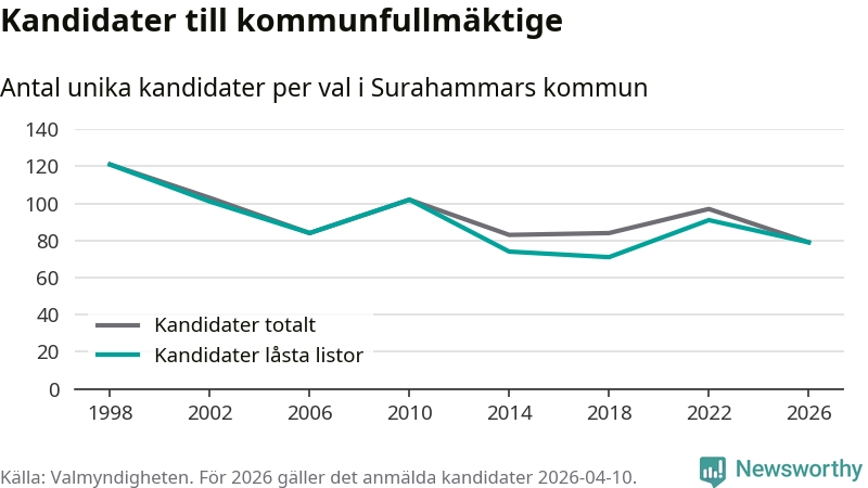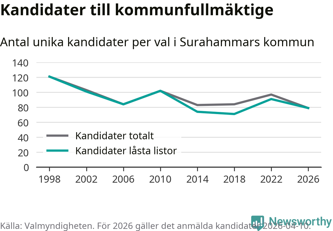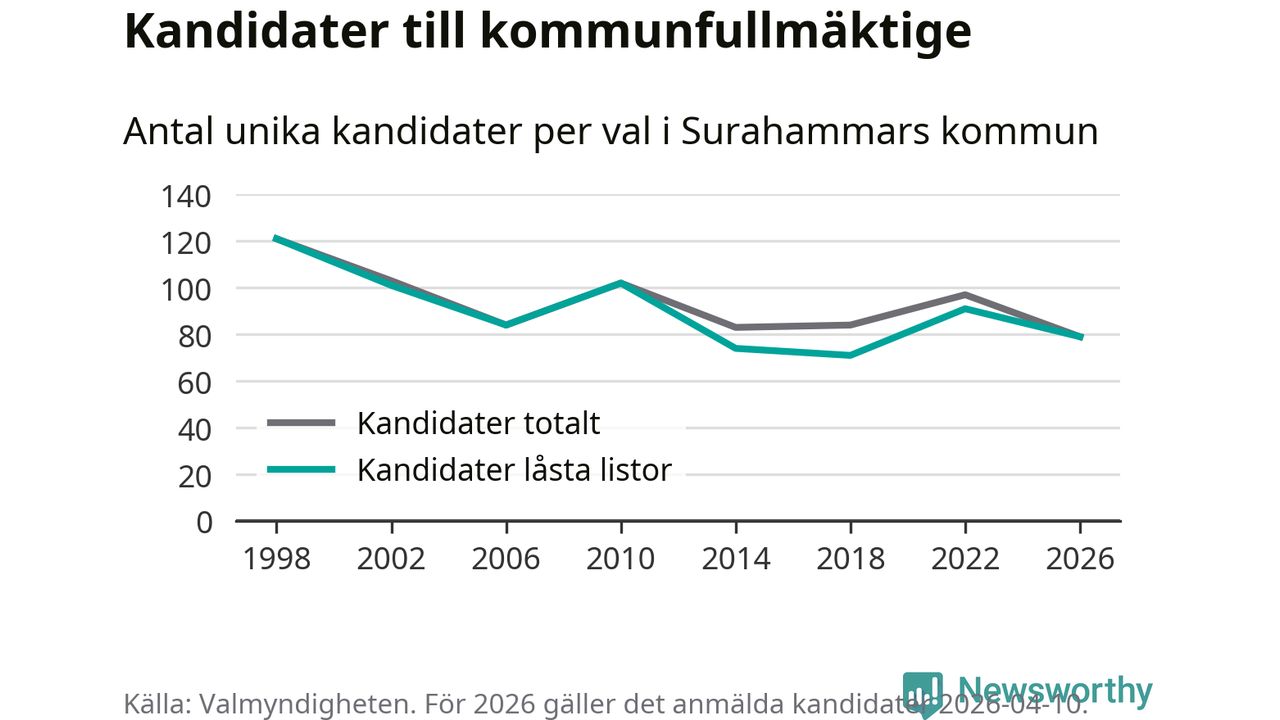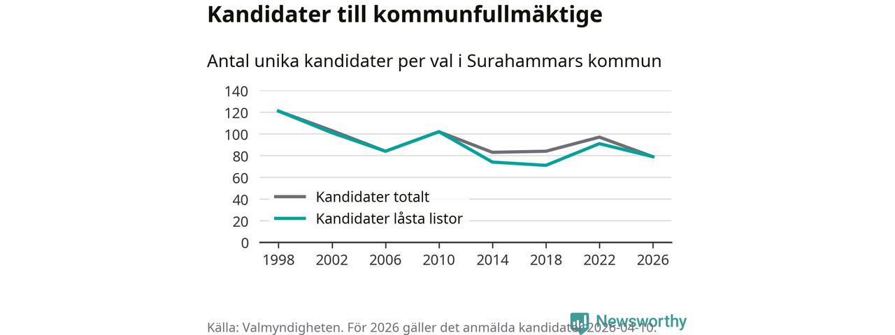 På torsdagen var det deadline för partier med låsta listor att registrera sina kandidater inför höstens val. Till valet till kommunfullmäktige i Surahammar är 79 kandidater anmälda på sådana listor, vilket är tolv färre än i valet 2022.
