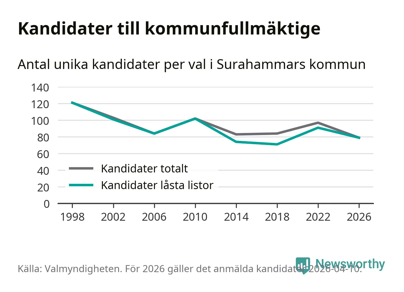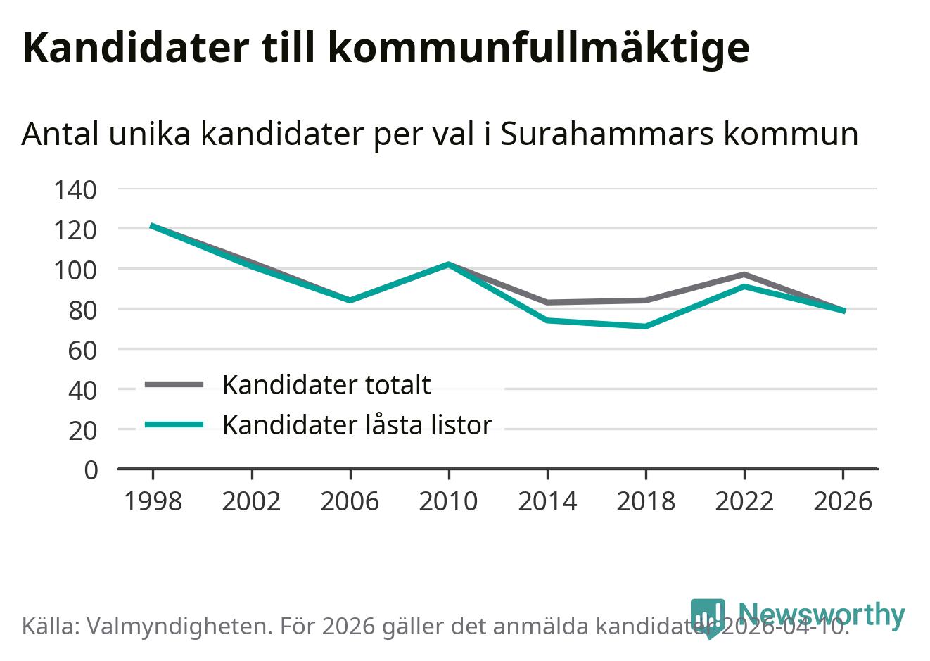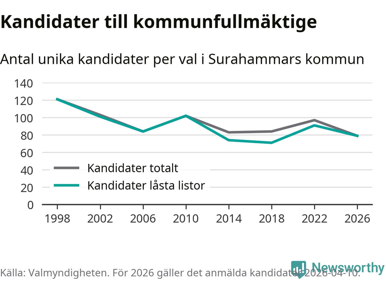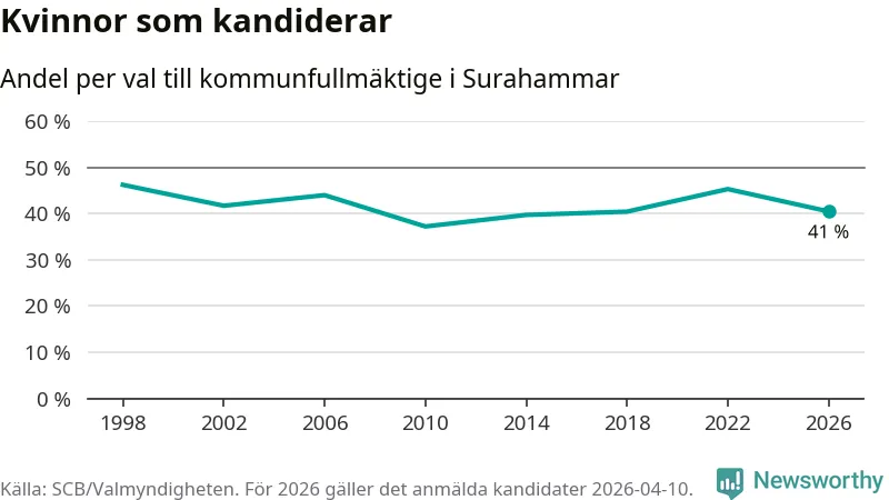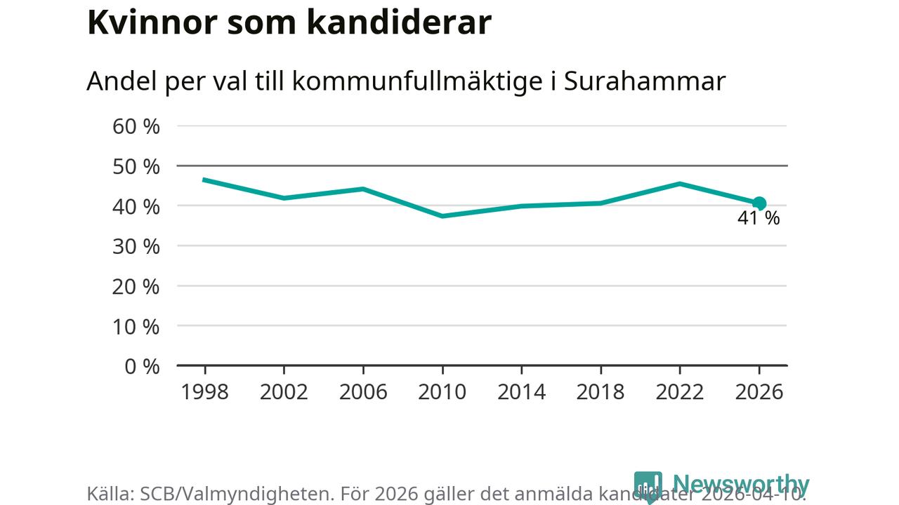 På torsdagen var det deadline för partier med låsta listor att registrera sina kandidater inför höstens val. Till valet till kommunfullmäktige i Surahammar är 79 kandidater anmälda på sådana listor, vilket är tolv färre än i valet 2022.