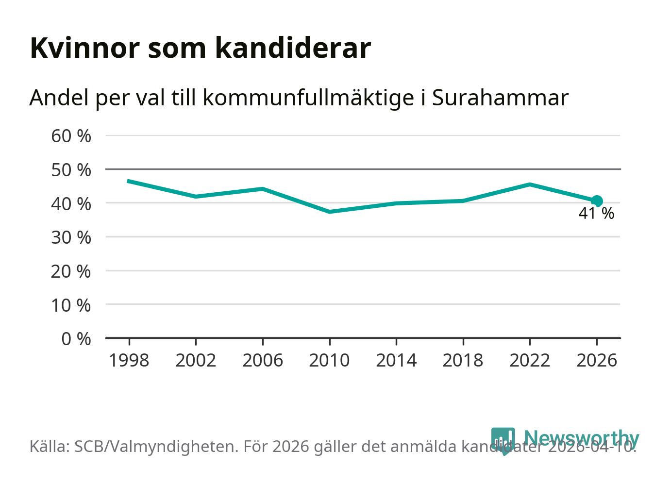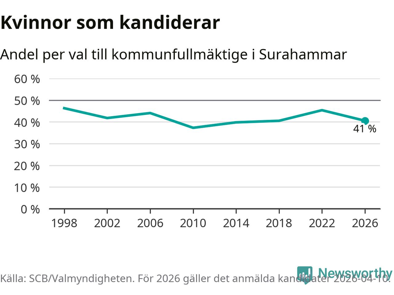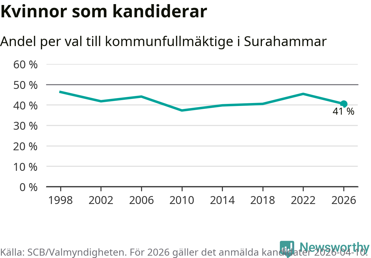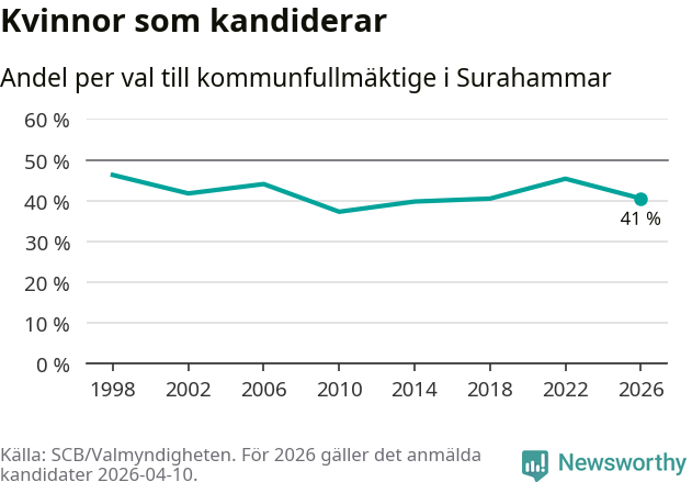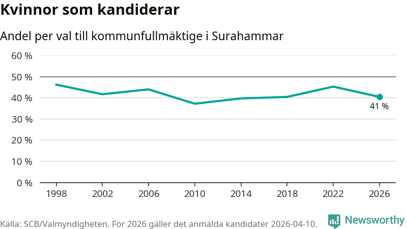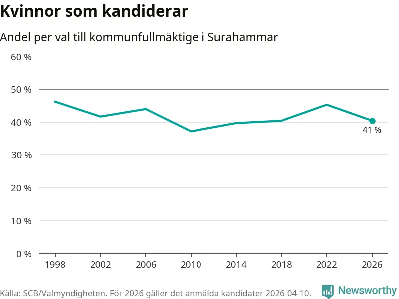 Kvinnorna utgör 41 procent av de hittills anmälda kandidaterna. Vid valet 1998 var 46 procent kvinnor, valet 2010 var motsvarande siffra 37 procent. Surahammar är en av 264 kommuner i landet där männen utgör en majoritet av kandidaterna på listorna.