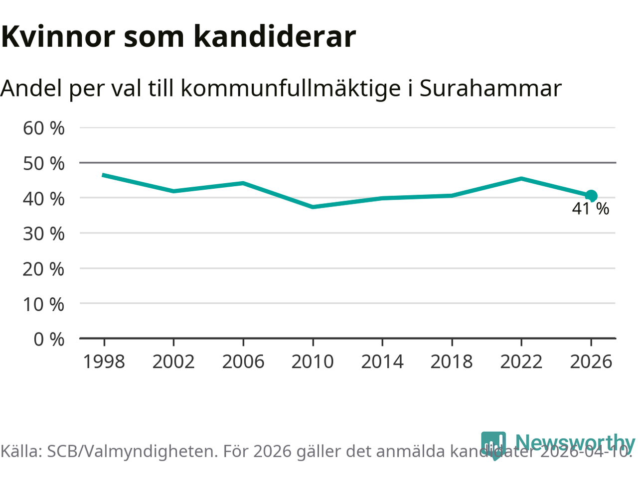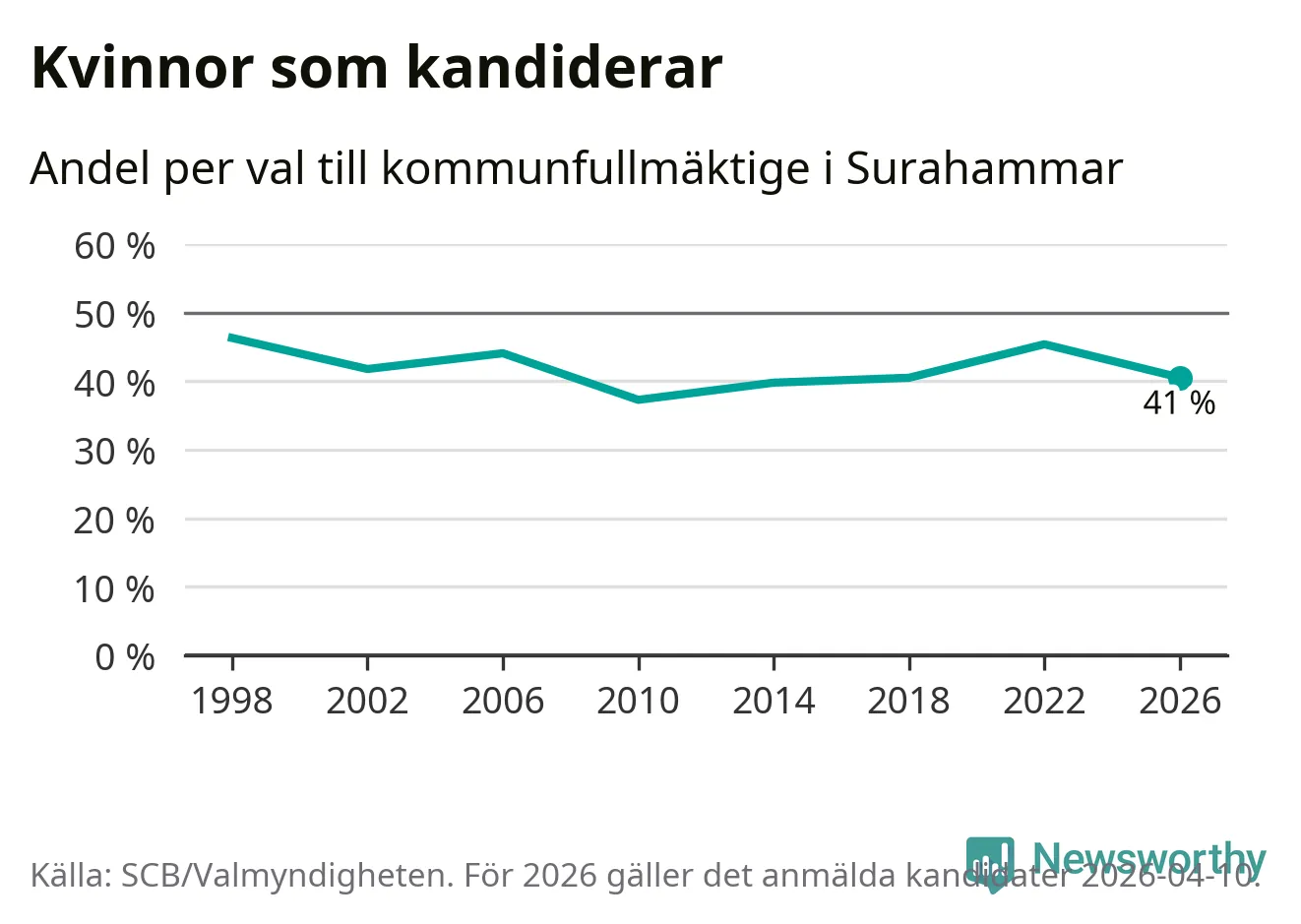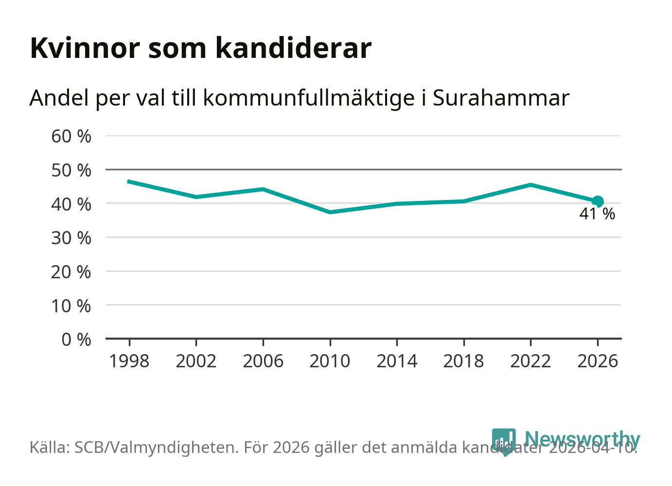 Kvinnorna utgör 41 procent av de hittills anmälda kandidaterna. Vid valet 1998 var 46 procent kvinnor, valet 2010 var motsvarande siffra 37 procent. Surahammar är en av 264 kommuner i landet där männen utgör en majoritet av kandidaterna på listorna.