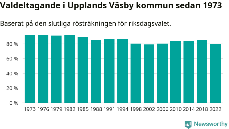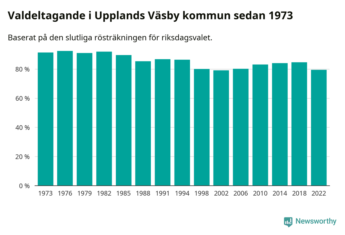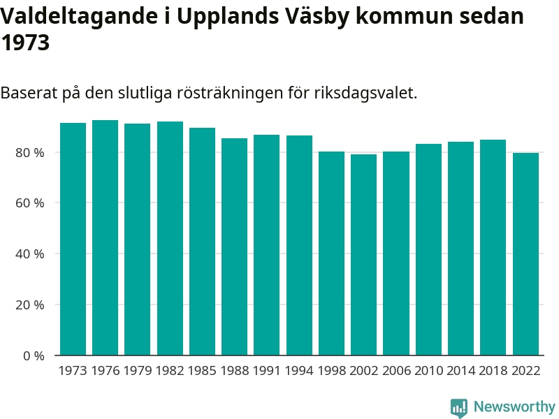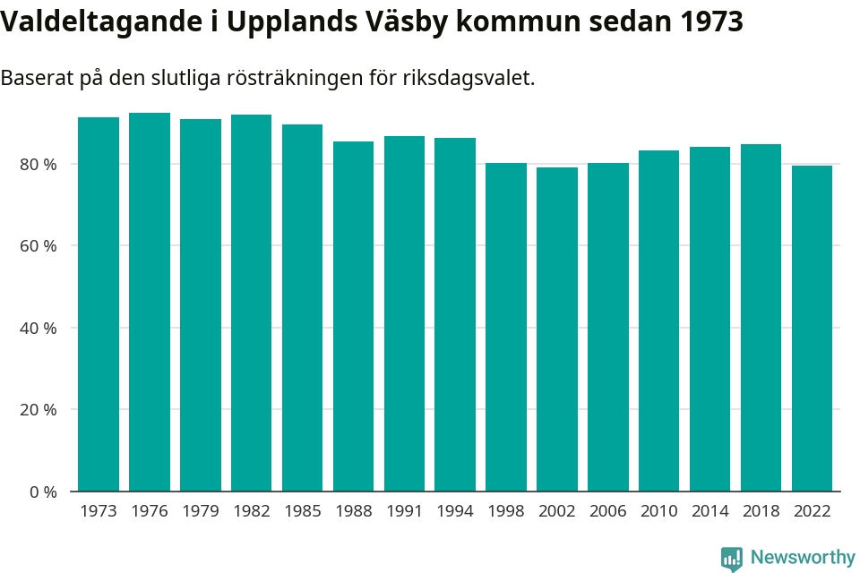 Upplands Väsby tillhör Stockholms läns valkrets. Där var valdeltagandet förra valet 82,5 procent. I hela riket landade valdeltagandet 2022 på 84,21 procent, att jämföra med 87,18 procent 2018.