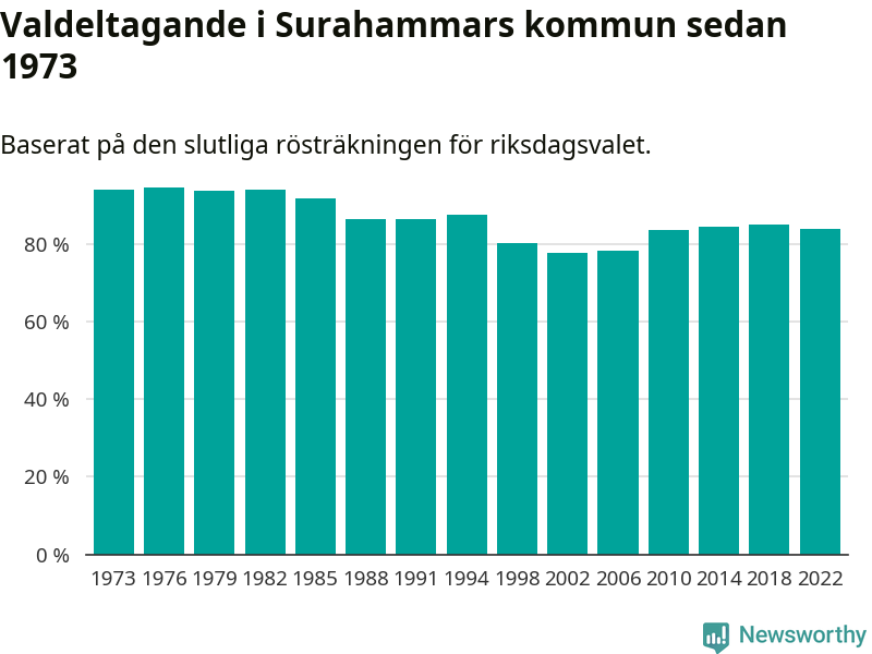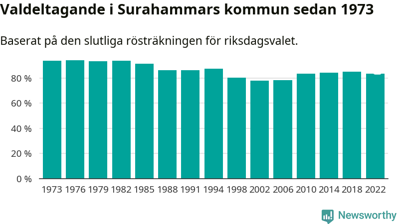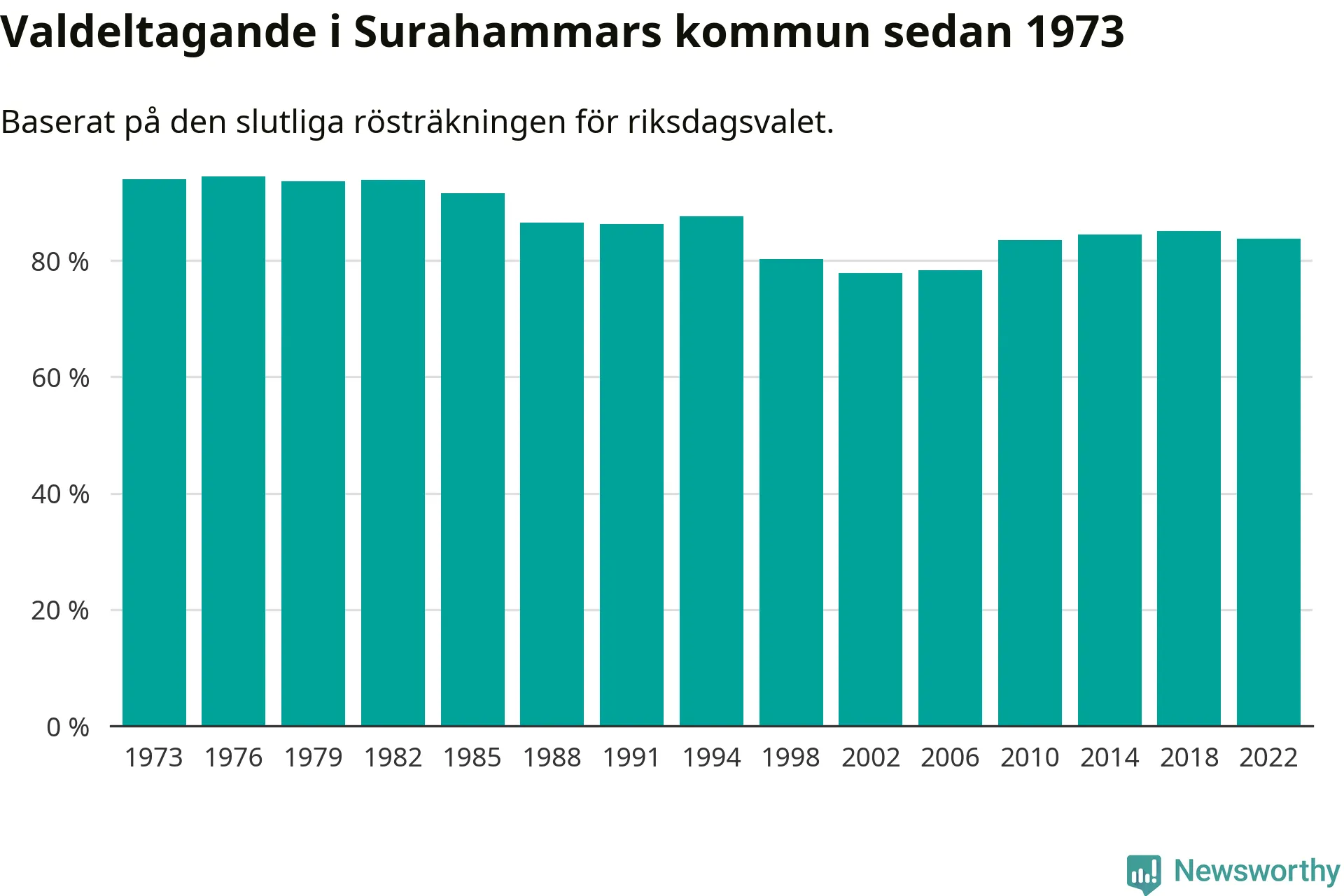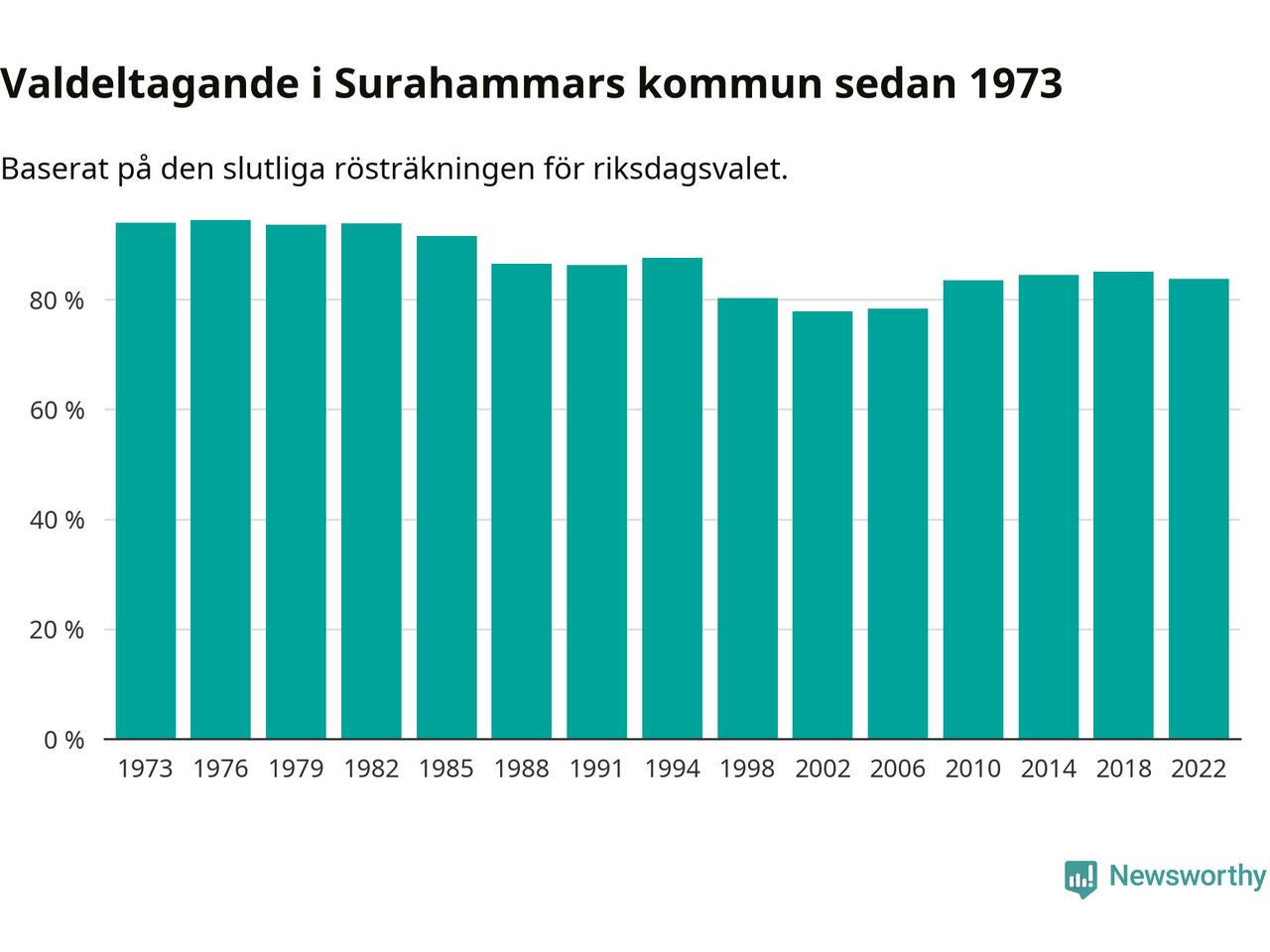 Högst valdeltagande i Västmanlands läns valkrets, som Surahammar tillhör, noterades i Sala kommun, där 85,8 procent röstade i riksdagsvalet. Lägst var valdeltagande i valkretsen i Fagersta kommun, 80,8 procent.
