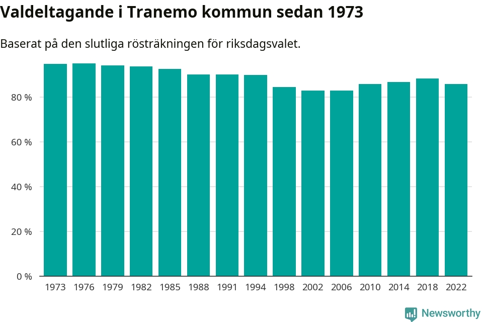 Tranemo hade det tredje lägsta valdeltagadet av alla kommuner i Västra Götalands läns södra valkrets under 2022. Allra lägst var det i Borås kommun, 82,4 procent, medan 89,1 procent röstade i Bollebygds kommun.