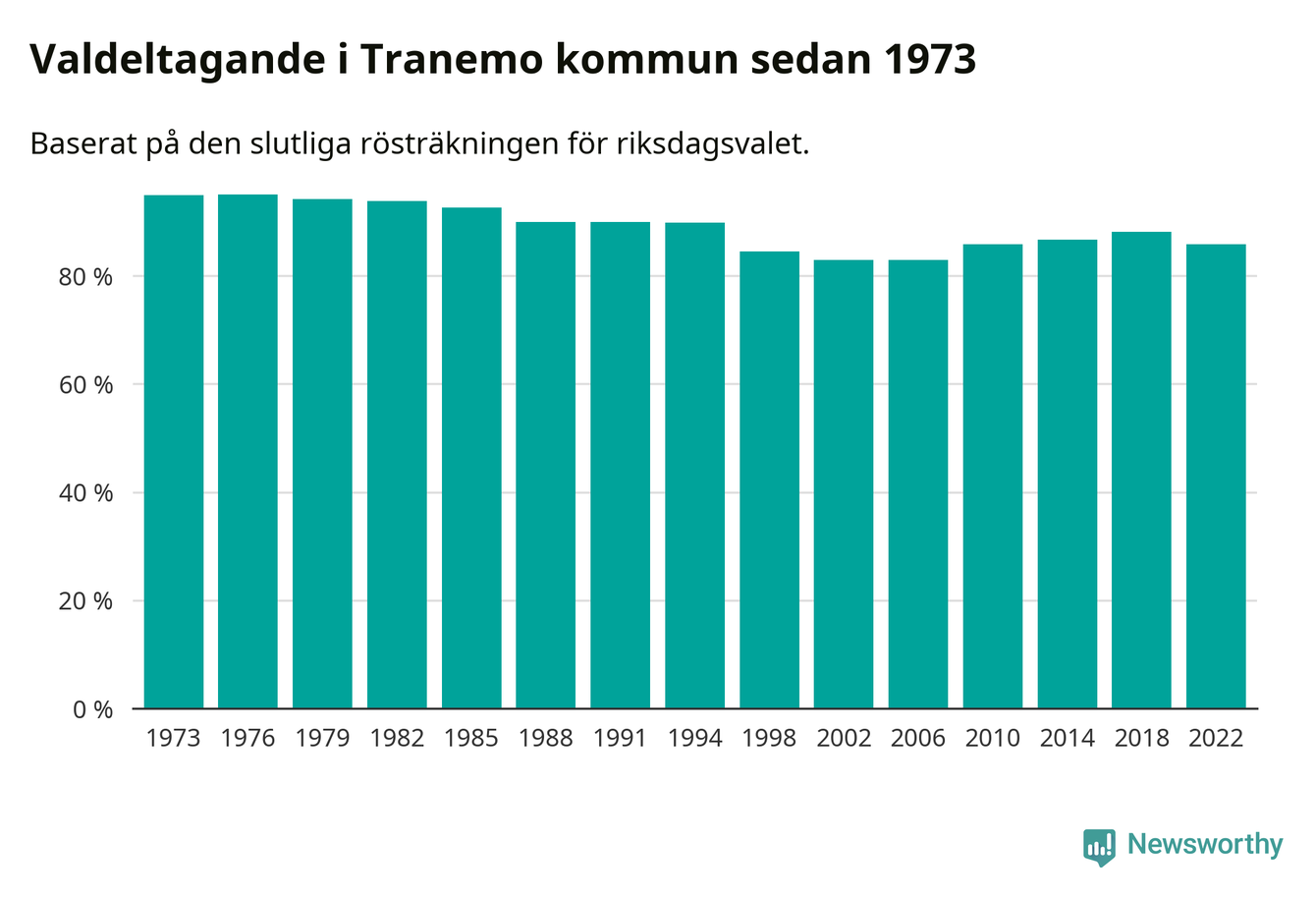Tranemo tillhör Västra Götalands läns södra valkrets. Där var valdeltagandet förra valet 84,4 procent. I hela riket landade valdeltagandet 2022 på 84,21 procent, att jämföra med 87,18 procent 2018.