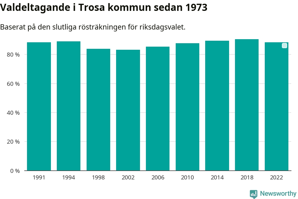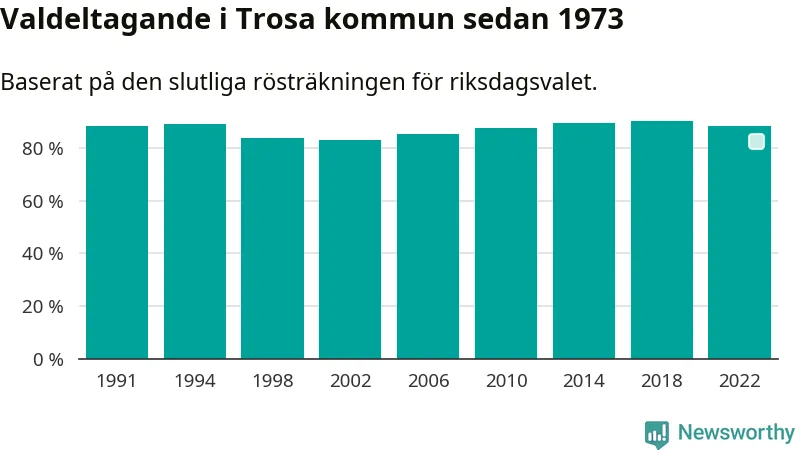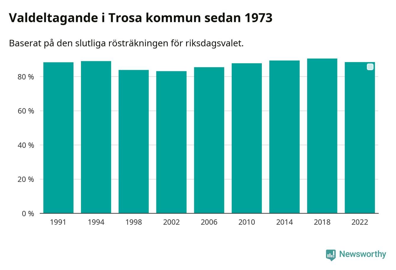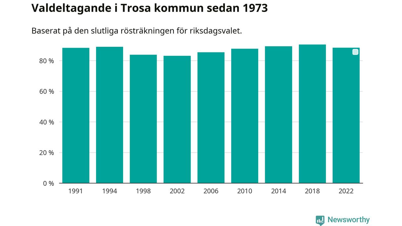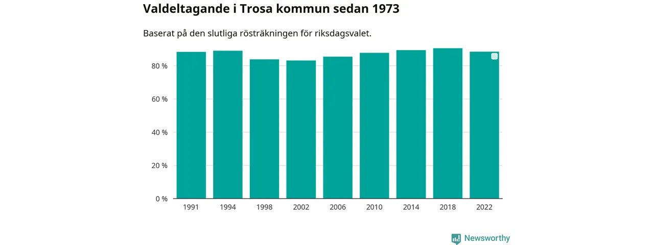 Trosa tillhör Södermanlands läns valkrets. Där var valdeltagandet förra valet 83,5 procent. I hela riket landade valdeltagandet 2022 på 84,21 procent, att jämföra med 87,18 procent 2018.